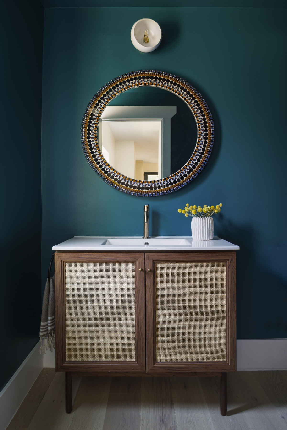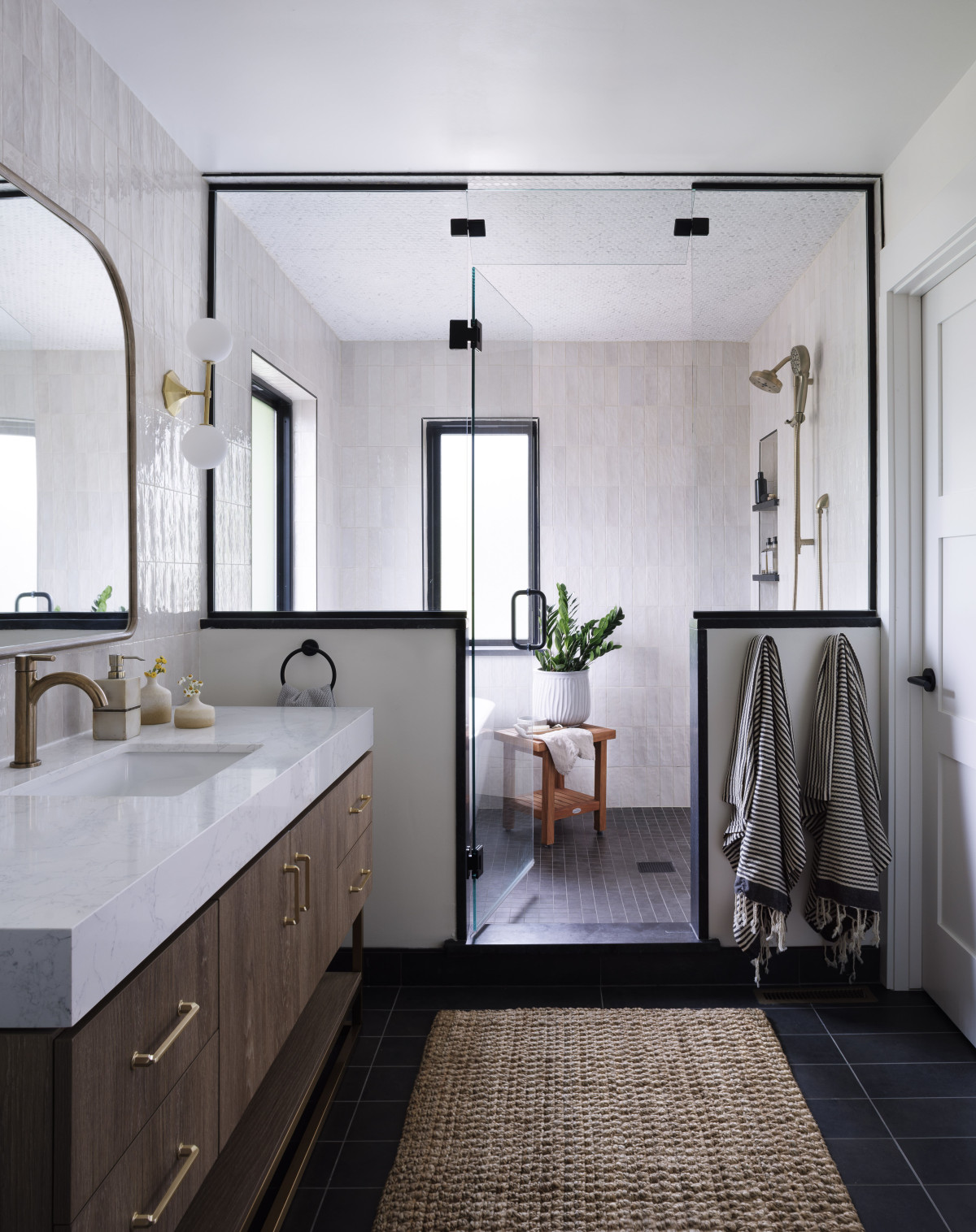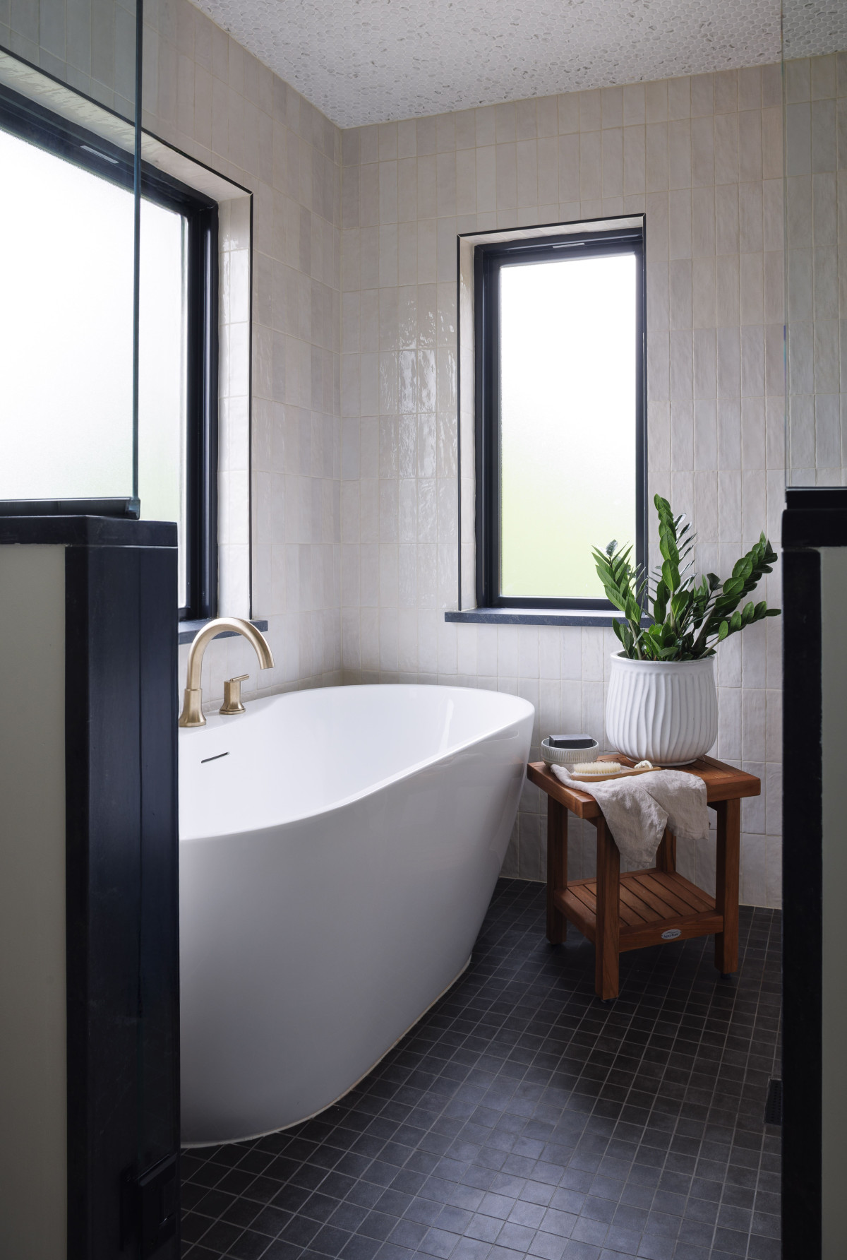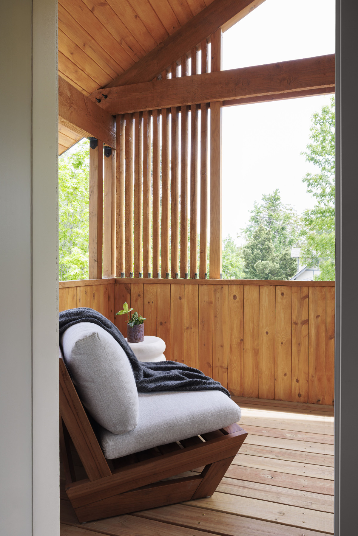 Na uwagę zasługuje również drewniana konstrukcja osłonowa balkonu z listwami nawiązującymi do japońskich słupów hashira. Taki układ listew pojawia się też w balustradzie schodów prowadzących z parteru na piętro. Zamiłowanie właścicieli do japońskiego designu było również inspiracją dla głównej łazienki w typie wet room – tu wanna znajduje się wewnątrz dużej strefy prysznicowej, w całości zamkniętej, co zapobiega wydostaniu się wody poza strefę mokrą.