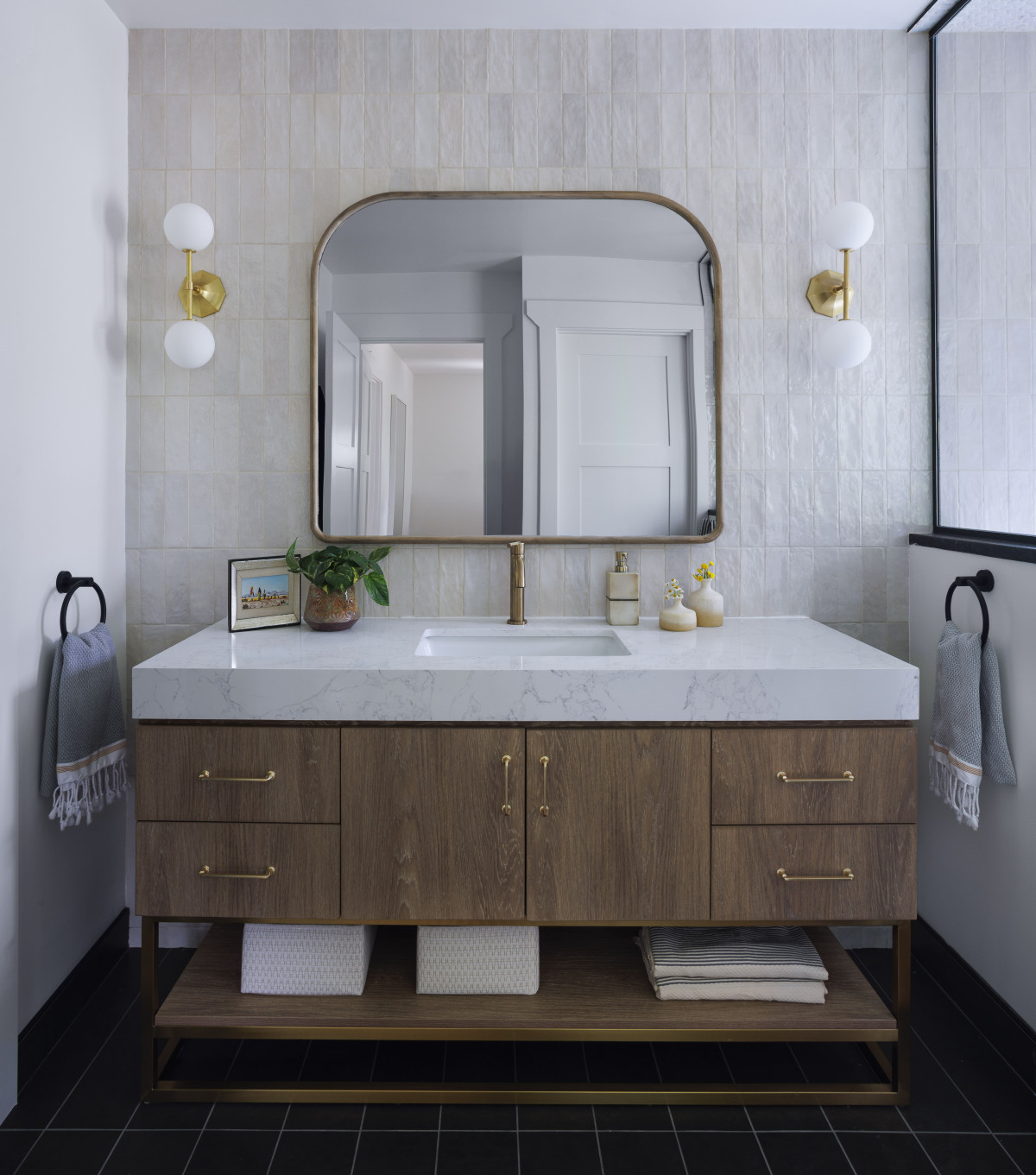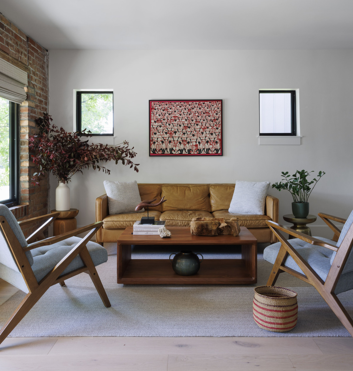 Wnętrza utrzymane są w stonowanej kolorystyce ze strategicznie rozmieszczonymi akcentami mocniejszego koloru. Przestrzeń wypełniają drewniane meble o prostej, minimalistycznej konstrukcji, a także miękkie tkaniny, które nadają wnętrzom ciepła i przytulności.