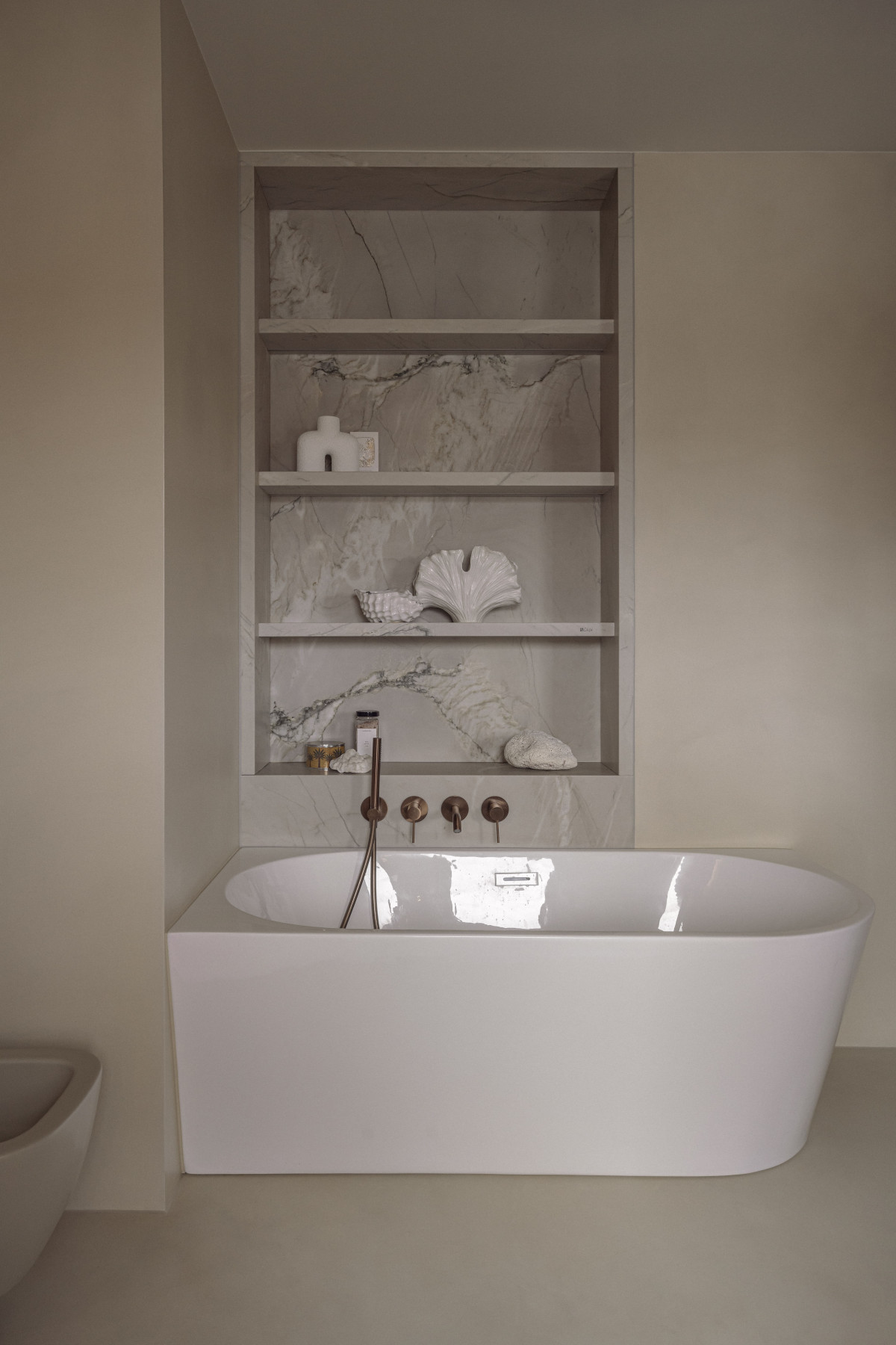 Głównym założeniem podczas projektowania łazienki było zintegrowanie wanny, prysznica, sauny, dwóch umywalek i bidetu. Mimo stosunkowo niewielkiej przestrzeni użytkowej, architektce udało się wkomponować w nią wszystkie niezbędne elementy, dbając jednocześnie o ergonomię użytkowania.