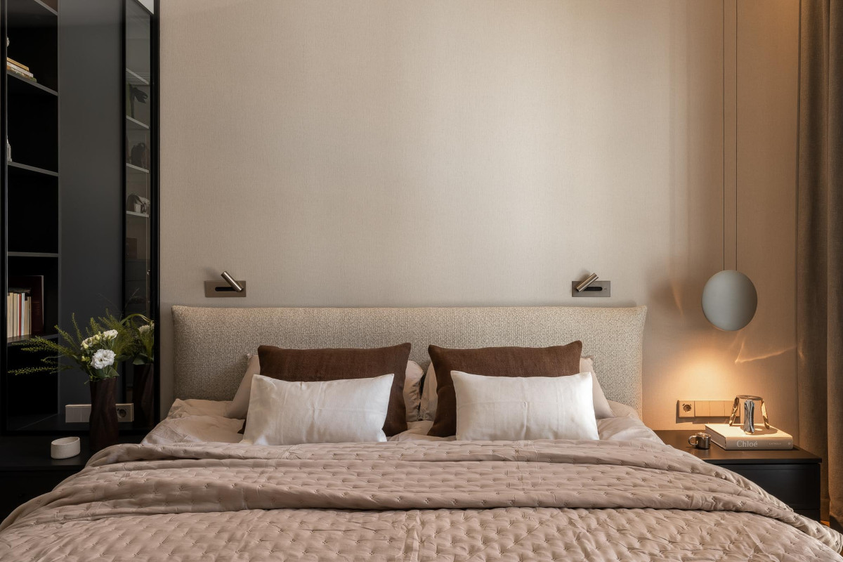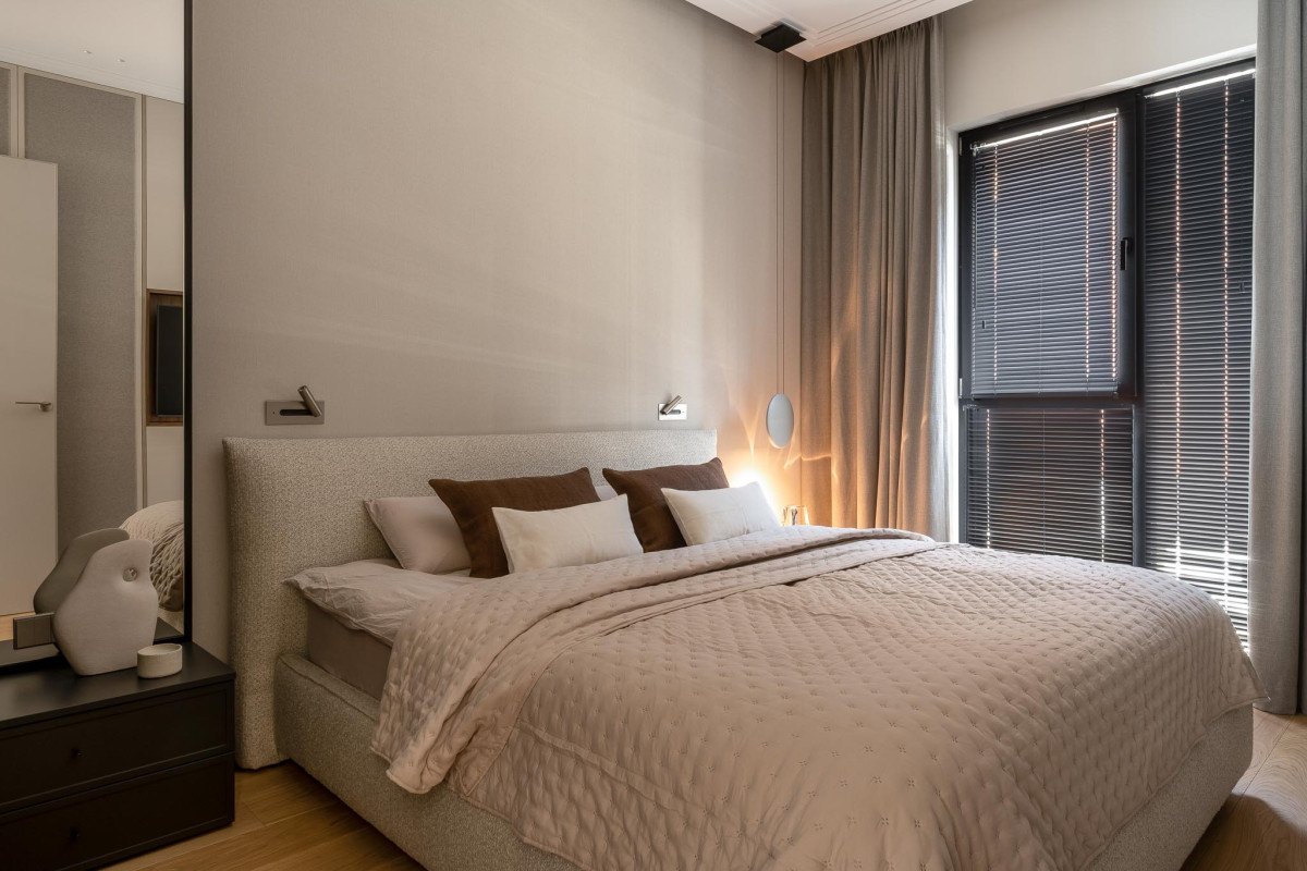 W głównej sypialni zwracają uwagę tapicerskie pokrycia ścian, łóżka i frontów zabudowy. Te ostatnie okazały się wyjątkowym wyzwaniem na linii projektantka – wykonawcy, ale były warte zachodu. – Zastosowałam tu technologię ze studiów nagraniowych. Dzięki niej udało się nam odizolować akustycznie od sąsiadów i wytłumić dźwięki z otoczenia – objaśnia Ania. Do tego wystarczy nacisnąć jeden przycisk, aby karnisz elektryczny zasłonił okno zasłoną typu blackout, wyłączył określone urządzenia w domu i zgasił w całym mieszkaniu światło. – Wysypiamy się tu doskonale – podkreśla architektka.