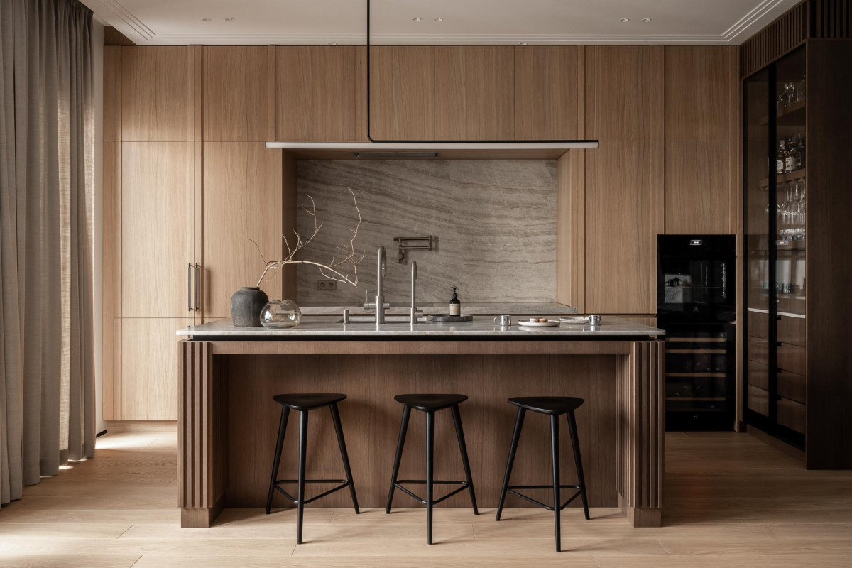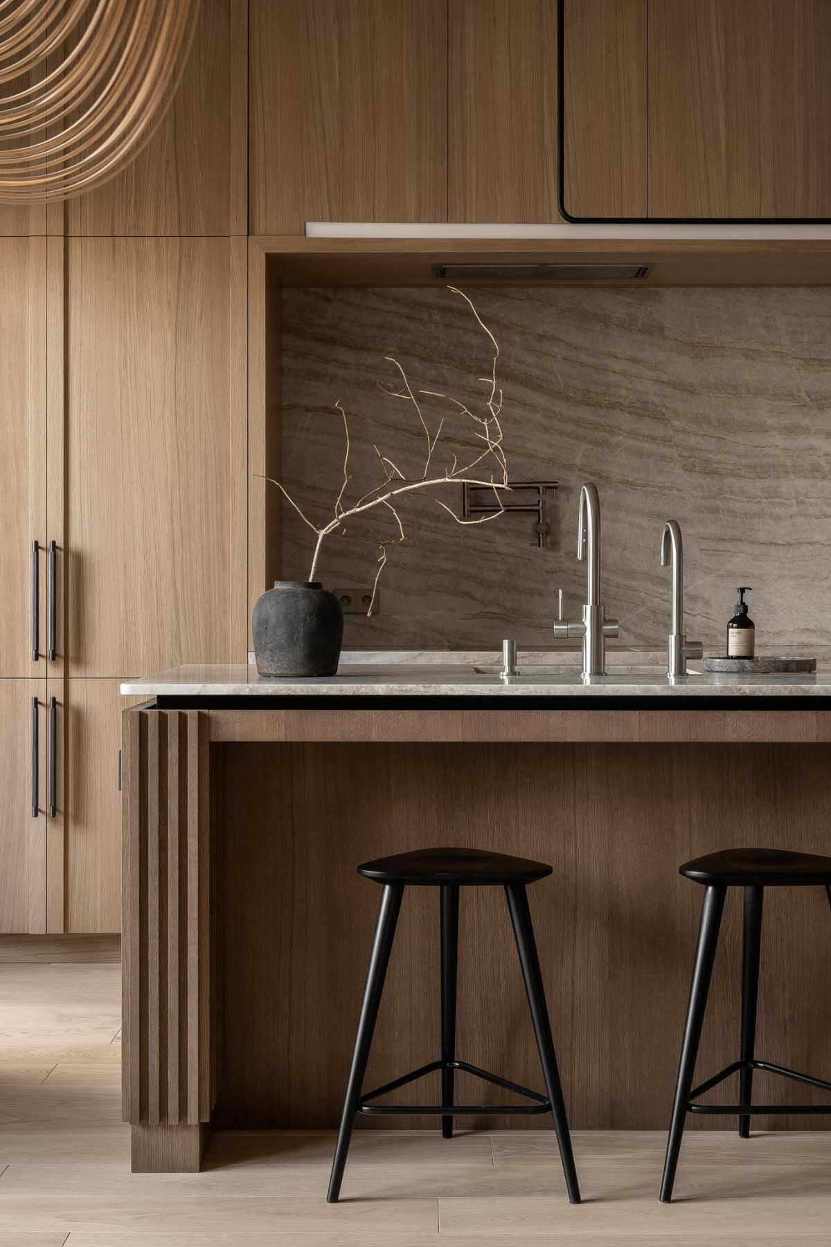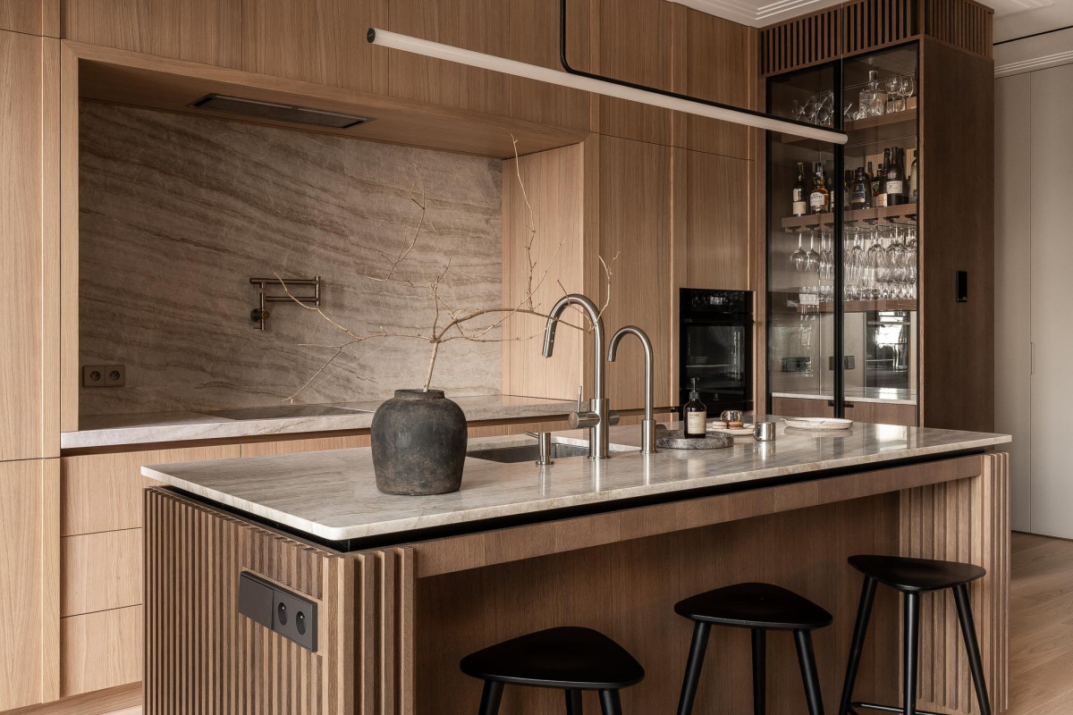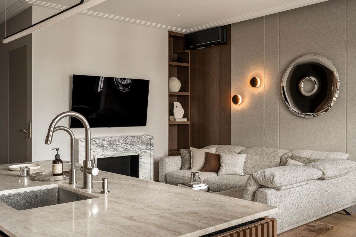 Choć mieszkanie jest bardzo atrakcyjne wizualnie, projektantce w tej samej mierze zależało praktycznym aspekcie wnętrz. Musiało być łatwe do utrzymania w czystości. Dlatego wybrała m.in. zlicowane ze ścianą listwy przypodłogowe ze spieku kwarcowego, odporne na uderzenia i szorowanie. A blat kuchenny zdecydowała się wykonać z ultrawytrzymałego kwarcytu Taj Mahal, który równocześnie w niszy nad blatem występuje w roli abstrakcyjnego obrazu. Ponadto tkaniny i tapety, choć tak miłe w dotyku, są zabezpieczone przed przyjmowaniem plam, a drewno pokryte trwałymi lakierami.