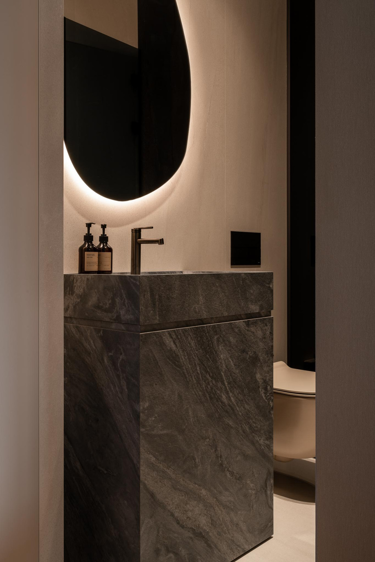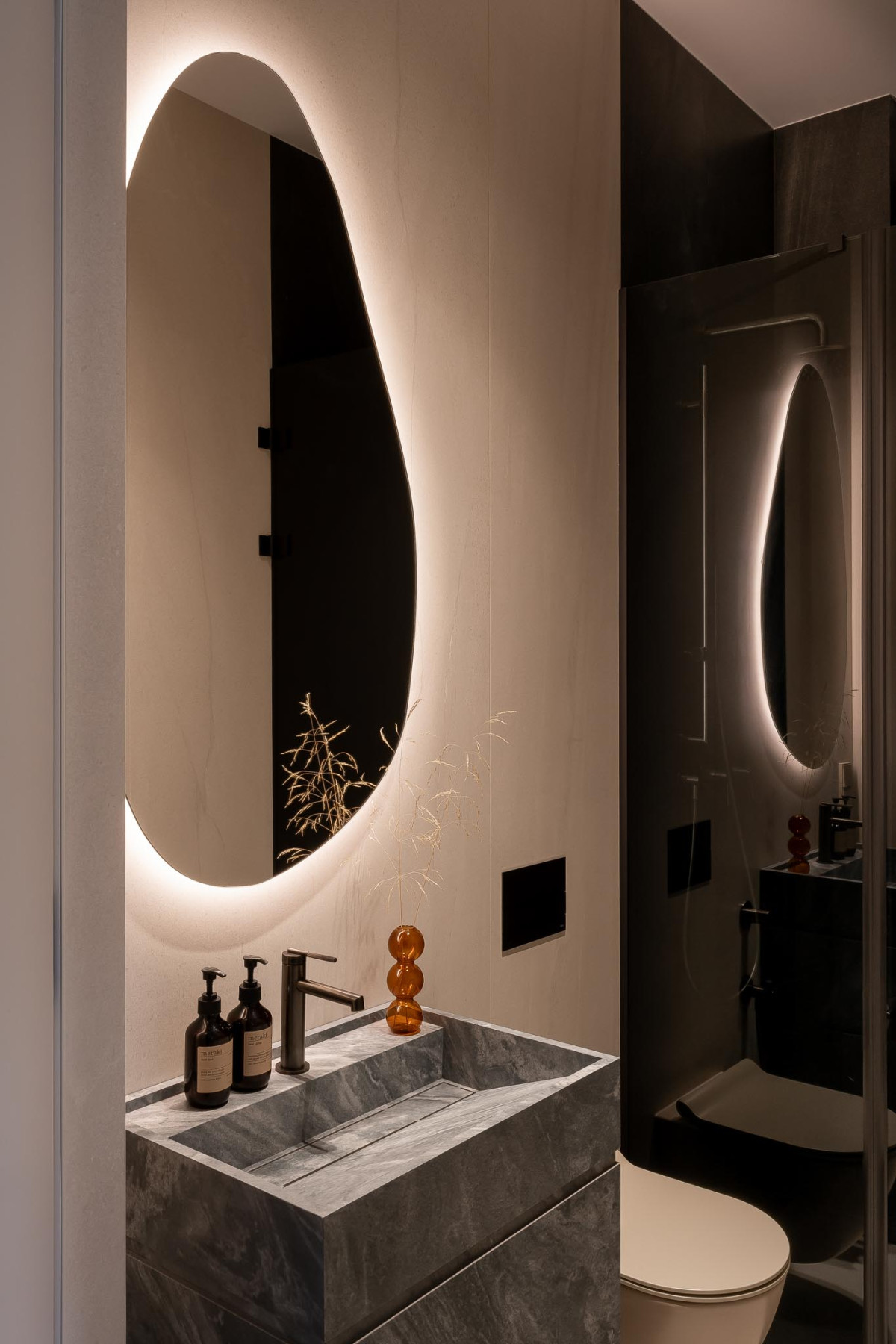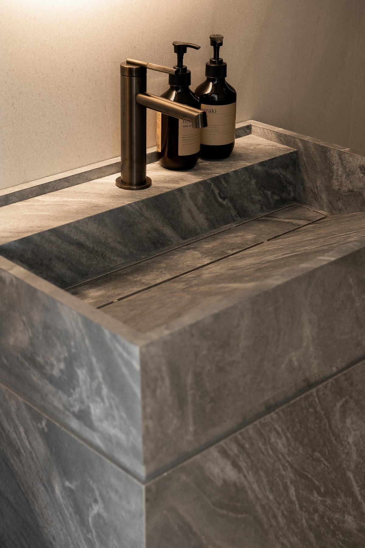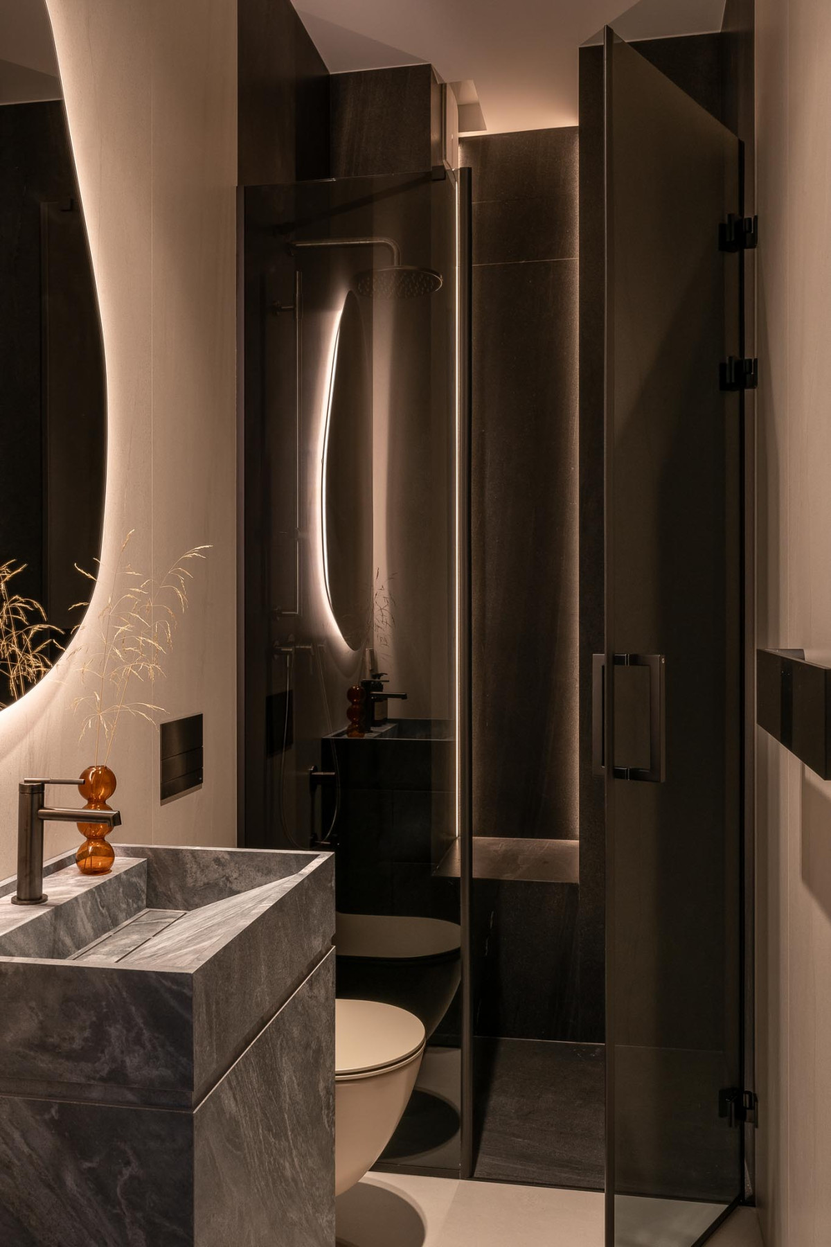 Mniejsza łazienka służy przede wszystkim gościom. Znalazła się tu wolnostojąca umywalka ze spieku. Kamieniarz na zamówienie dorobił do niej cokół z tego samego materiału. Choć wydaje się monolitem, ma uchylny front. Dyskretna jest też strefa prysznica, zanurzona w głębokiej czerni i zamknięta drzwiami z dymnego szkła.