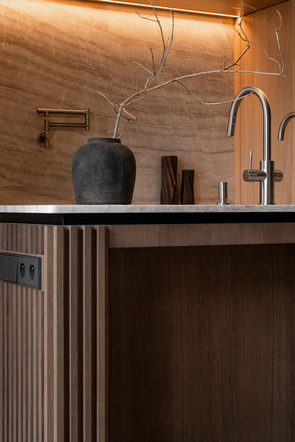 Drewno nadaje charakter kuchni. Szlachetna zabudowa fornirowana dębem poddana jest naczelnej zasadzie ergonomii, kryje w sobie także zaawansowane rozwiązania techniczne. Podświetlane szuflady otwierają się i zamykają lekko dzięki mechanizmom elektrycznym. A za sprawą odpowiednich urządzeń z kranu płynie nie tylko gorąca woda, idealna np. do zaparzenia herbaty, ale też zimna woda gazowana. – Dokonujemy rozważnych zakupów, bardzo szanujemy jedzenie, nie kumulujemy plastiku. Od roku nie kupiliśmy ani jednej butelki z wodą – mówi ze słuszną dumą gospodyni.
