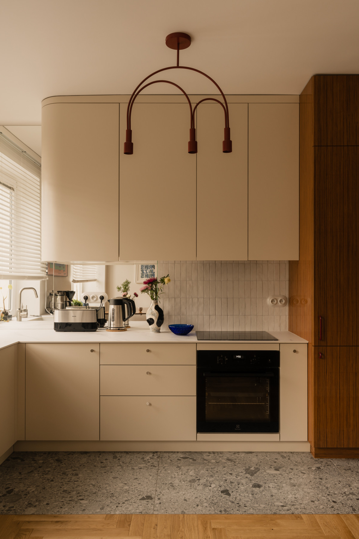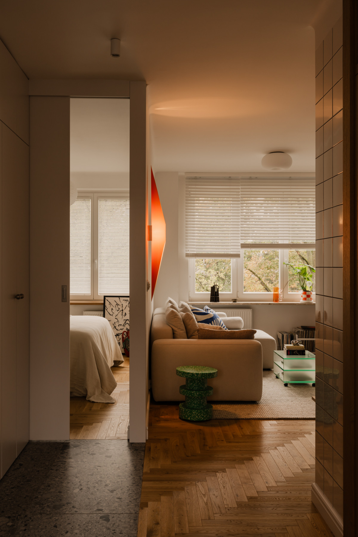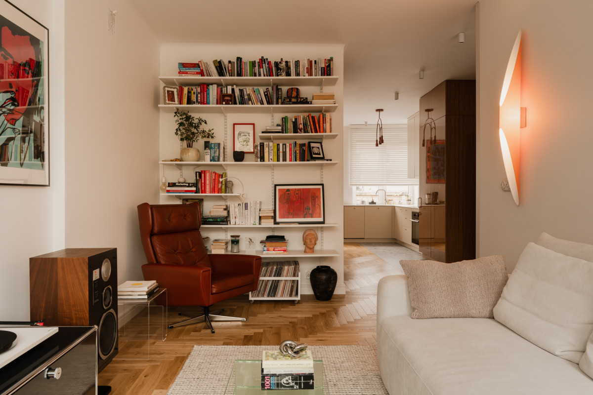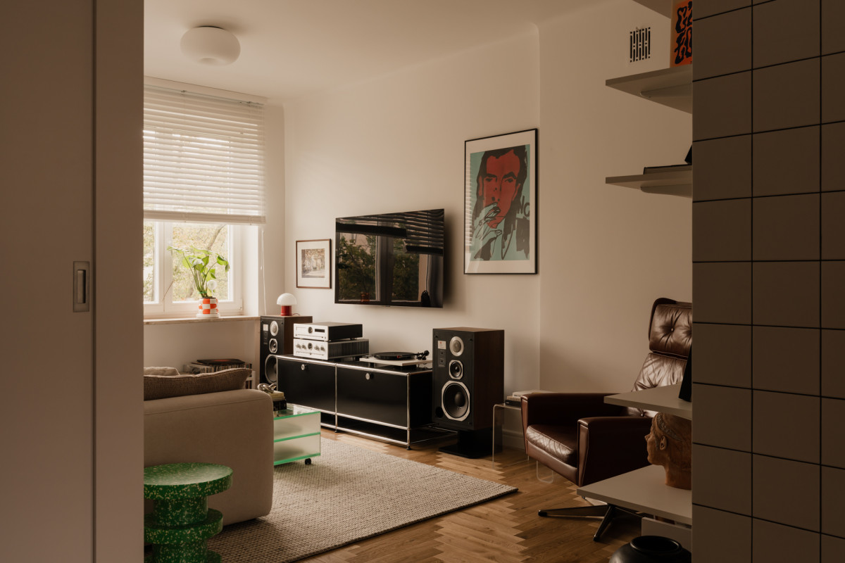 Mimo estetycznego wyczucia i obecności wysokiej klasy designu, mokotowskie wnętrze nie chce imponować. Jest raczej miejscem, w którym ma się dobrze i wygodnie żyć. Atmosferę domowego ciepła tworzą tu m.in. materiały, faktury, światło i muzyka płynąca z gramofonu. Retro detale, jak ceramiczne włączniki, współgrają z nowoczesnymi akcentami, a poszczególne przedmioty i dekoracje snują nowe historie oraz przywołują cenne wspomnienia.