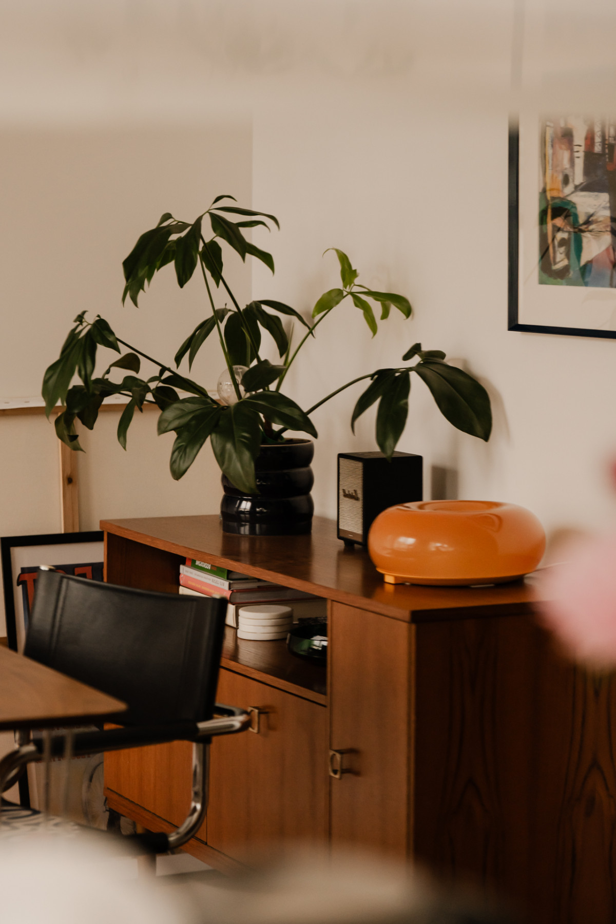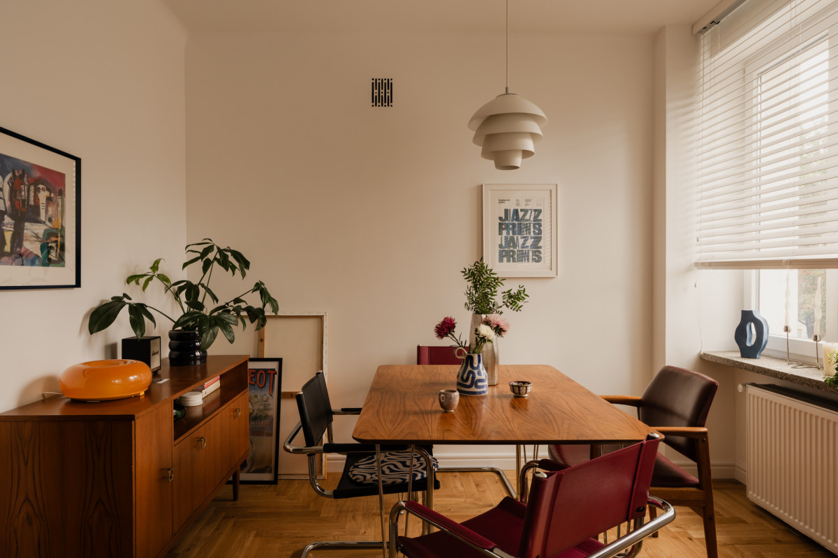 Styl wnętrz to mieszanka tego, co właściciele kochają najbardziej – modernistycznego vintage’u, unikalnych dodatków i naturalnych materiałów. Wśród mebli znalazły się perełki europejskiego designu: duński fotel Georga Thamsa z lat 60., włoskie lampy z lat 90. (m.in. Shakti by Clerici), szwedzki stół z lat 70., czy szwajcarski klasyk – komoda USM.