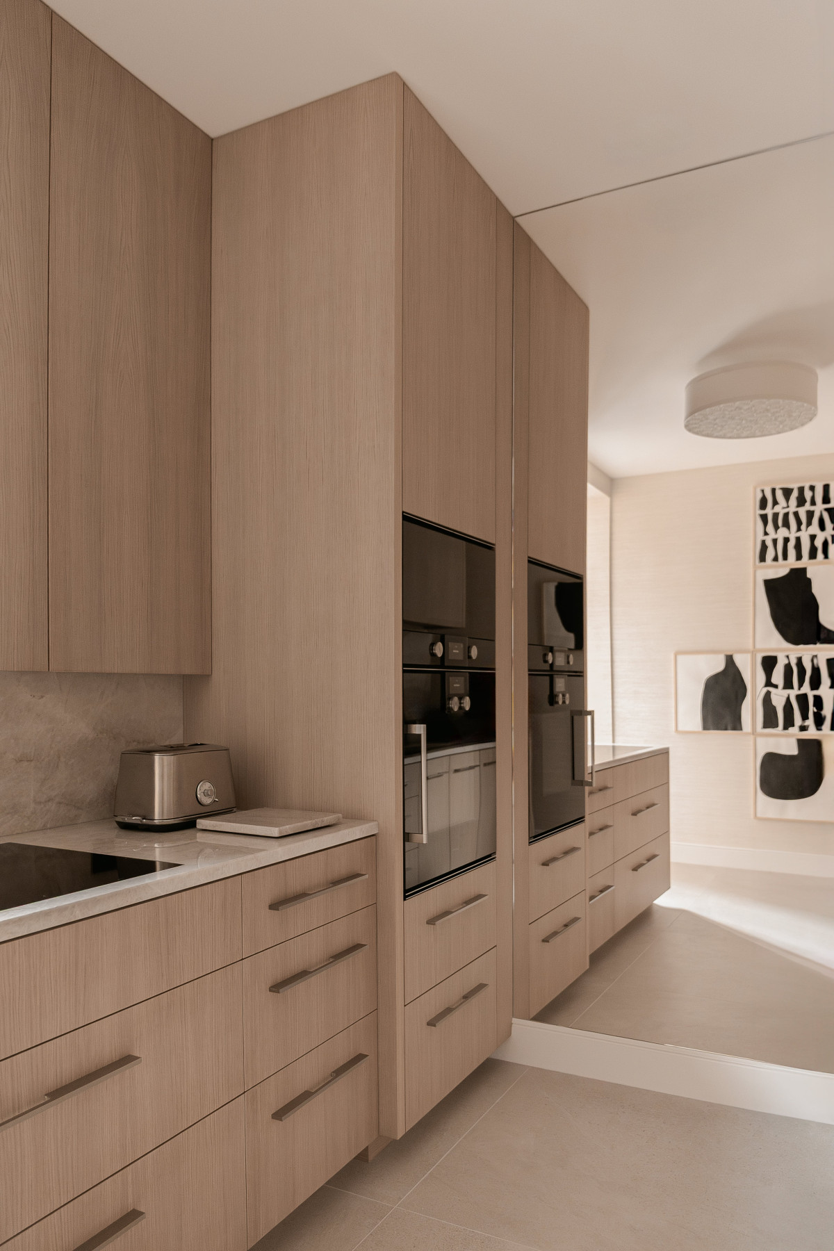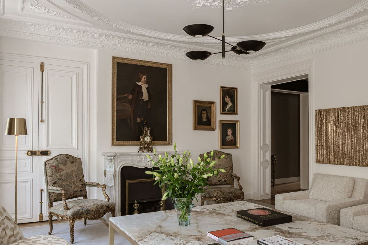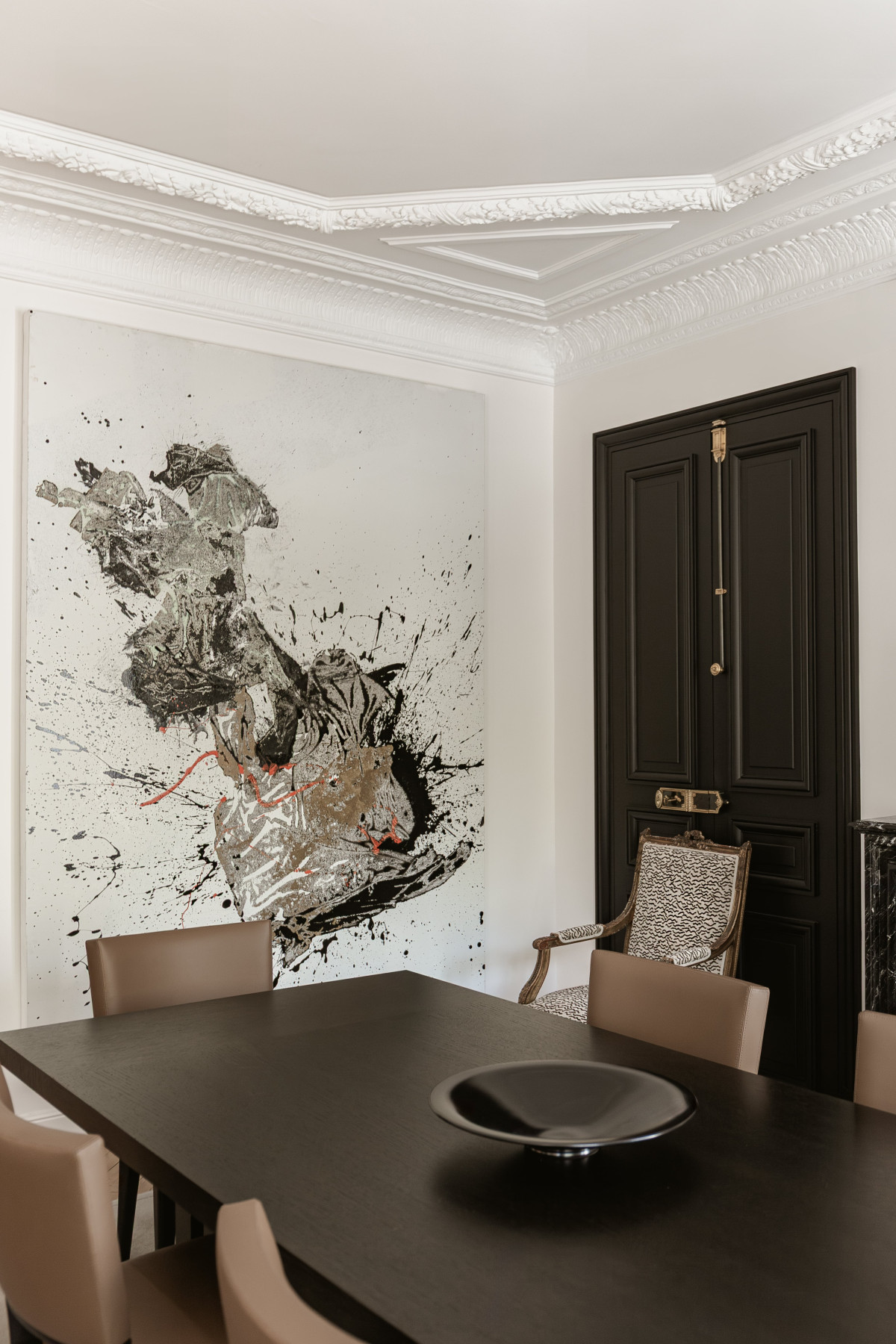 W mieszkaniu dominuje neutralna kolorystyka z chłodnymi i ciepłymi tonami (beże, szarości, taupe), tworzącymi spokojne tło dla dzieł sztuki – zarówno klasycznych portretów, współczesnych abstrakcji i rzeźb, które projektant wyeksponował na stylowych kamiennych podestach. Wyjątkiem jest łazienka dla gości, której ściany wyłożono tapetą inspirowaną XIX-wiecznymi francuskimi pejzażami.