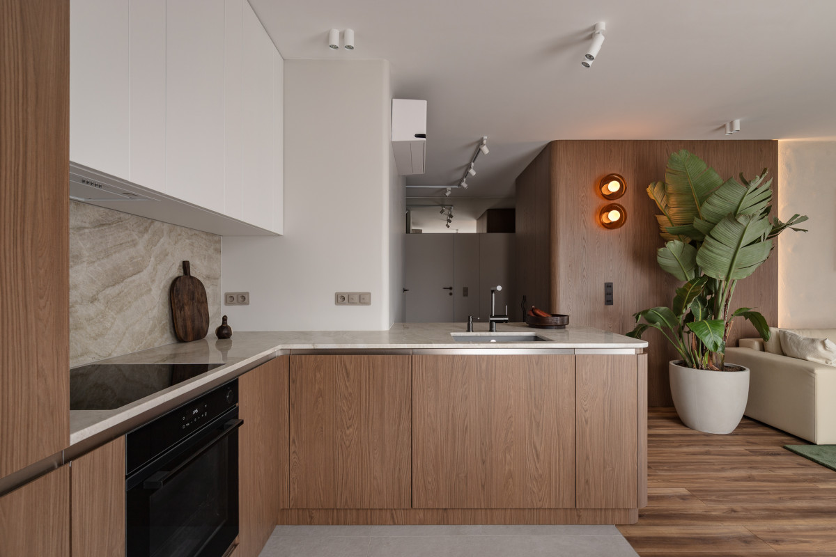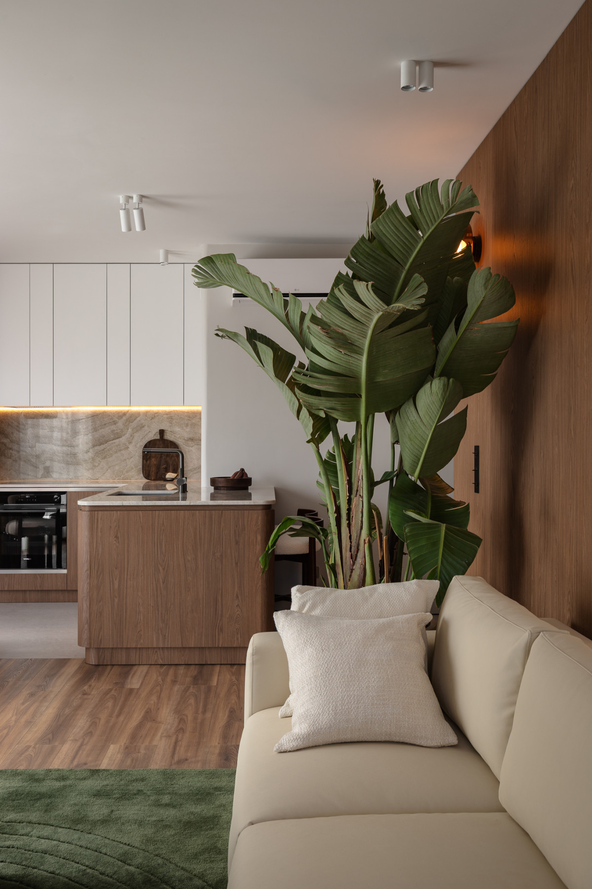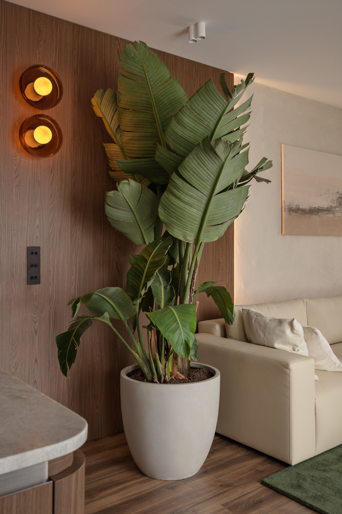 Dla architekta największym przełomem była nie zabudowa, kamień w kuchni czy zmiana kolorystyki, ale rośliny. Duże, pełne energii okazy potraktowane zostały jako rzeźby. Soczyście zielone liście wprowadziły do wnętrz życie i dodały naturalnego ciężaru tam, gdzie wcześniej wszystko było płaskie czy pozbawione charakteru. Zieleń przełamała sterylność wcześniejszych wyborów i nadała całej przestrzeni miękkości, którą trudno byłoby uzyskać za pomocą mebli.