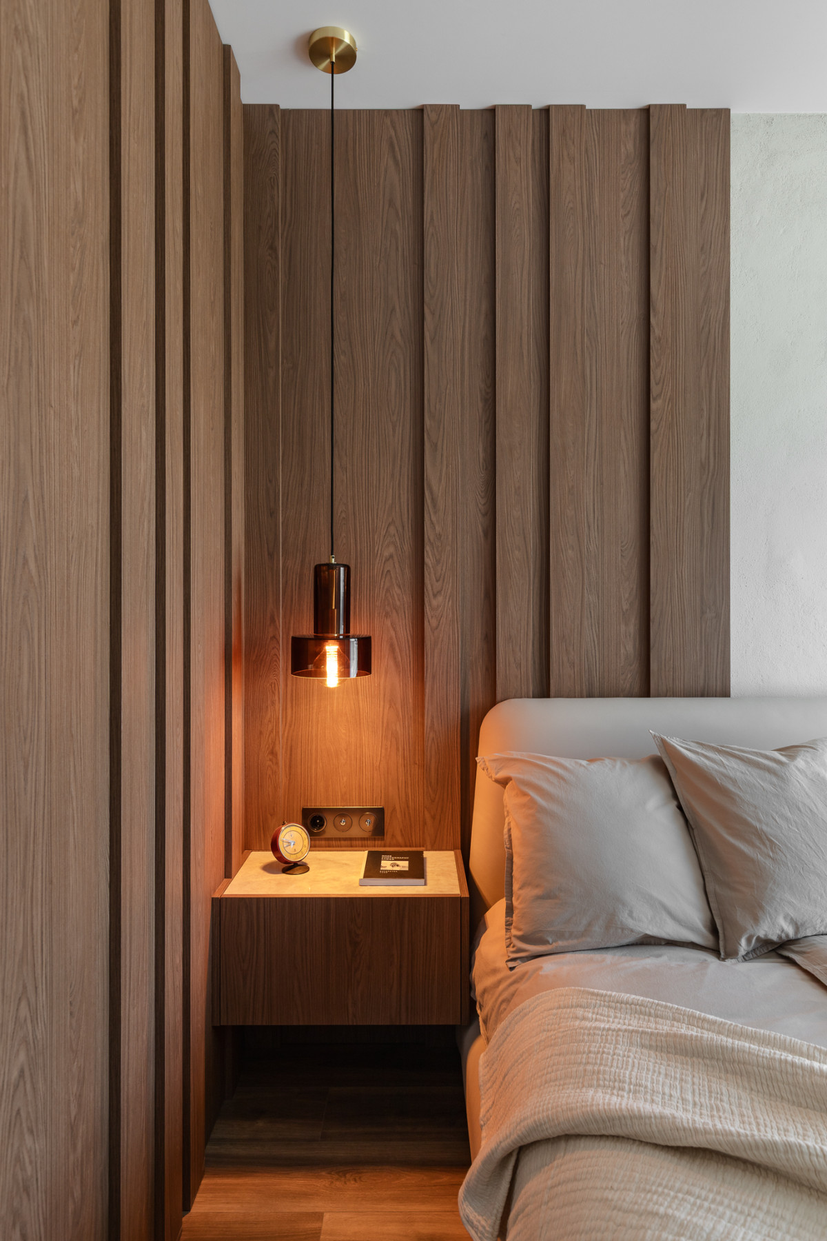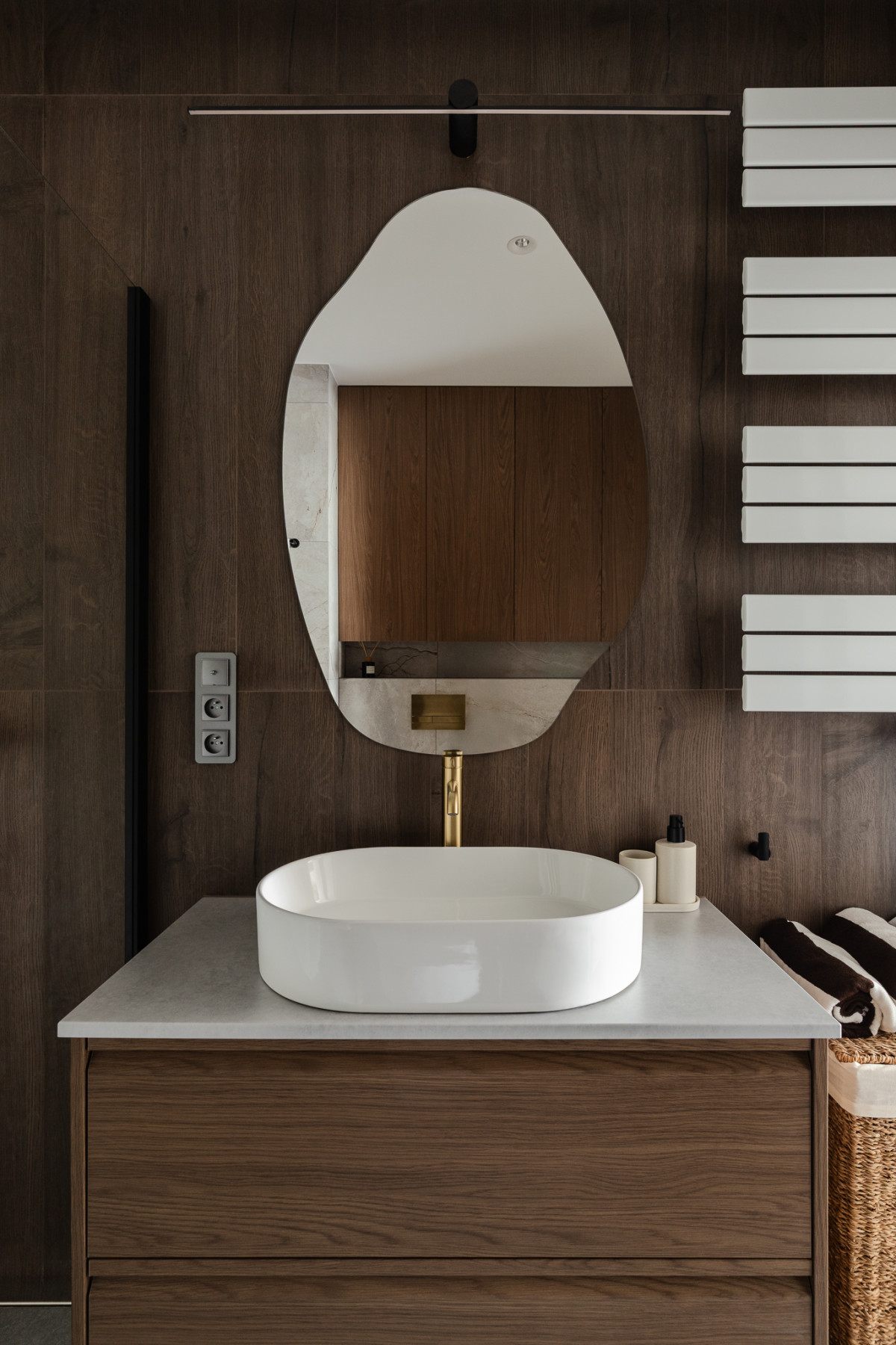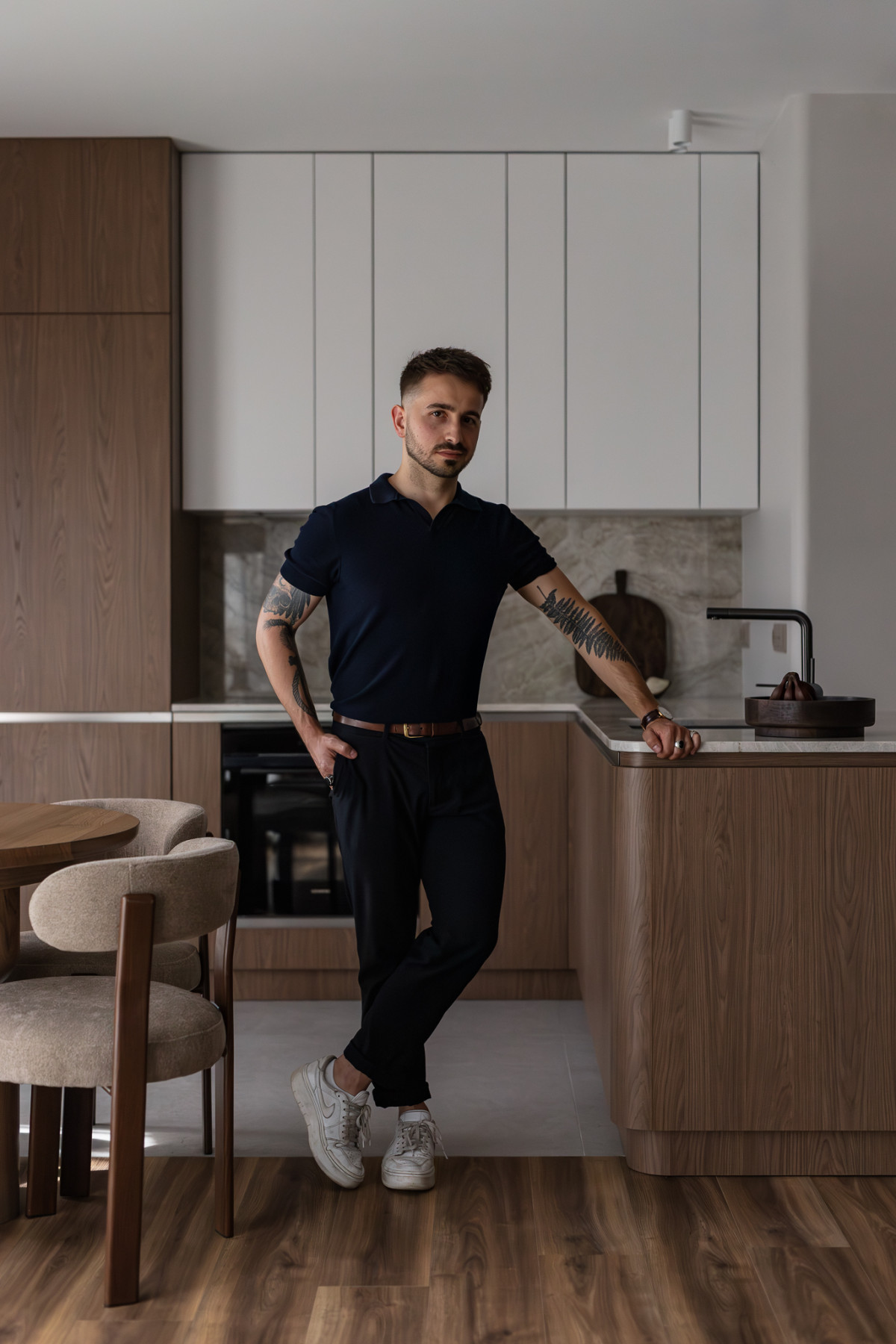 Jak wspomina Tomasz Polański, całość zaczęła działać, gdy wprowadzono do wnętrz ciepłe drewno, neutralne ściany o fakturze, która pracuje ze światłem, zaokrąglone krawędzie kamienia, wyciszone oświetlenie, które buduje nastrój. Korytarz przestał być przypadkowym przejściem, a stał się przedłużeniem salonu. Gabinet zyskał spokój i czytelność, bo wreszcie przestał być „dodatkowym pokojem”, a zaczął być przemyślaną przestrzenią do pracy. Sypialnia zamiast katalogowego chaosu stała się królestwem wyciszenia i relaksu.