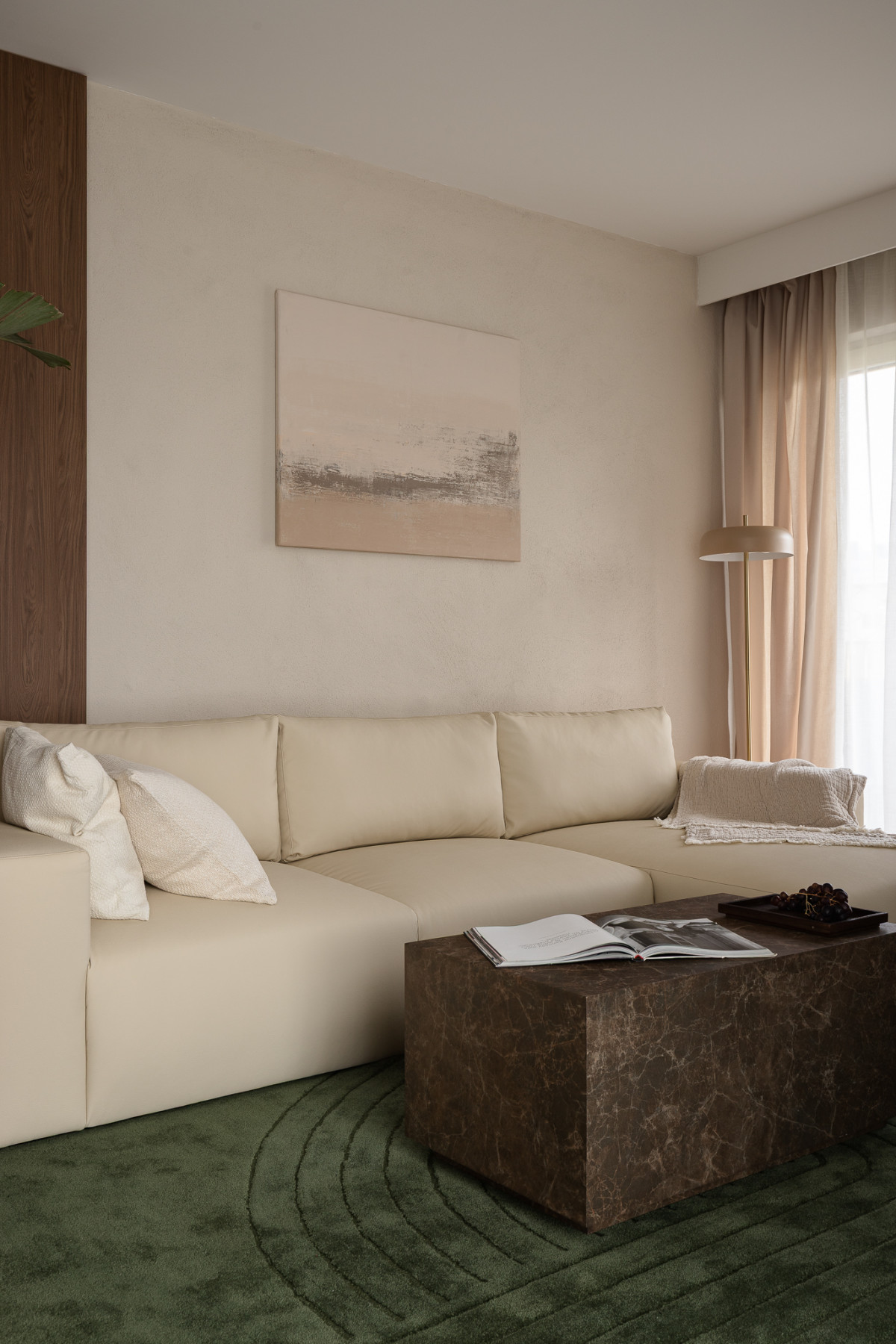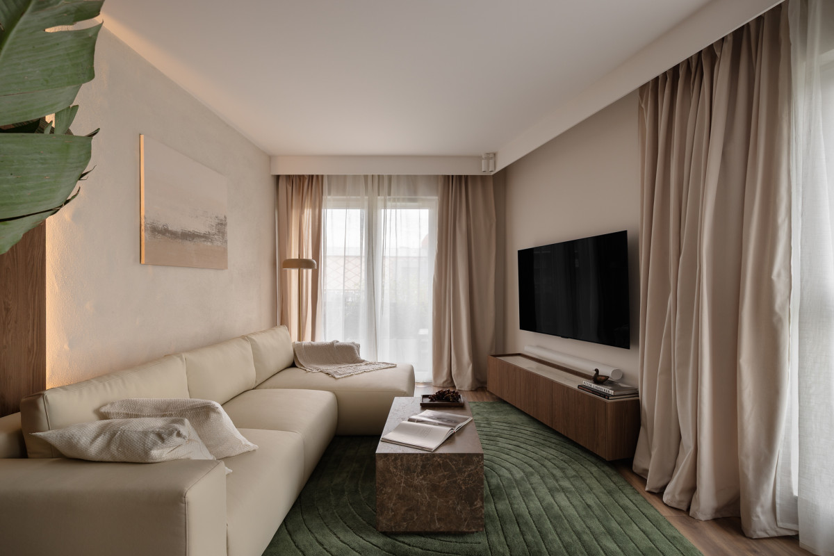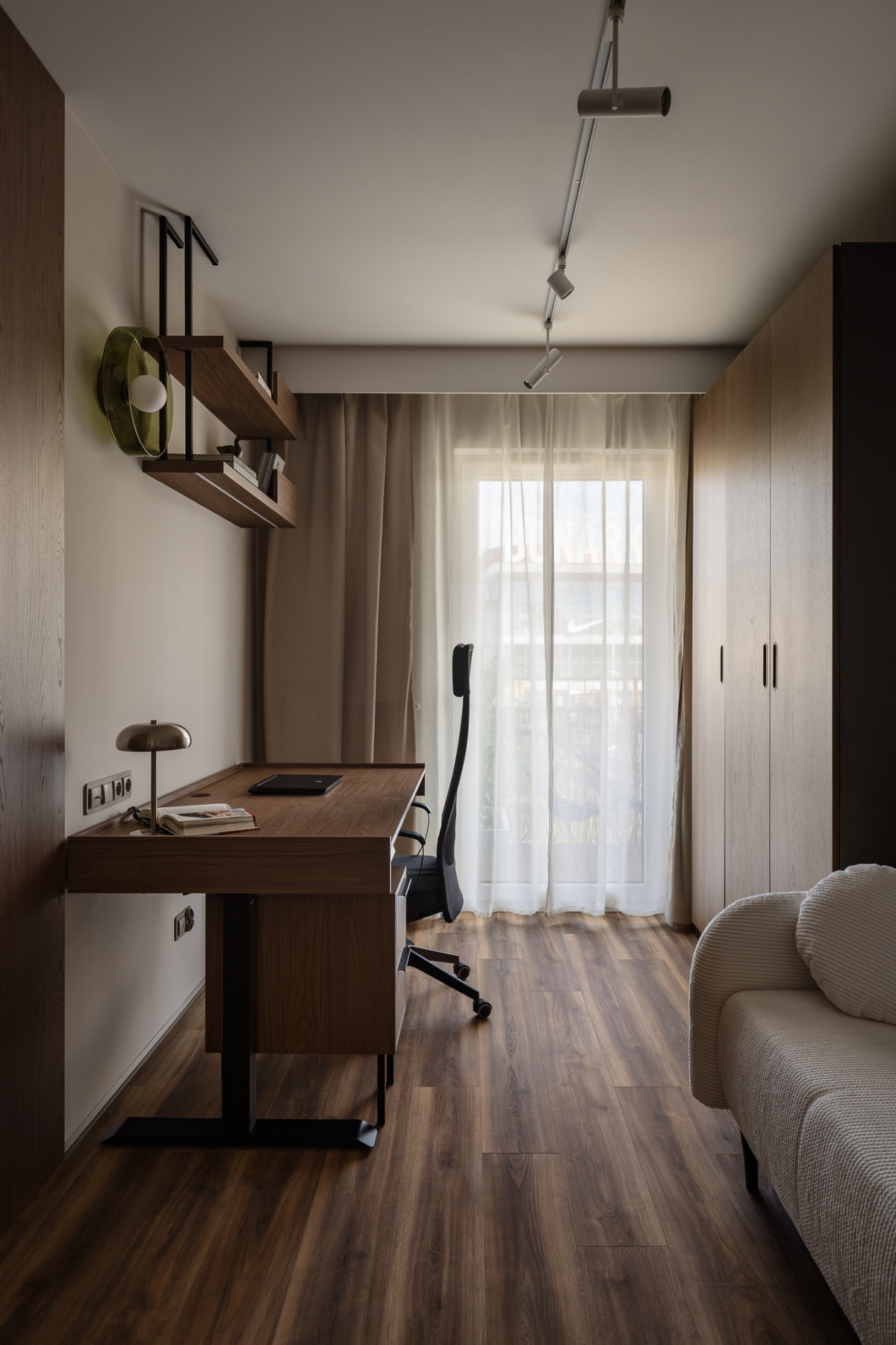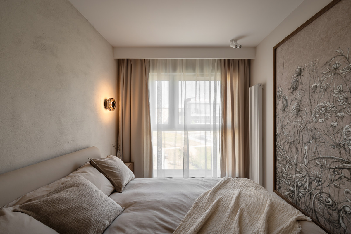 Jak wspomina Tomasz Polański, całość zaczęła działać, gdy wprowadzono do wnętrz ciepłe drewno, neutralne ściany o fakturze, która pracuje ze światłem, zaokrąglone krawędzie kamienia, wyciszone oświetlenie, które buduje nastrój. Korytarz przestał być przypadkowym przejściem, a stał się przedłużeniem salonu. Gabinet zyskał spokój i czytelność, bo wreszcie przestał być „dodatkowym pokojem”, a zaczął być przemyślaną przestrzenią do pracy. Sypialnia zamiast katalogowego chaosu stała się królestwem wyciszenia i relaksu.