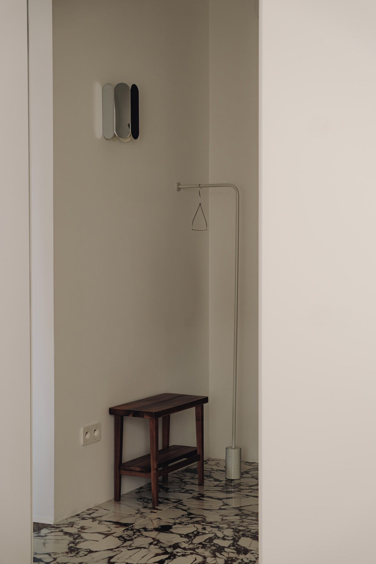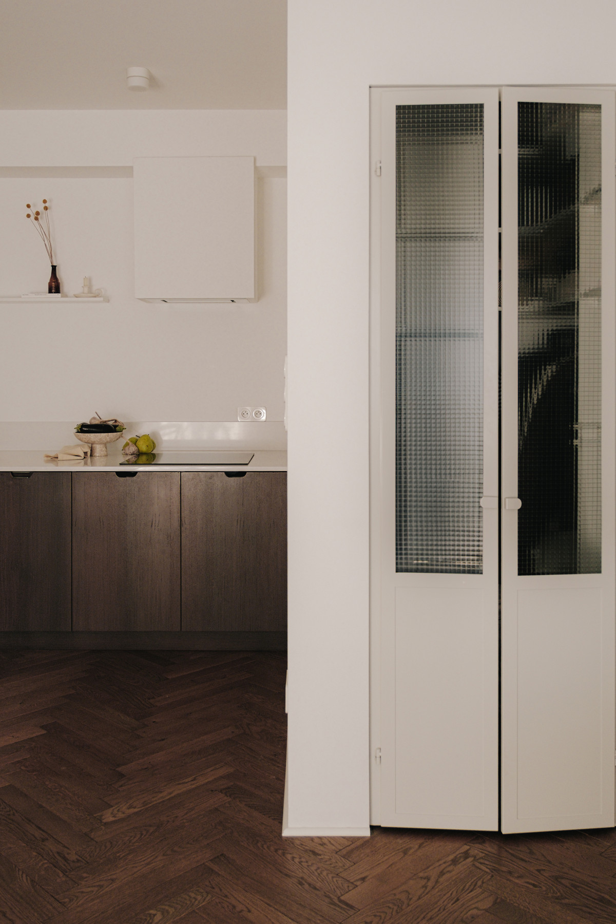 Korytarz znajduje się w bliskim sąsiedztwie garderoby. Tu ważnym elementem kompozycyjnym są stalowe drzwi ze szkłem zbrojonym, które prowadzą do garderoby i które zostały zaprojektowane z myślą o tym konkretnym wnętrzu. Ich geometryczna forma i transparentna struktura wprowadzają lekkość do przestrzeni, podkreślając jej minimalistyczny charakter.
