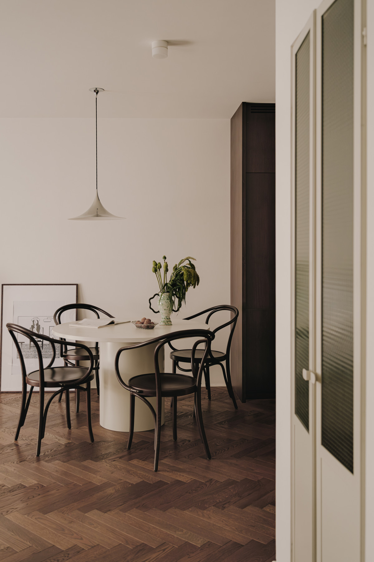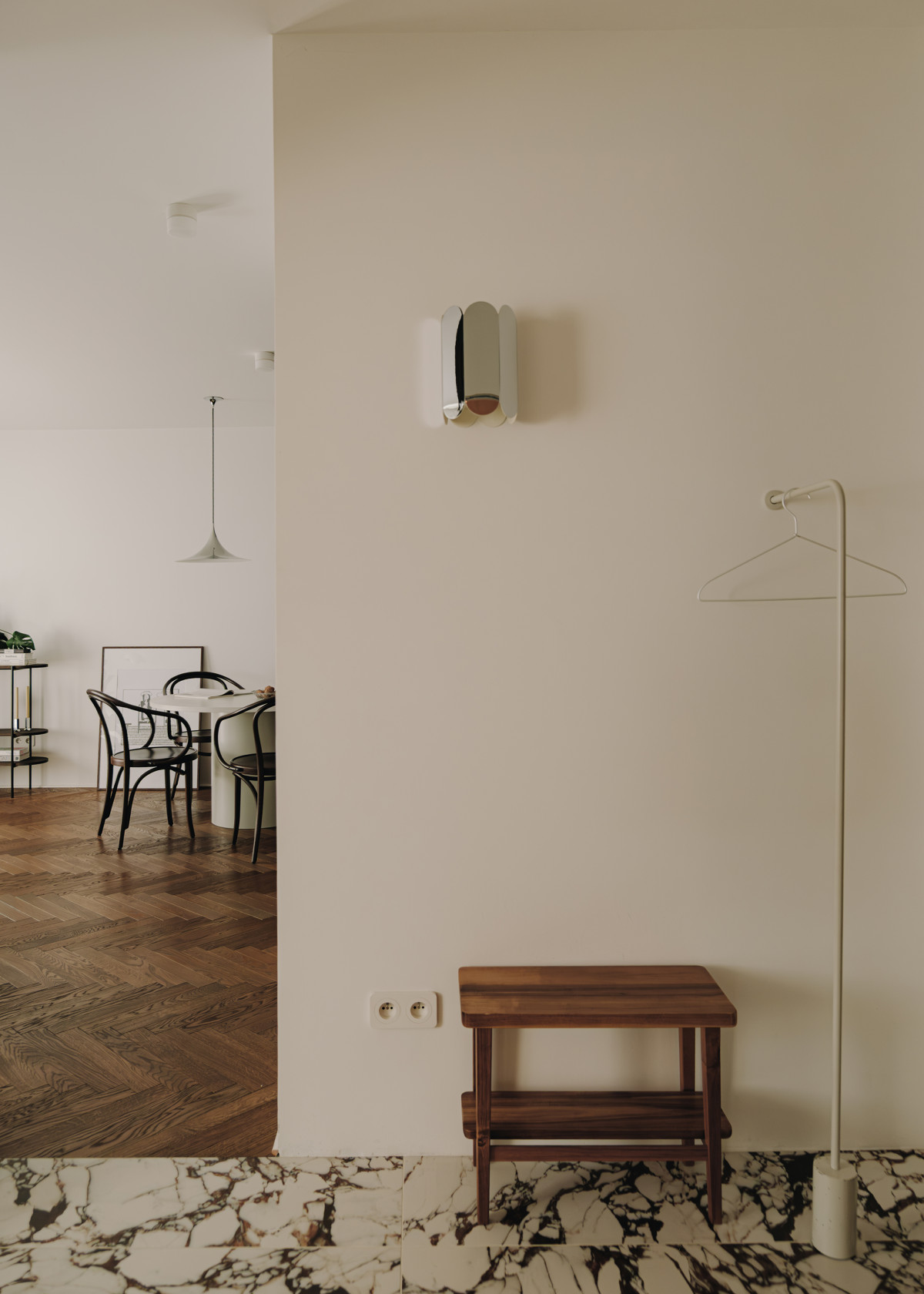 Układ mieszkania obejmuje otwartą strefę dzienną z kuchnią, sypialnię i łazienkę, a także garderobę. We wnętrzu dominuje biel, ciepłe odcienie drewna oraz ciemnobrązowy fornir. Całość ożywiają subtelne kolorystyczne akcenty, które nadają aranżacji oryginalnego charakteru. Dębowa podłoga ułożona w klasyczną jodełkę ociepla przestrzeń, a kamienne i stalowe detale oraz starannie dobrane oświetlenie podkreślają elegancję przestrzeni. Większość mebli takich jak stół, witryna, lustra, a nawet karnisze została wykonana na zamówienie, co pozwoliło w pełni wykorzystać potencjał 45 metrów.