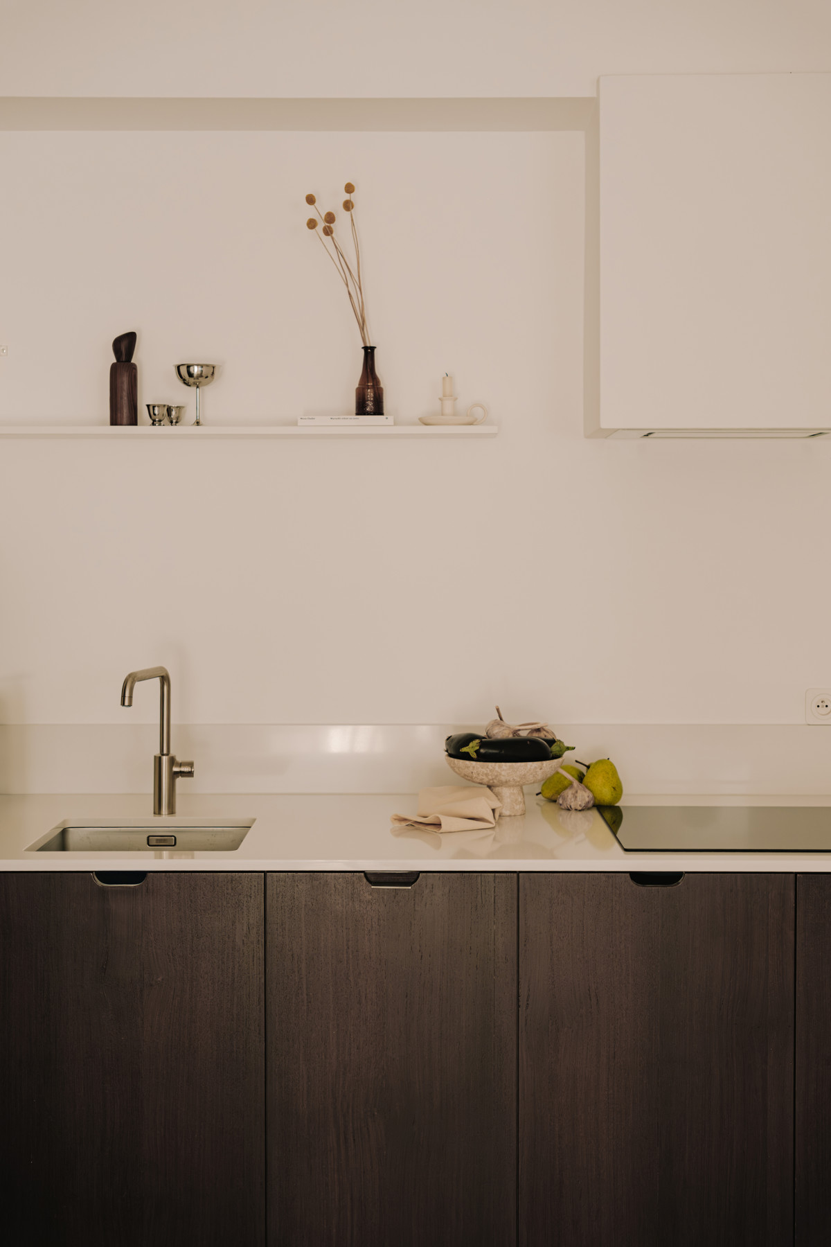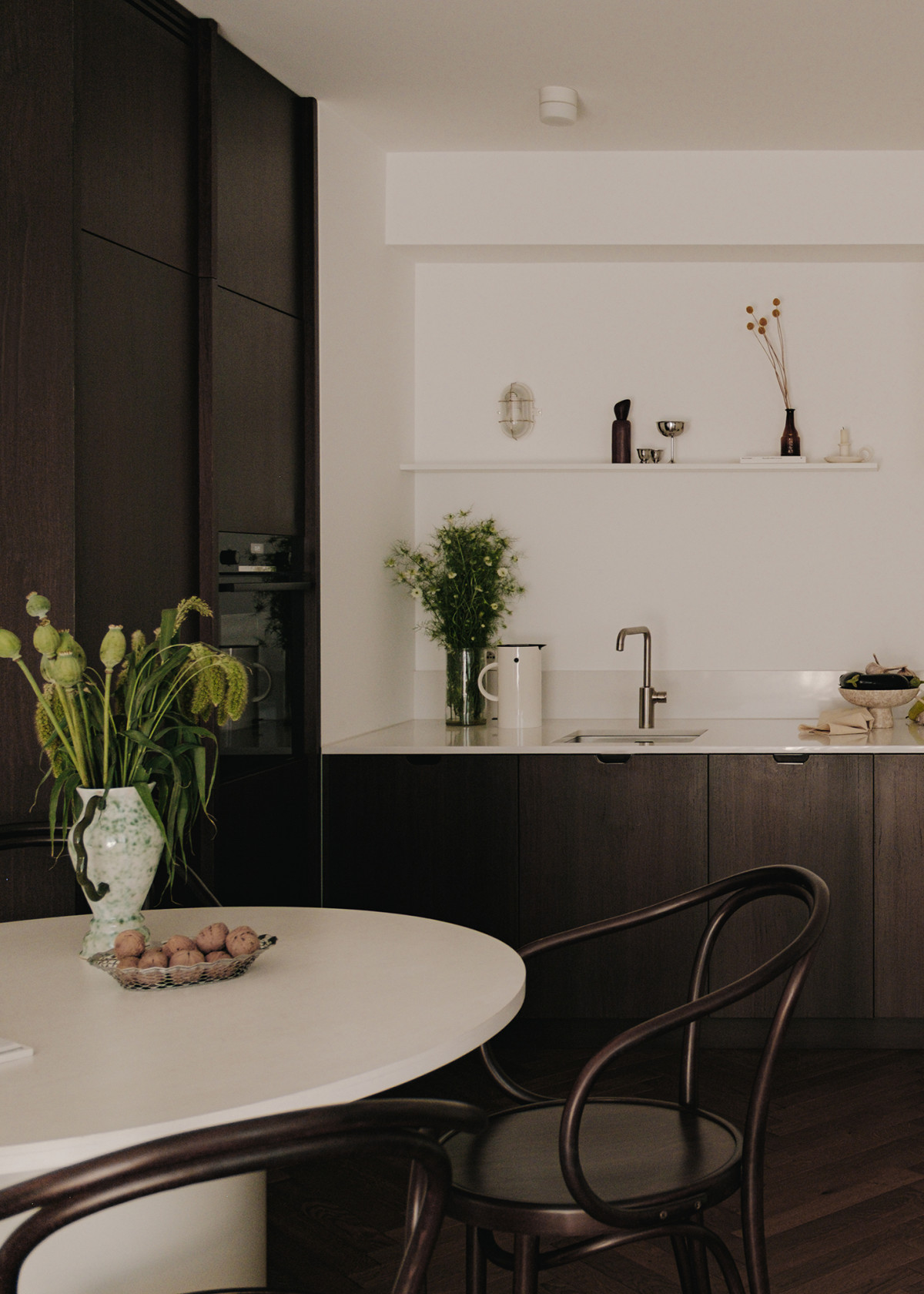 Po lewej stronie kuchni zaprojektowano wysoką zabudowę meblową utrzymaną w tym samym stylu co zabudowa w salonie: wykończoną ciemno-brązowym fornirem i wyposażoną w charakterystyczne, pionowe uchwyty na całej wysokości frontów. Dzięki temu udało się zachować spójność materiałową i estetyczną w całej strefie dziennej.