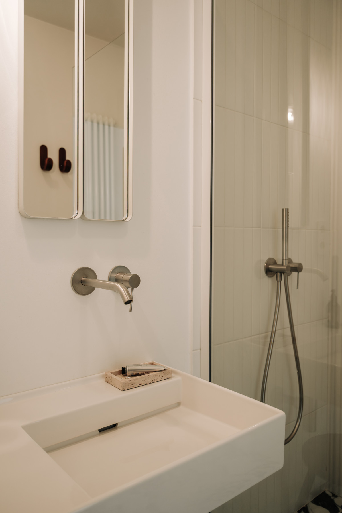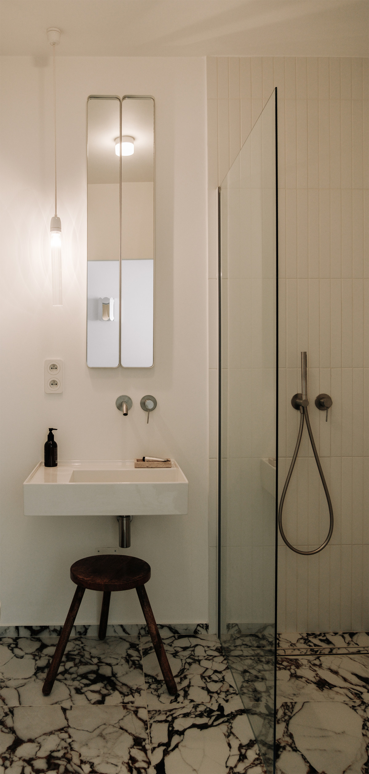 Łazienka kontynuuje stylistykę pozostałych pomieszczeń. Witryna zaprojektowana przez Magdalenę Herbę z frontami ze zbrojonego szkła, nawiązującego do detalu stalowych drzwi garderoby stanowi łącznik stylistyczny pomiędzy pomieszczeniami. Nietypowym rozwiązaniem jest strefa umywalki, którą zamiast płytkami, pokryto wysokiej jakości farbą zmywalną i wodoszczelną. Takie rozwiązanie pozwoliło uzyskać prostszy, bardziej naturalny efekt przy zachowaniu pełnej funkcjonalności.