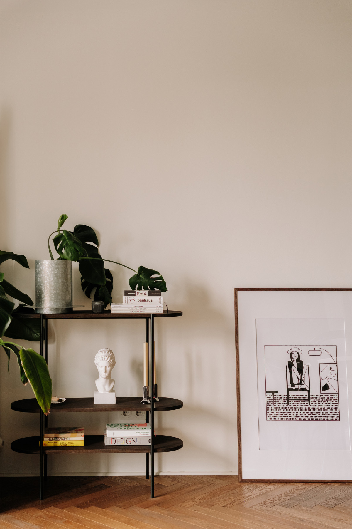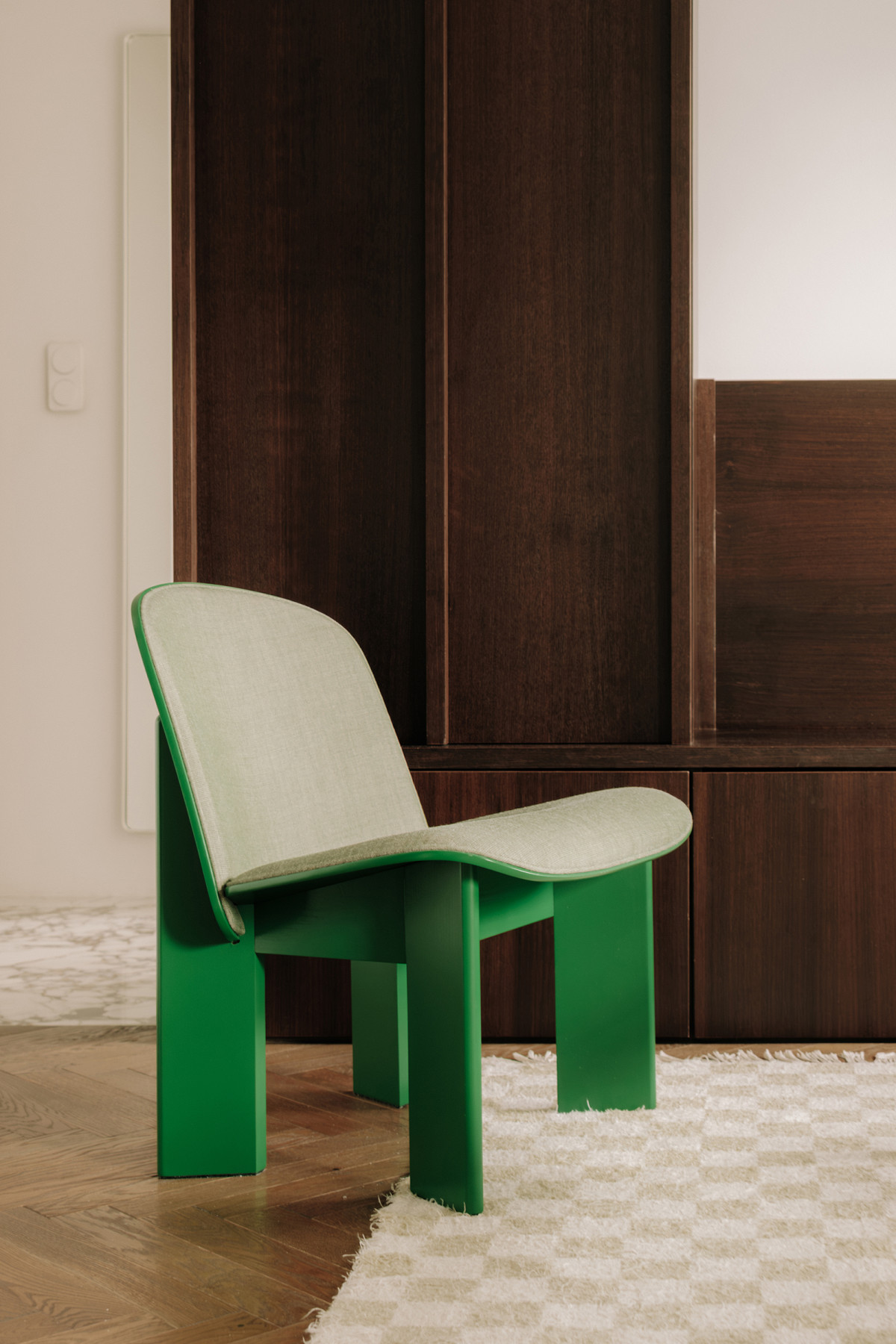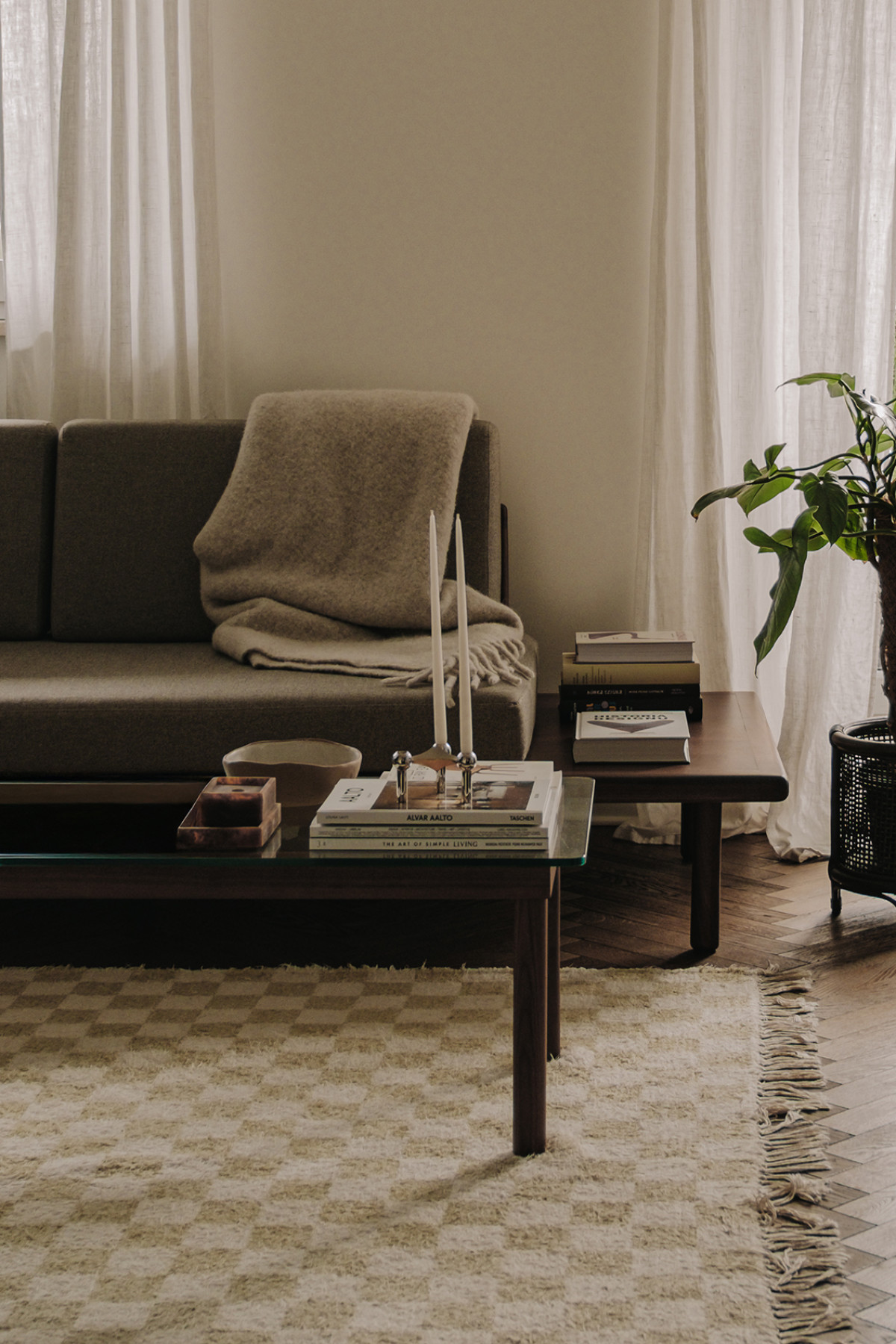 Założeniem projektowym było stworzenie otwartej, przyjaznej przestrzeni sprzyjającej spotkaniom z ludźmi. Głównym punktem jest sofa, której podstawa z orzechowego drewna pełni jednocześnie funkcję dekoracyjną oraz praktyczną – półki na książki. Ten detal podkreśla zamiłowanie właściciela do prostych, funkcjonalnych rozwiązań i naturalnych materiałów. Całość dopełnia szklana ława, dywan w kratę i przykuwający wzrok soczyście zielony fotel.