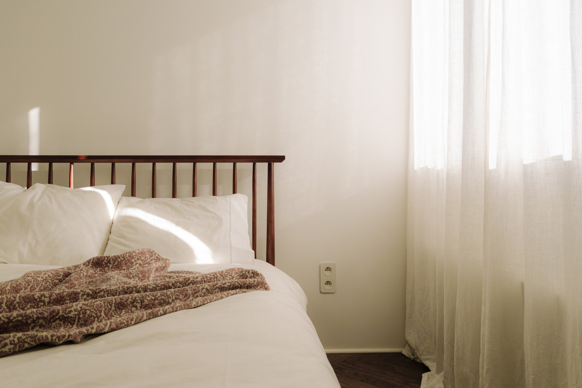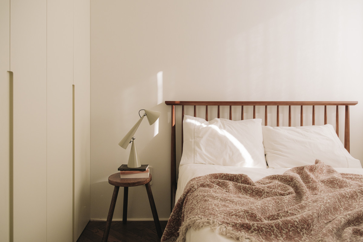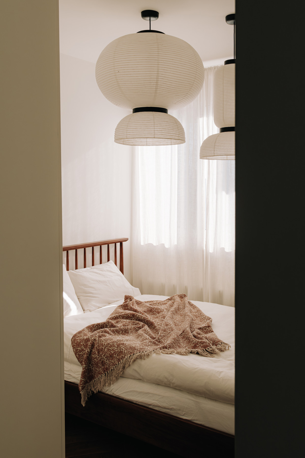 Sypialnia to prawdziwe królestwo wypoczynku i regeneracji. Wnętrze pozbawiono zbędnych i rozpraszających elementów – projektantka zastosowała ograniczoną paletę materiałów i neutralną kolorystykę. Ozdobą sypialni jest oświetlenie. Uwagę zwracają wiszące lampy przypominające chińskie lampiony oraz biała lampka projektu Toma Dixona.