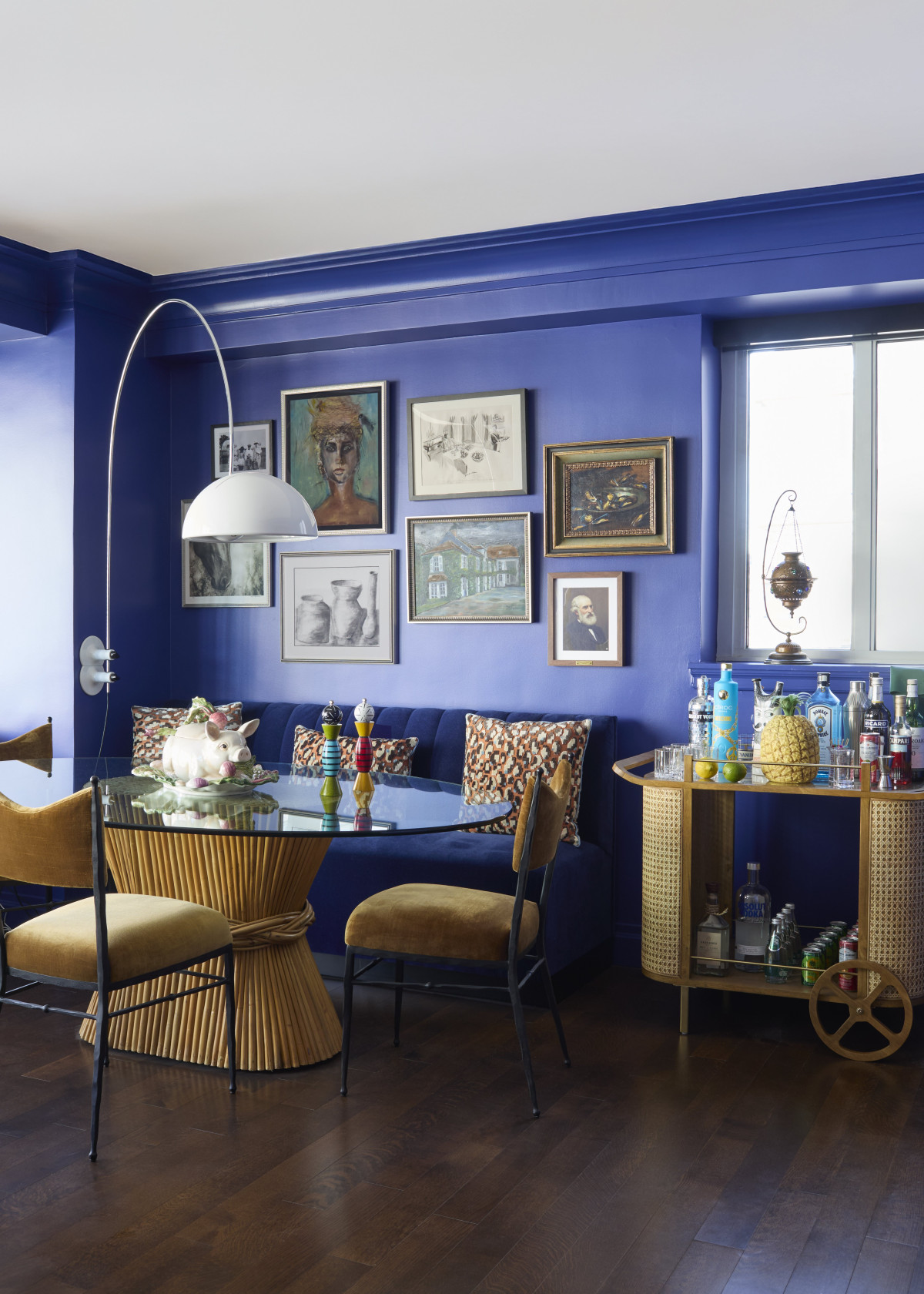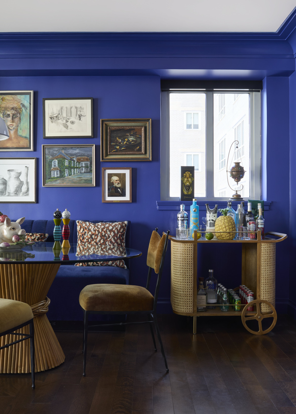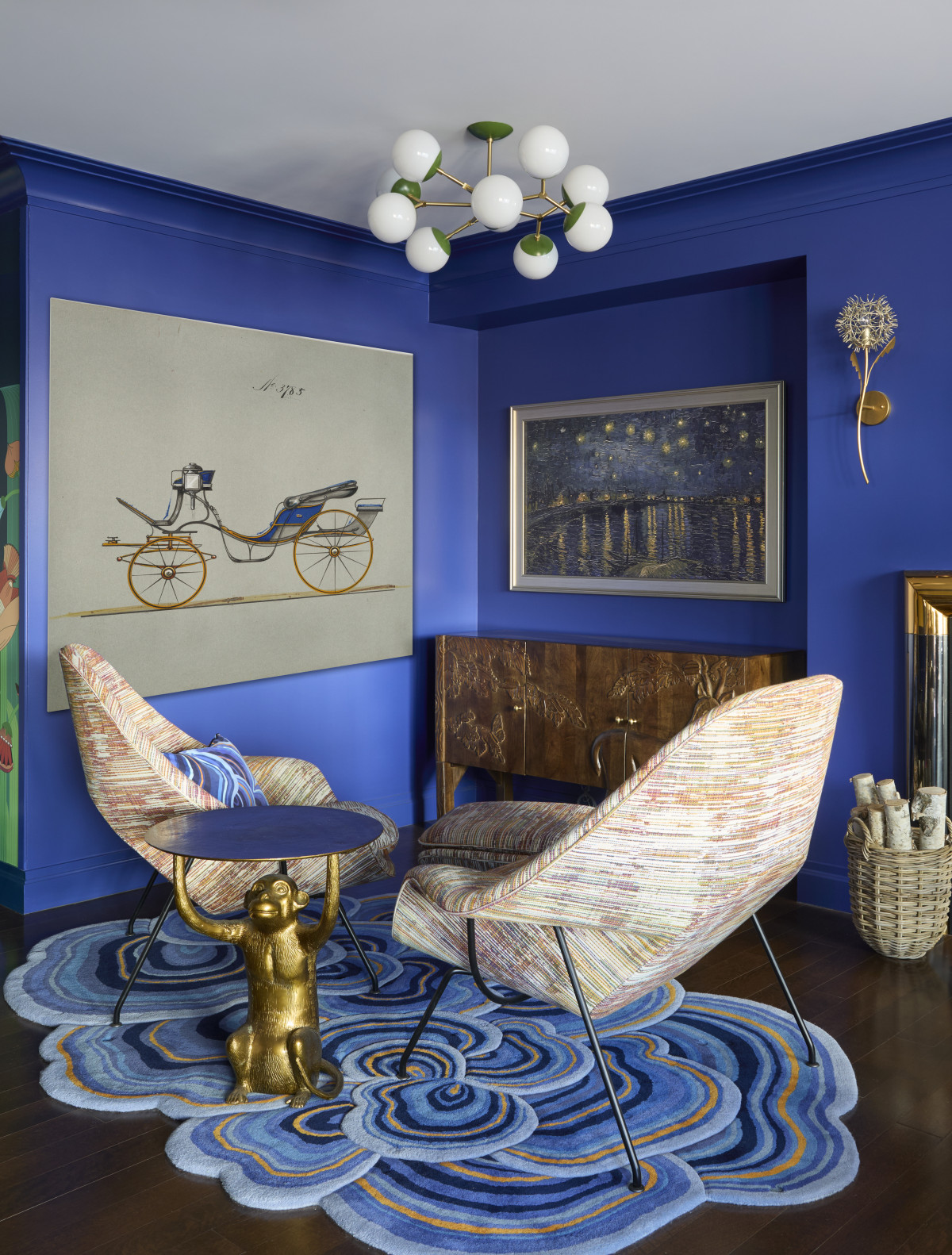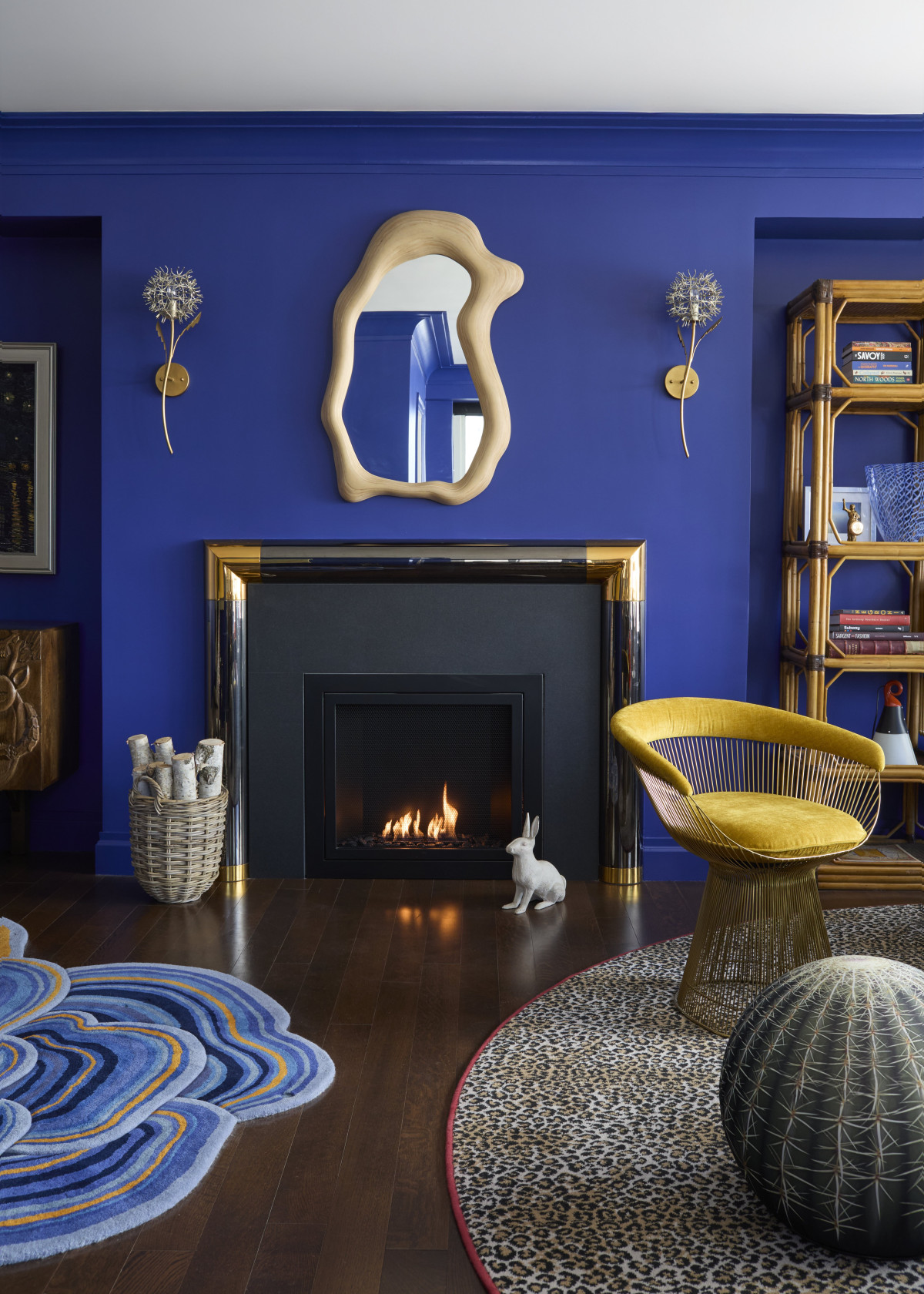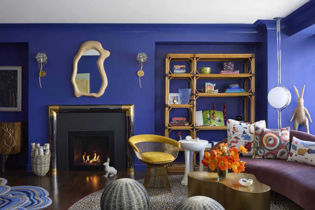 Wyzwaniem podczas aranżacji salonu była długa belka biegnąca przez całą ścianę. By ją nieco zamaskować projektant zdecydował się na montaż w jej centralnej części bezprzewodowego kominka i stworzenie wnęk po obu stronach. Kominek wzbogacono ozdobnym gzymsem z końca lat 70. wykonanym z metalu i mosiądzu. Salon pomalowano następnie na kolor kobaltowy, który z jednej strony dodał pomieszczeniu elegancji, a z drugiej – stworzył w nim klimat sprzyjający odpoczynkowi.
