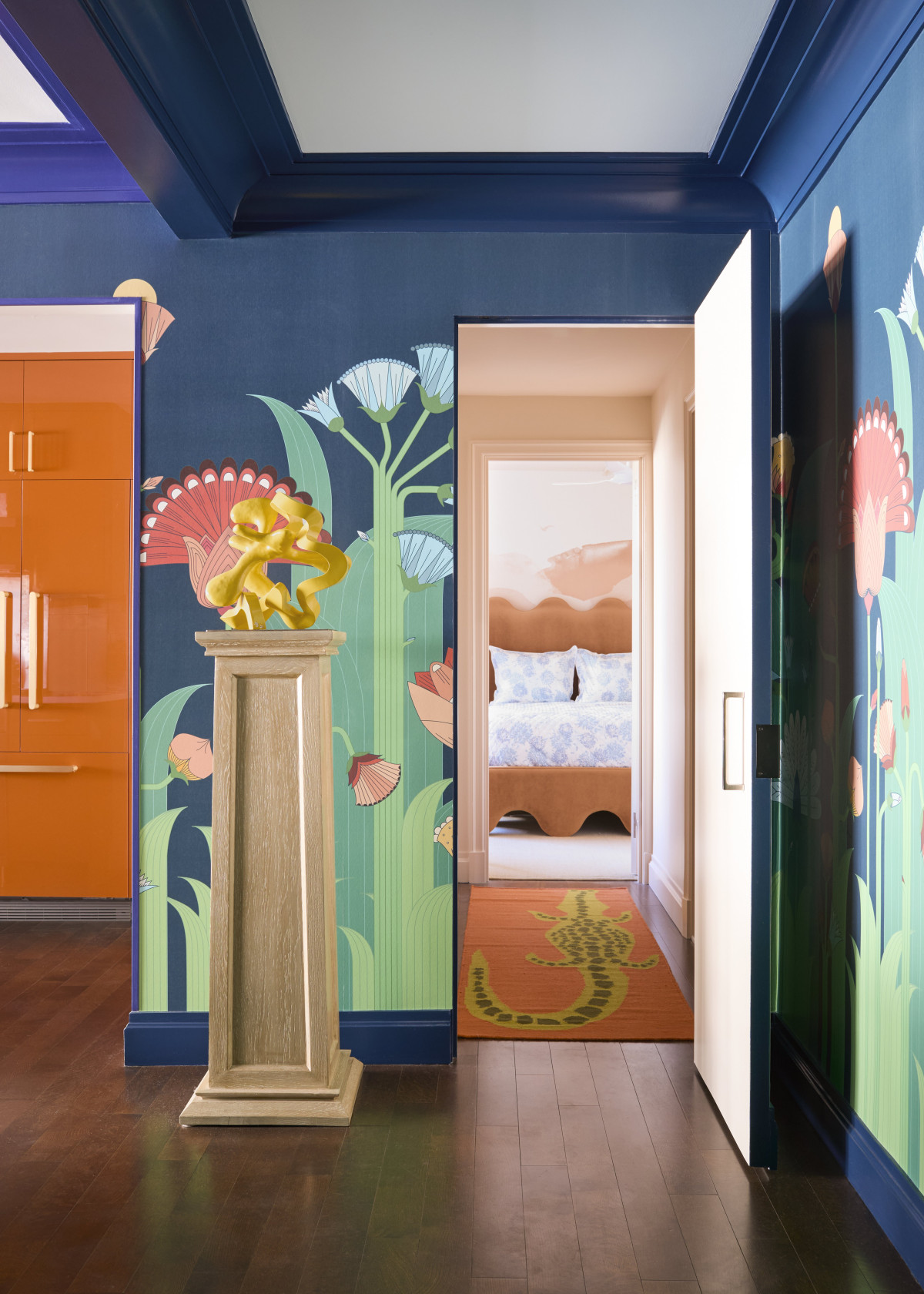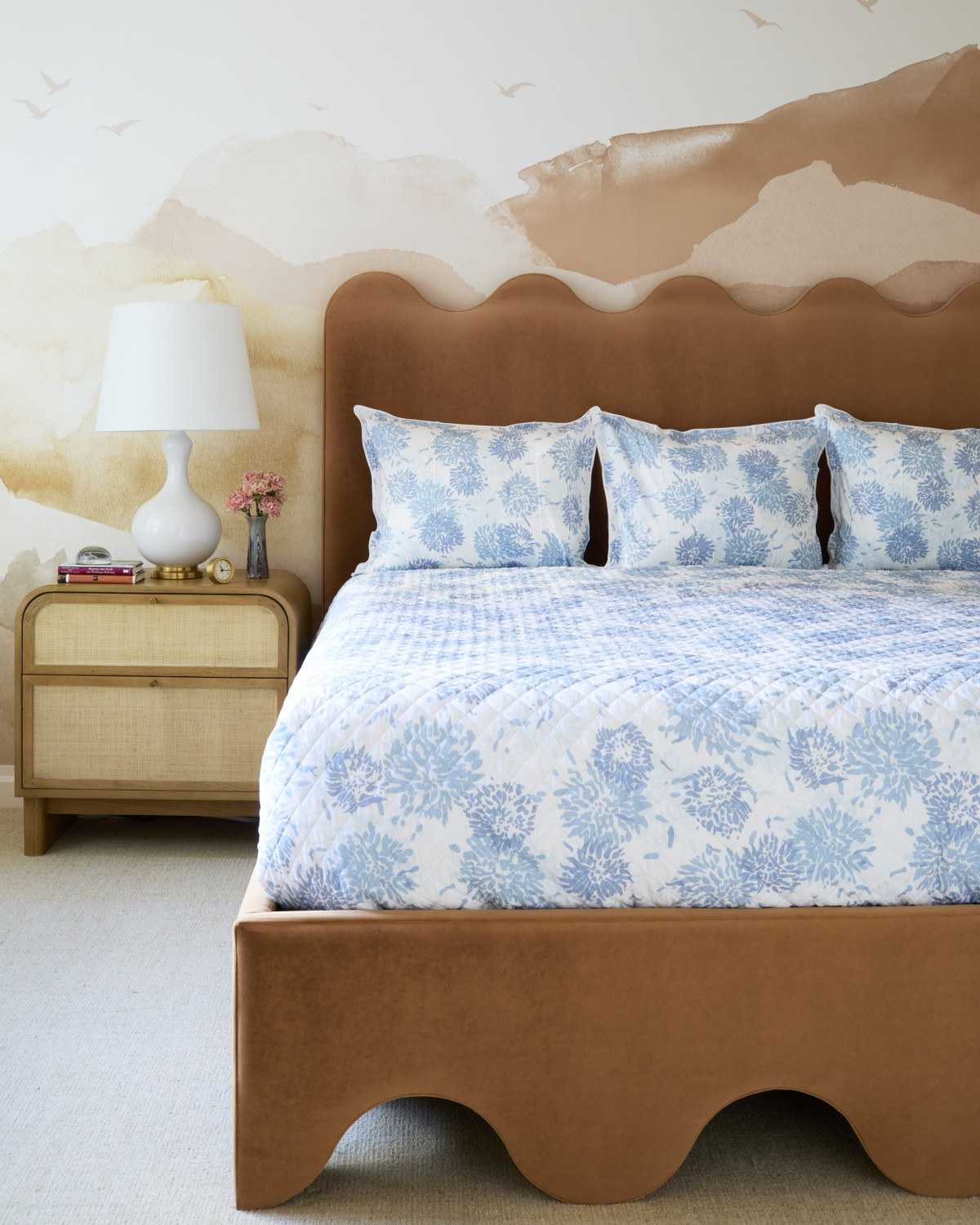 W sypialni zastosowano spokojniejszą paletę barw, w tym kojący mural w ciepłych, pustynnych barwach. Łóżko o pofalowanym zagłówku i ramie naśladuje linię krajobrazu na ścianie, a stoliki nocne z plecionką w stylu kolonialnym podkreślają przytulną, niespieszną atmosferę.