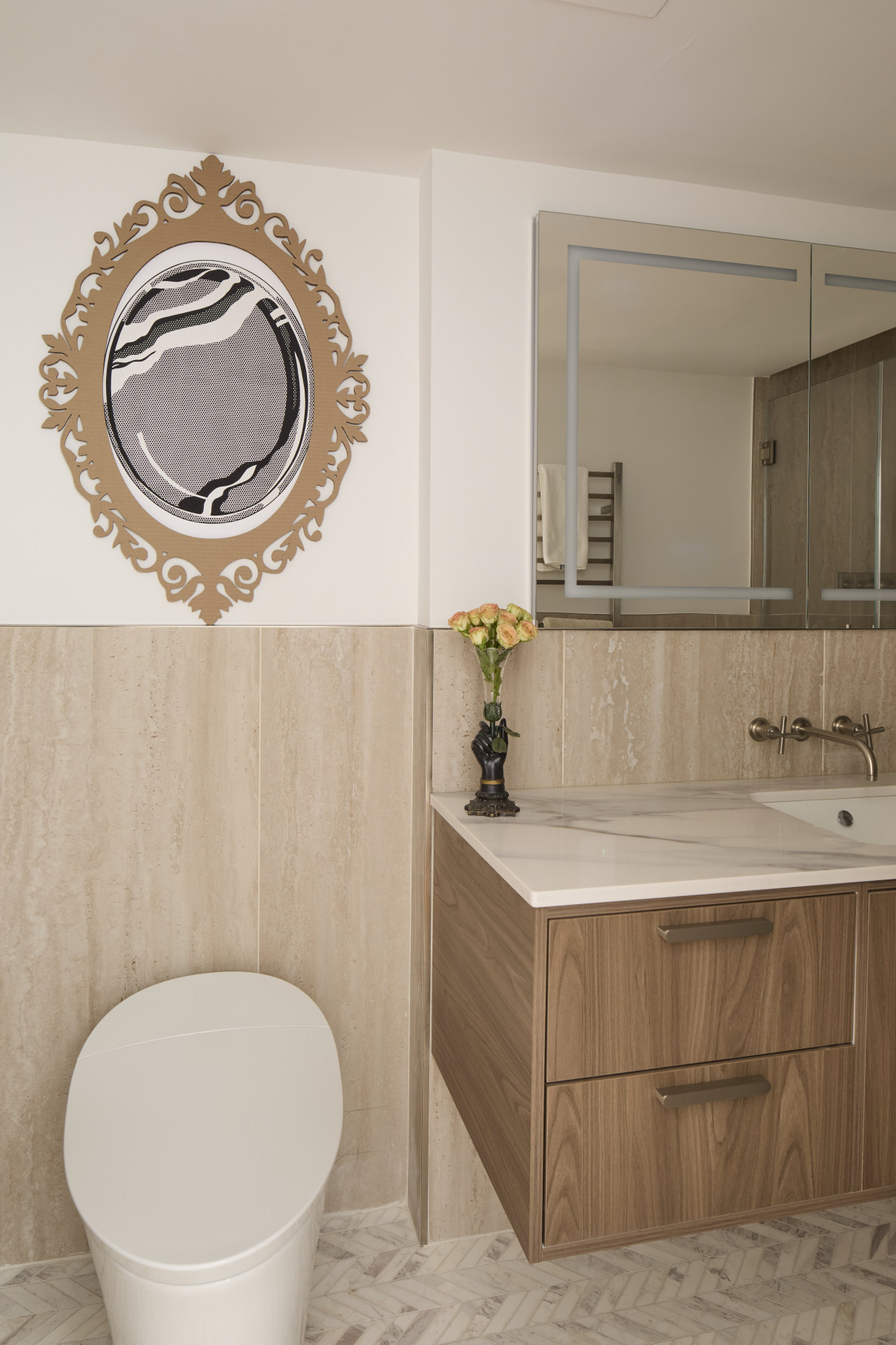 Apartamentowiec Manhattan House to jeden z najważniejszych przykładów powojennego modernizmu na Upper East Side. Budynek zaprojektowany przez Gordona Bunshafta z pracowni Skidmore, Owings & Merrill ukończono w 1951 roku. Mieszkanie, które należy do pary z Nowego Meksyku znajduje się na jednym z wyższych pięter, co zapewnia idealne doświetlenie w warunkach miejskich.