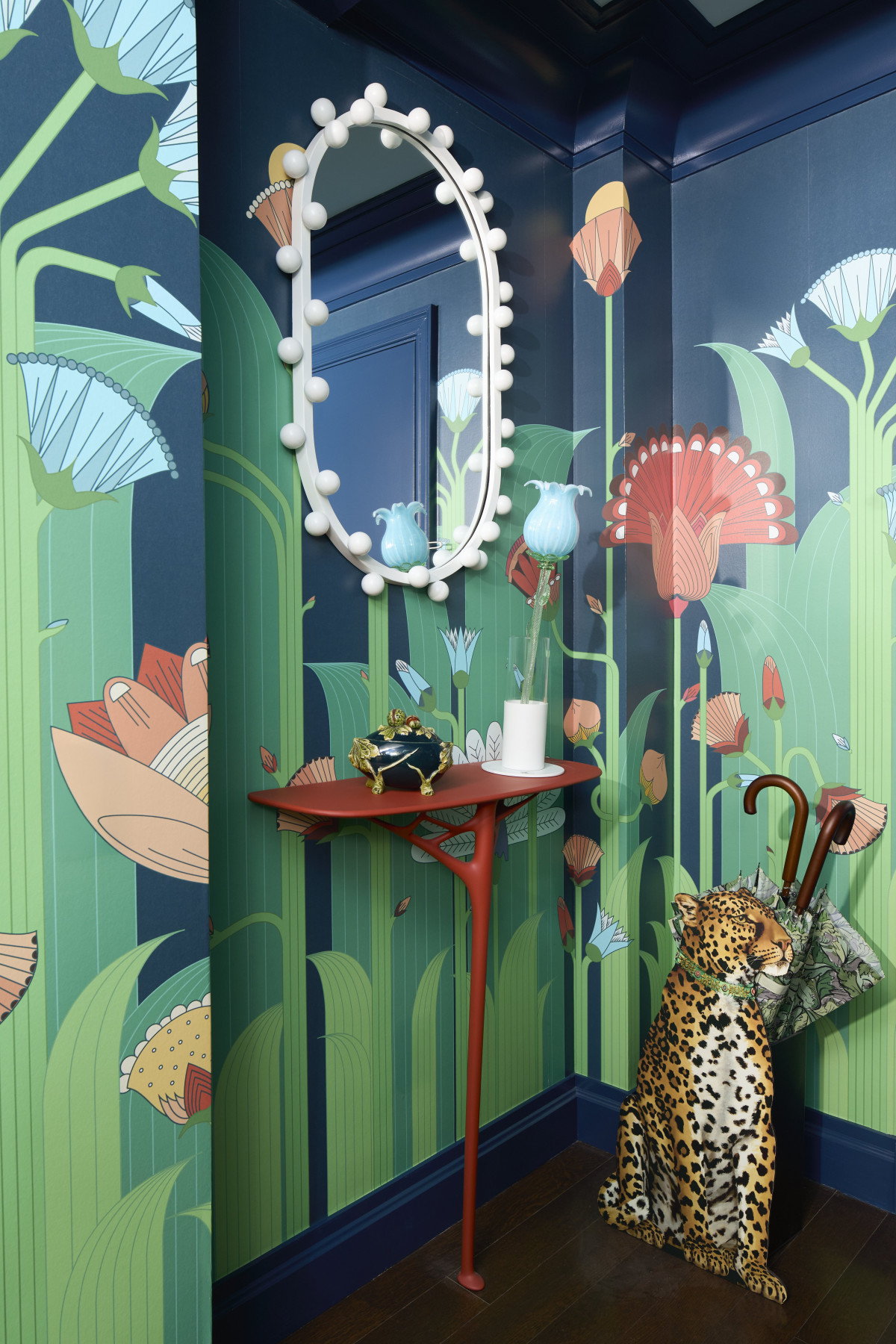 Projektując hol wejściowy, Harry Heissmann zdecydował się na wymianę wszystkich drzwi na modele zlicowane ze ścianą – ten zabieg pozwolił na pokrycie całego przedpokoju barwną tapetą z tropikalnymi motywami, ukrywając tym samym drzwi. W holu znalazło się również miejsce na czerwoną konsolę, na której postawiono kwiecistą lampę z niebieskiego szkła Murano. Uwagę zwraca tu także nowoczesne lustro oraz rzeźba Alexa Barretta.