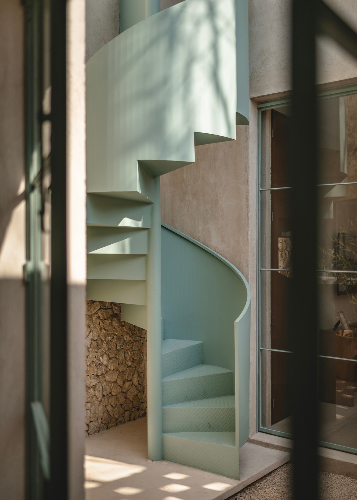 Cyjanowy odcień mają stalowe szprosy nowych okien i drzwi oraz kręcone schody. Zdjęcie: Manolo R. Solís