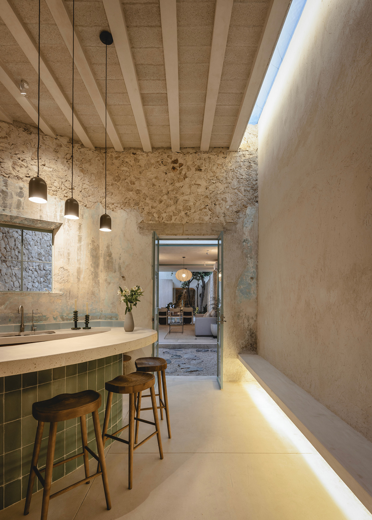 Po przekroczeniu progu trafiamy na niewielki ogród wejściowy, dalej jest zadaszona kuchnia, potem małe patio z kręconymi schodami prowadzącymi do sypialni na piętrze, później salon, główny dziedziniec z basenem i kolejna sypialnia. – Zamiast tworzyć nowy dom, chcieliśmy wykorzystać to, co już tu istniało. Poprzez rytm patiów, krzywizn ścian i naturalnego oświetlenia wydobyliśmy potencjał zachowanych murów – mówi architekt José Luis Irizzont Manzanero, założyciel studia.