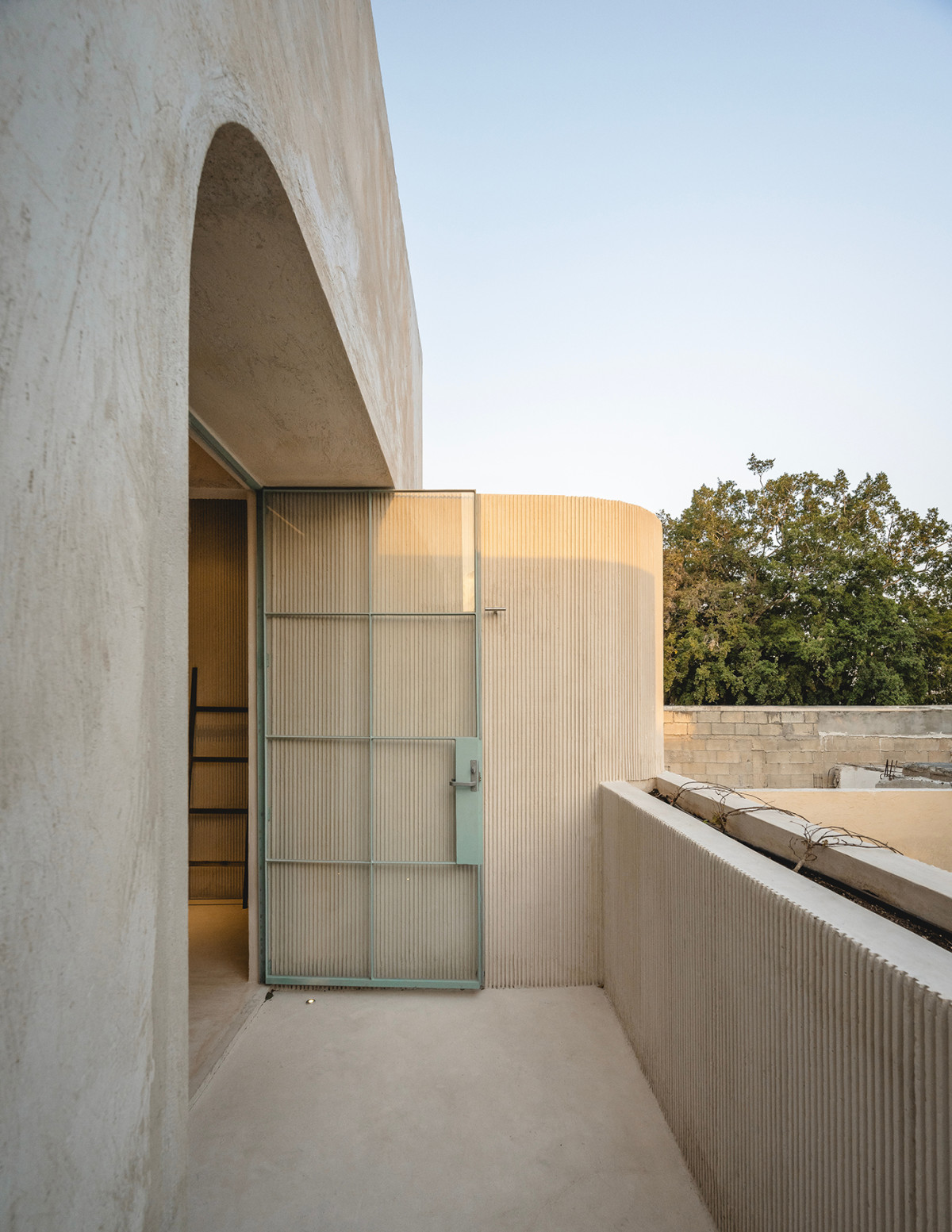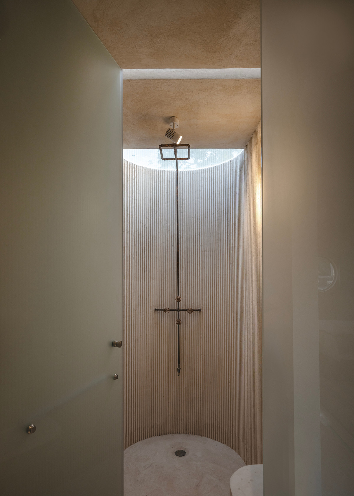 Fragment łazienki z półksiężycowym otwarciem na niebo i kanelowanym betonem. Zdjęcie: Manolo R. Solís