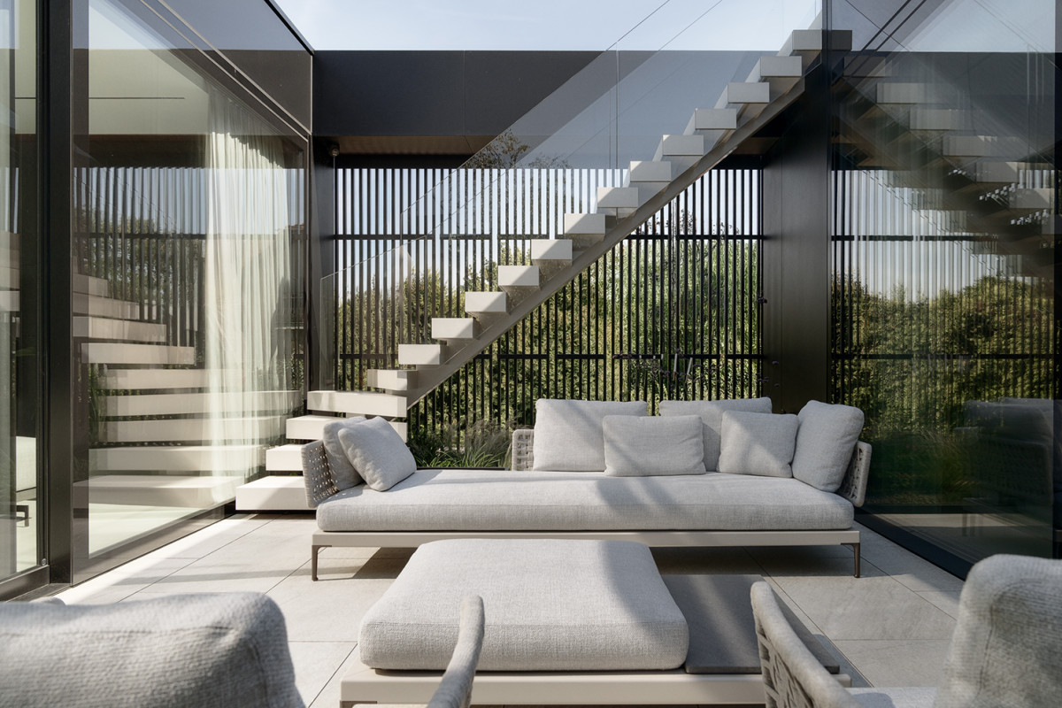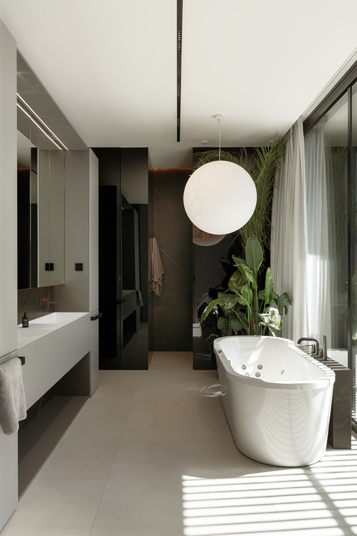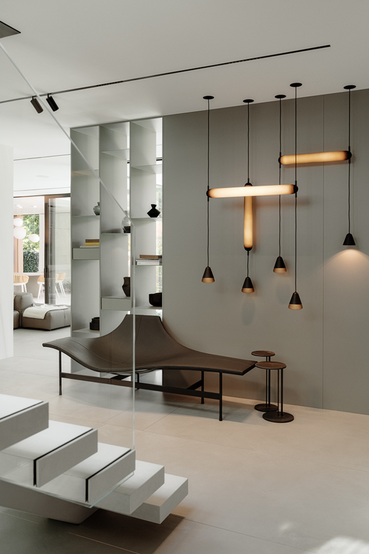 Wnętrze utrzymano w stonowanej palecie barw inspirowanej naturą – beżach, szarościach, ciepłych odcieniach drewna i kamienia. Minimalistyczne formy mebli równoważą się z miękkimi tkaninami i subtelnymi detalami, które budują atmosferę spokoju. Dużą rolę odgrywa światło – zarówno naturalne, jak i sztuczne. Linowe i ukryte źródła oświetlenia pozwalają kreować nastroje, a duże przeszklenia sprawiają, że wnętrze zmienia się w rytmie dnia. Każda strefa – od salonu, przez taras, po prywatne łazienki – zachowuje własny charakter, ale wspólnie tworzą spójną opowieść o domu, który jest nie tylko miejscem do życia, ale codziennym rytuałem komfortu i estetyki.