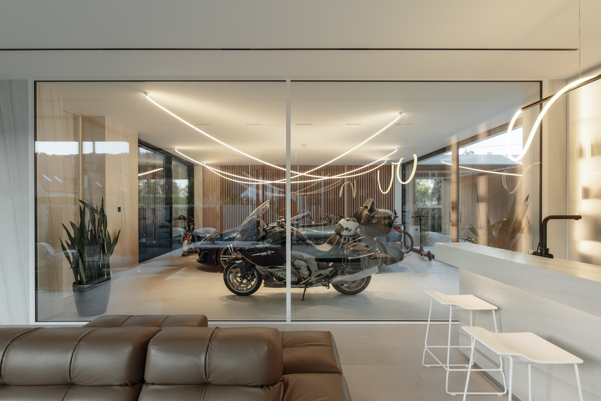 „Otwarcie na garaż z przestrzeni wypoczynkowej i imprezowej to było marzenie właściciela - takie man cave. Garaż jest podzielony na dwie strefy – codzienny, schowany za przesuwnymi drewnianymi lamelami oraz okazjonalny, przeszklony na salon” - mówi architektka.