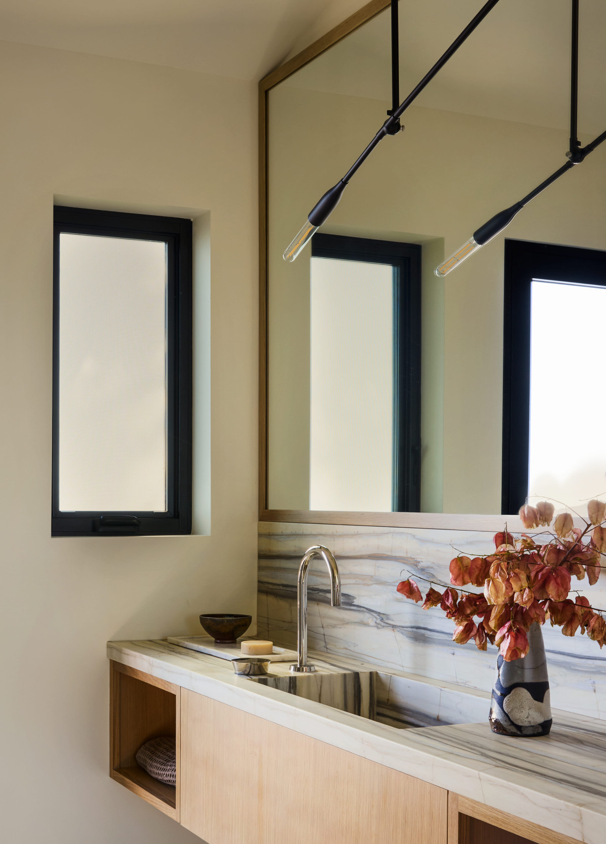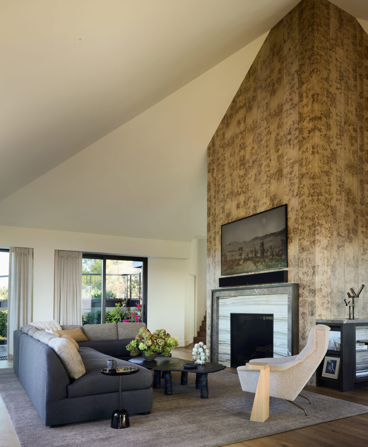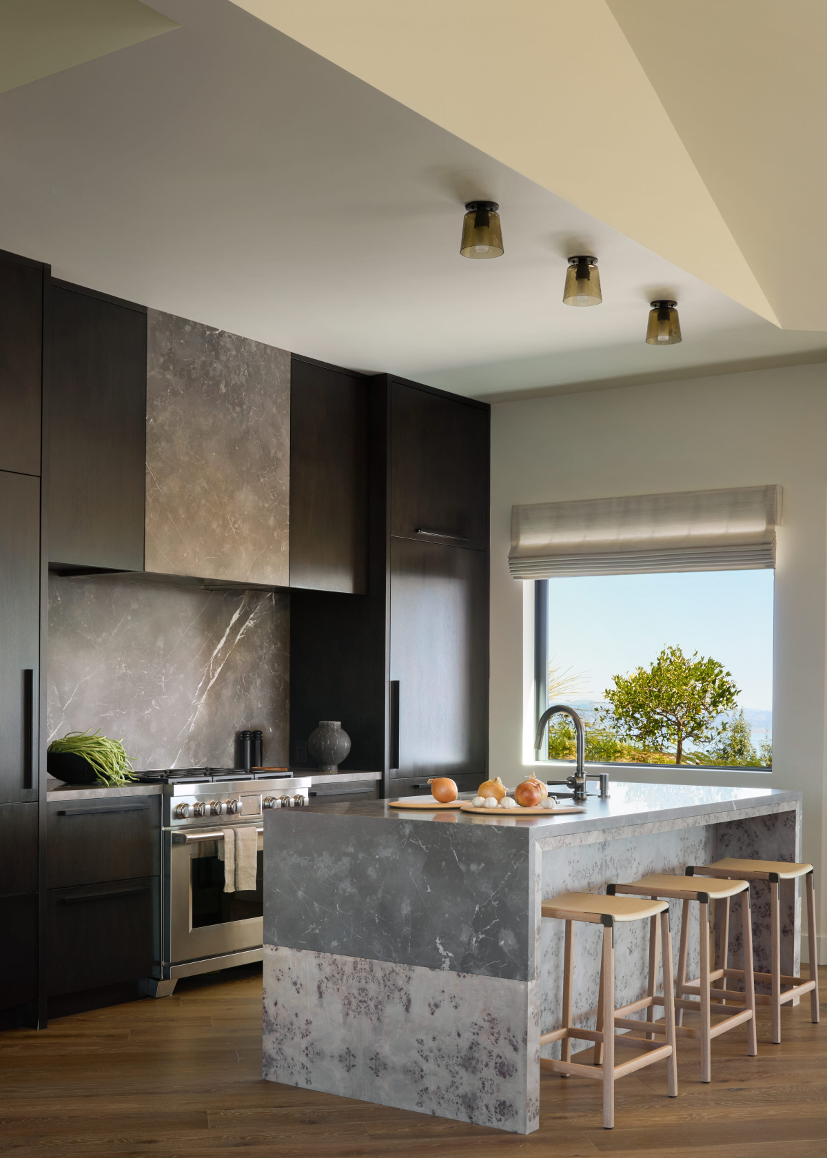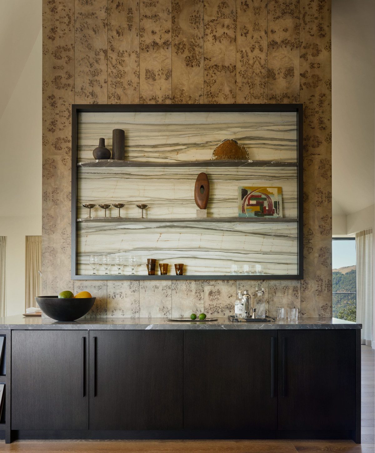 We wnętrzu geometryczna, kanciasta architektura została zestawiona z miękkimi, zaokrąglonymi kształtami, które razem stworzyły spokojny, nowoczesny rytm. Ciepłe drewno, w tym efektowny jesion o dekoracyjnym usłojeniu połączono z kamiennymi elementami o unikatowym żyłkowaniu - marmurem i onyksem, tworząc elegancki i intrygujący zestaw. Wszystkie pomieszczenia utrzymane są w stonowanej, neutralnej kolorystyce, co pozwala wybrzmieć zarówno zastosowanym materiałom, jak i imponującym widokom za oknem.