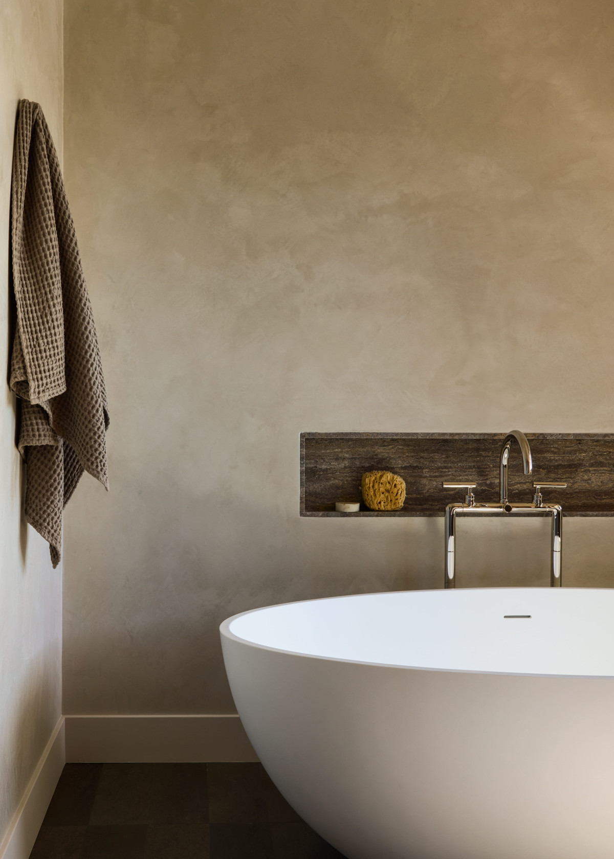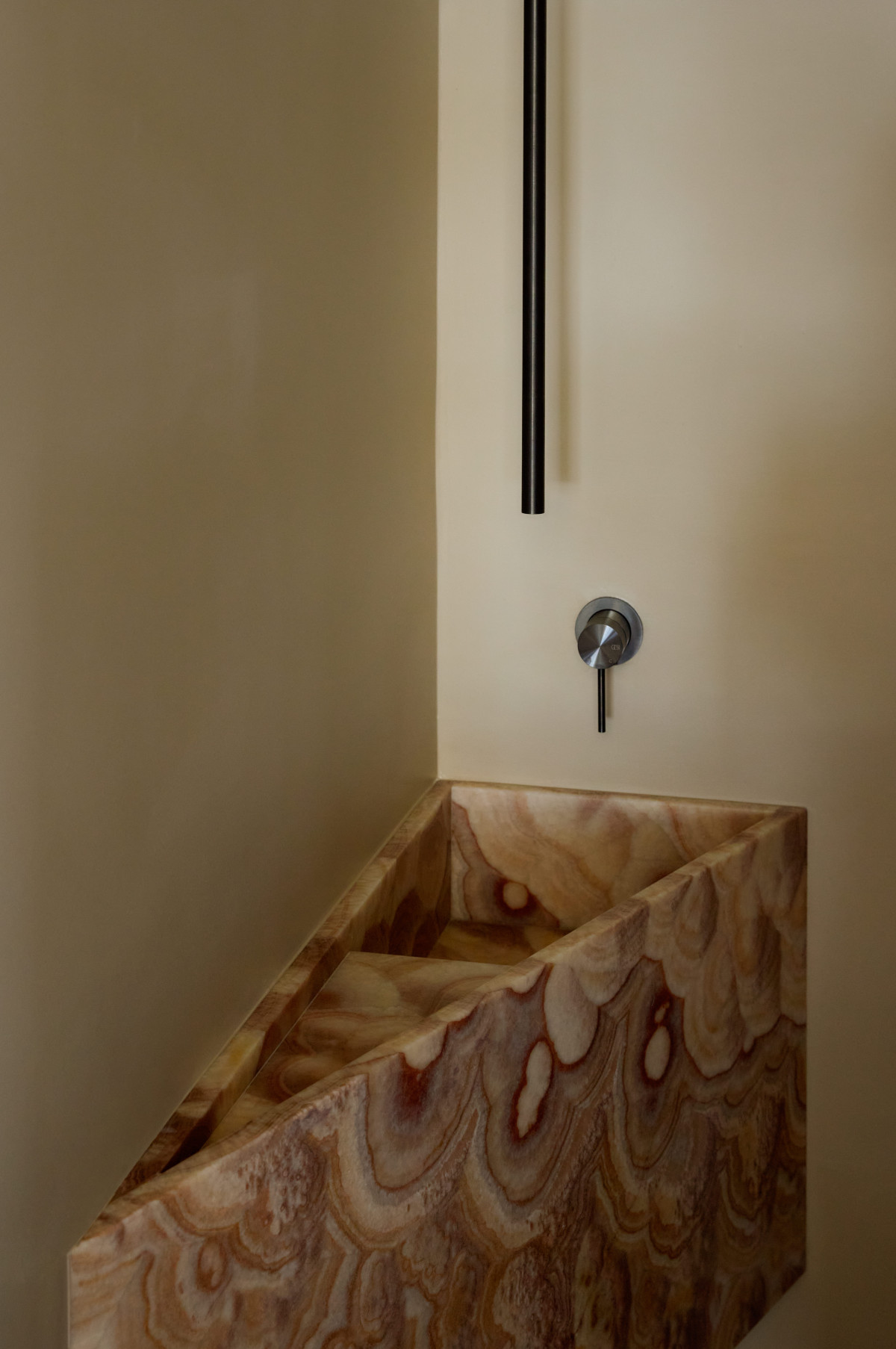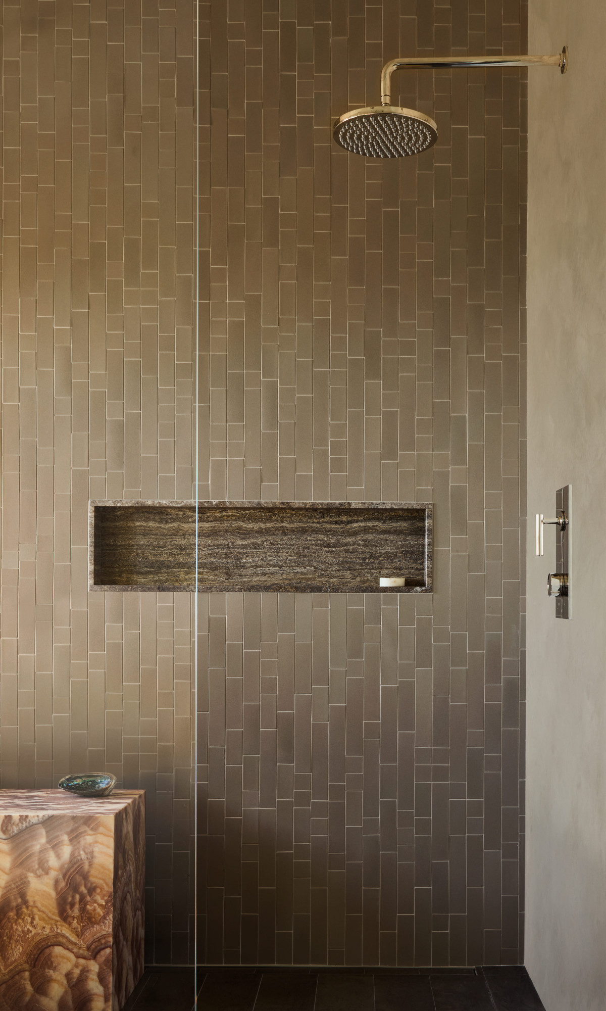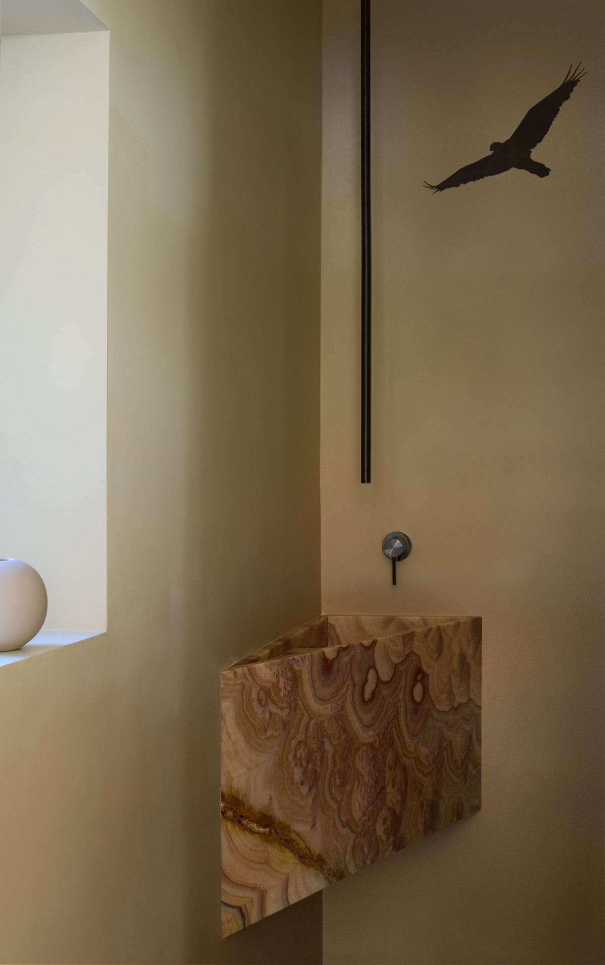 We wnętrzu geometryczna, kanciasta architektura została zestawiona z miękkimi, zaokrąglonymi kształtami, które razem stworzyły spokojny, nowoczesny rytm. Ciepłe drewno, w tym efektowny jesion o dekoracyjnym usłojeniu połączono z kamiennymi elementami o unikatowym żyłkowaniu - marmurem i onyksem, tworząc elegancki i intrygujący zestaw. Wszystkie pomieszczenia utrzymane są w stonowanej, neutralnej kolorystyce, co pozwala wybrzmieć zarówno zastosowanym materiałom, jak i imponującym widokom za oknem.