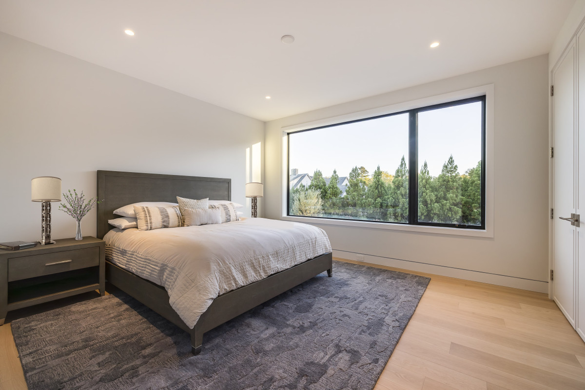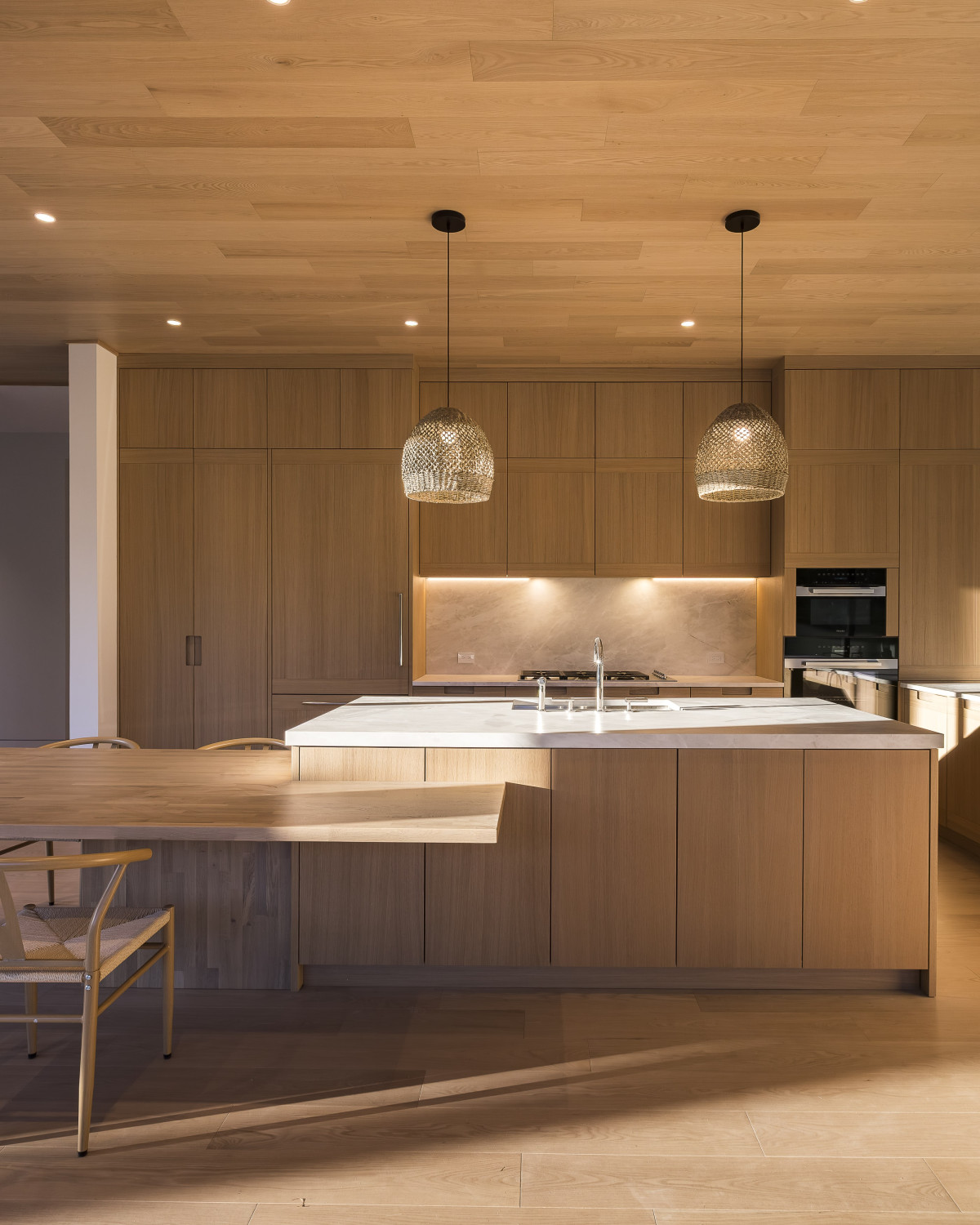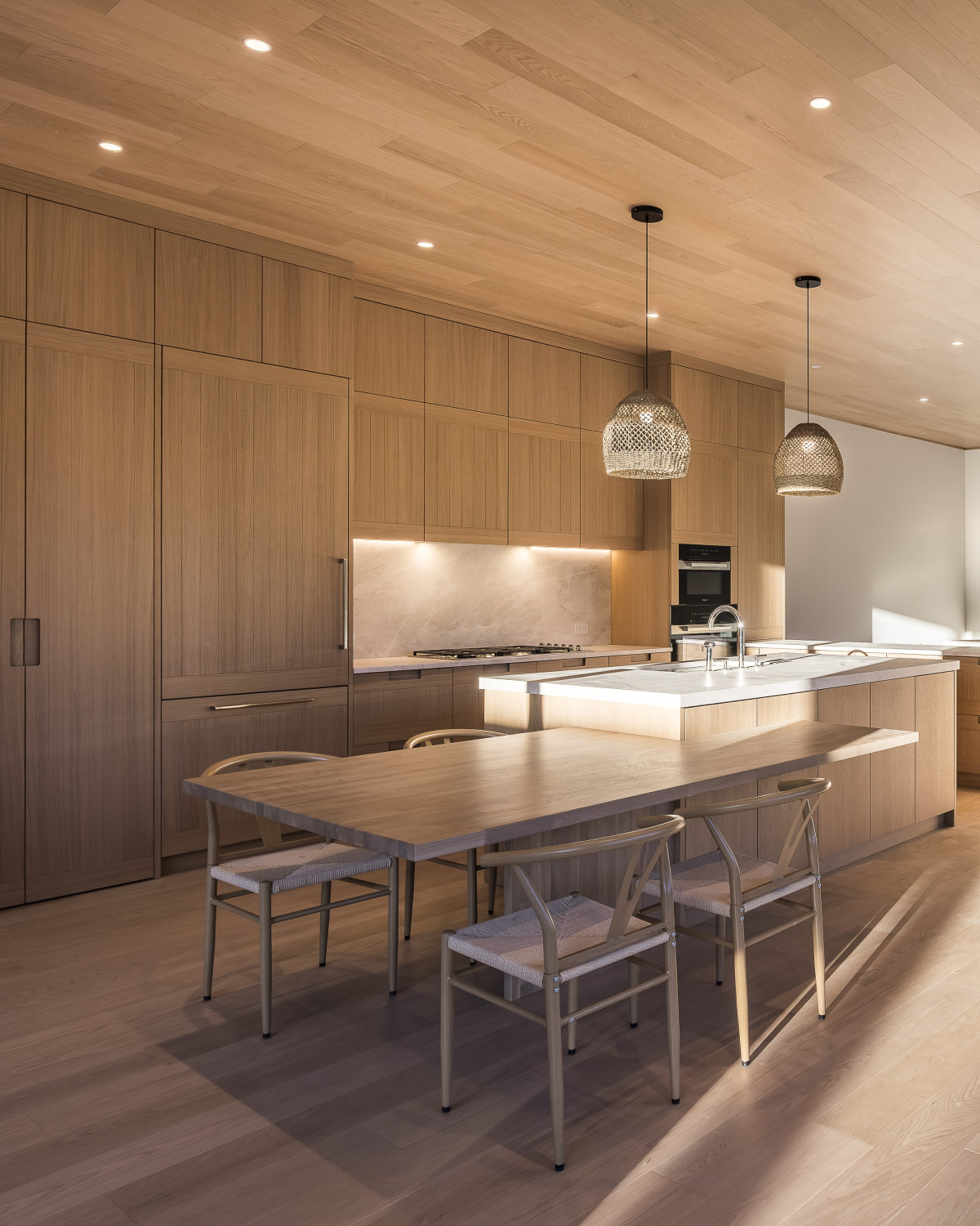 W strefie dziennej, wzrok przykuwa dwustronny kominek wykończony drewnem, natomiast kuchnia z białego dębu i dużą wyspą połączoną ze stołem ma ukrytą przestrzeń roboczą, która sprawdza się zarówno podczas przyjęć jak i codziennego użytkowania.