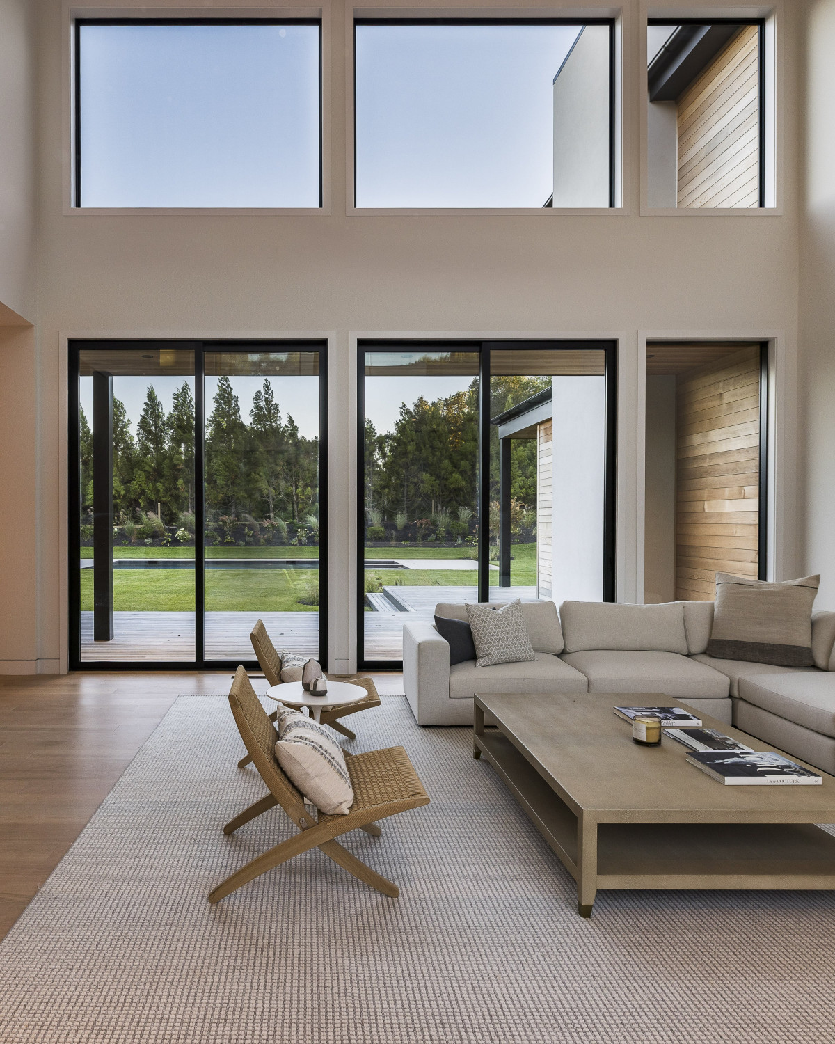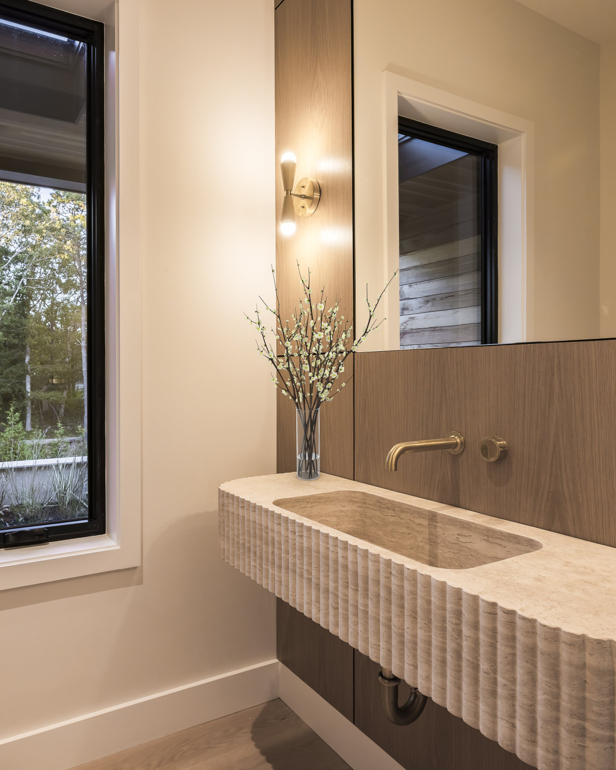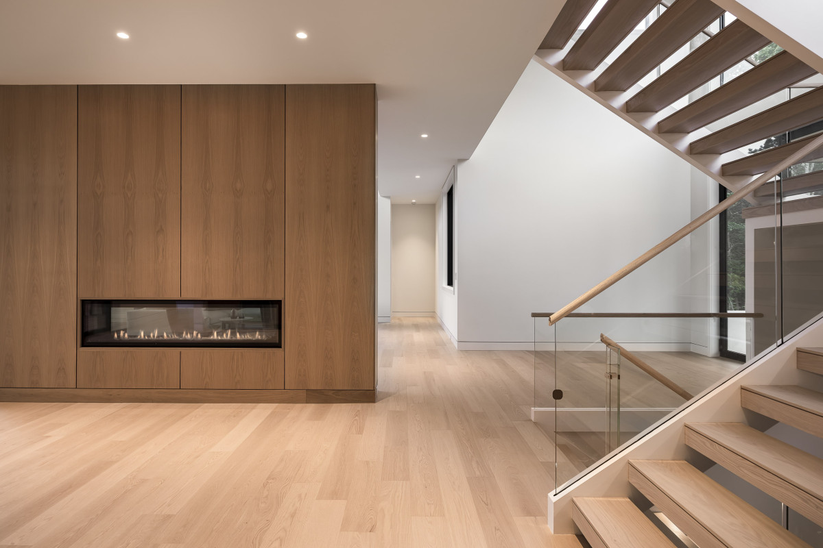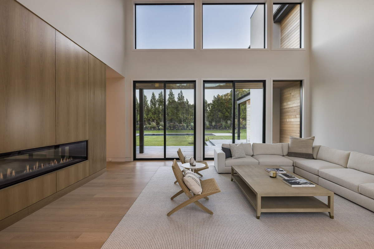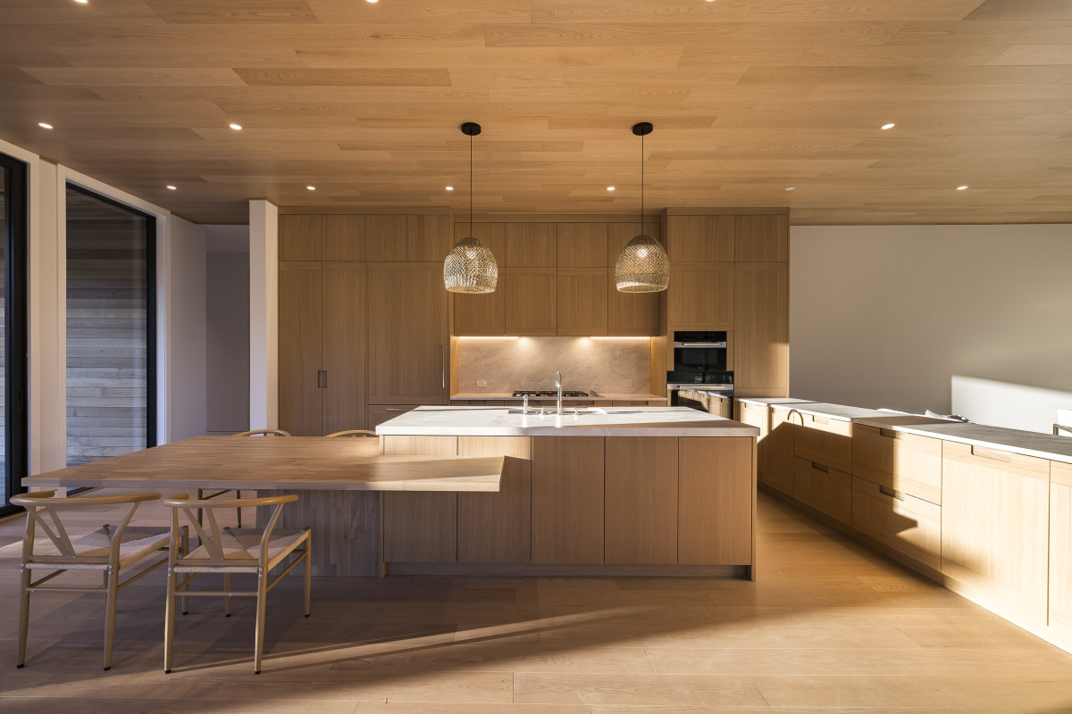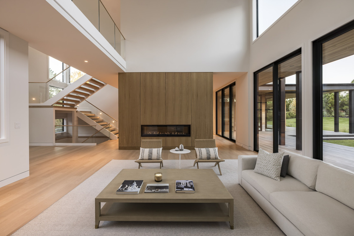 Każdy element architektoniczny posiadłości w Water Mill, od proporcji okładzin po sekwencję przestrzeni, został starannie przemyślany, by osiągnąć wrażenie harmonii i lekkości. Jednym z głównych wyzwań we wnętrzach, było stworzenie rozległego, otwartego układu, który mimo dużej skali, będzie nadal intyny i osadzony w przestrzeni. Zastosowanie przez projektantkę naturalnej okładziny drewnianej i ciepłych materiałów pozwoliło okiełznać i złagodzić duży metraż, nadając mu bardziej przytulnego, przystępnego charakteru.