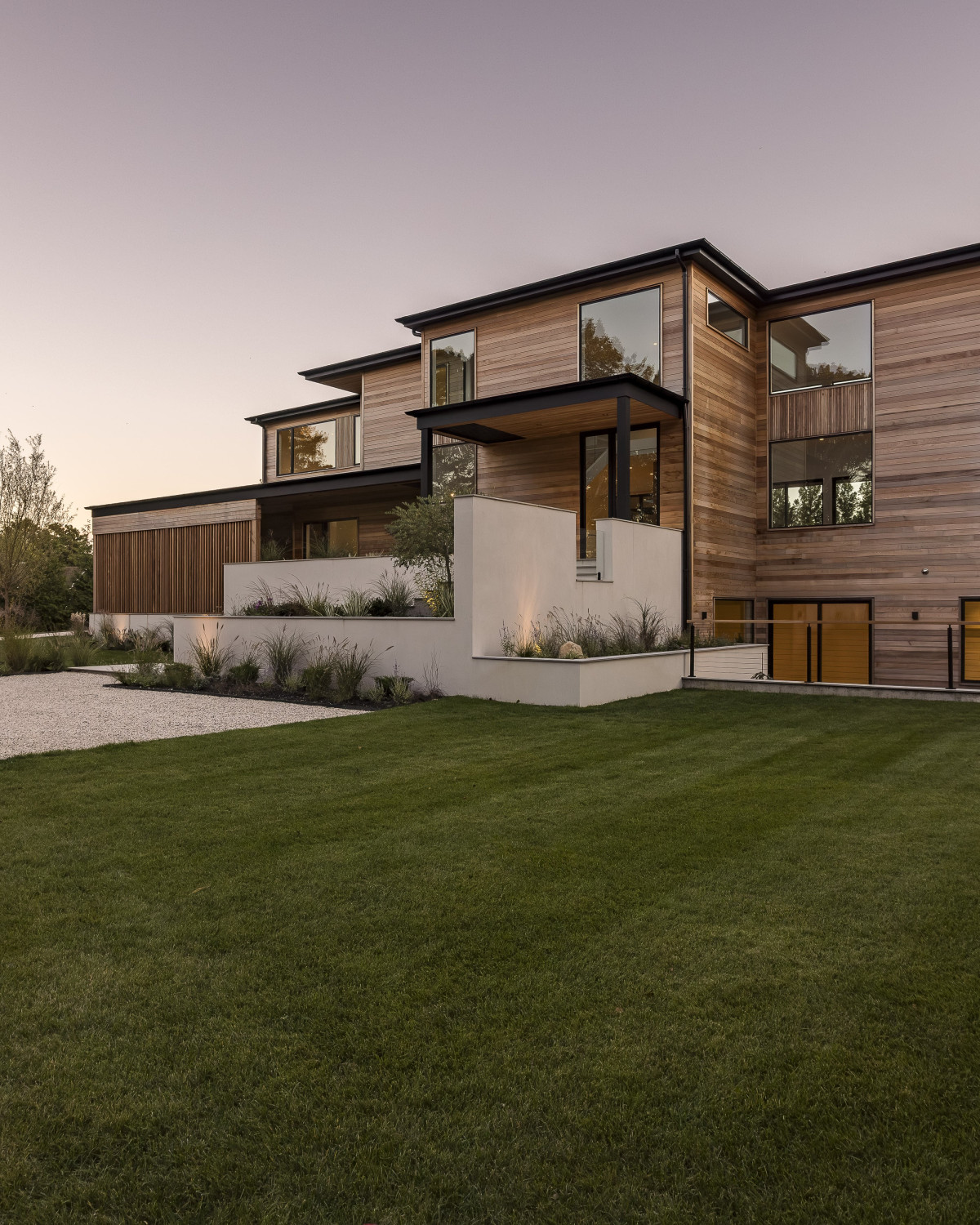 Wśród rozwiązań, które zwracają szczególną uwagę w posiadłości, jest dwukondygnacyjna strefa wejściowa z otwartą, ażurową klatką schodową, która z kolei prowadzi wzrok w kierunku rozległego ogrodu i basenu. Ważnym elementem są też panoramiczne okna, które nie tylko oświetlają wnętrza, ale niejako zacierają granicę między wnętrzem a zewnętrzem, wpuszczając zieleń do środka.