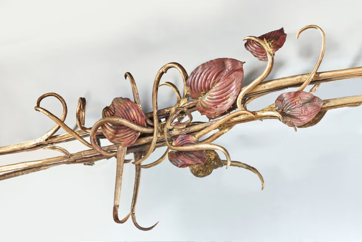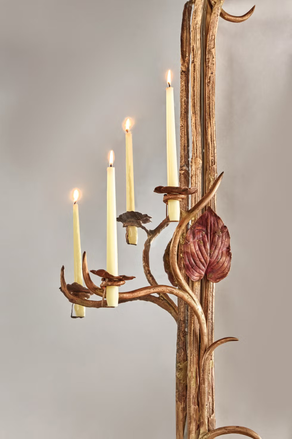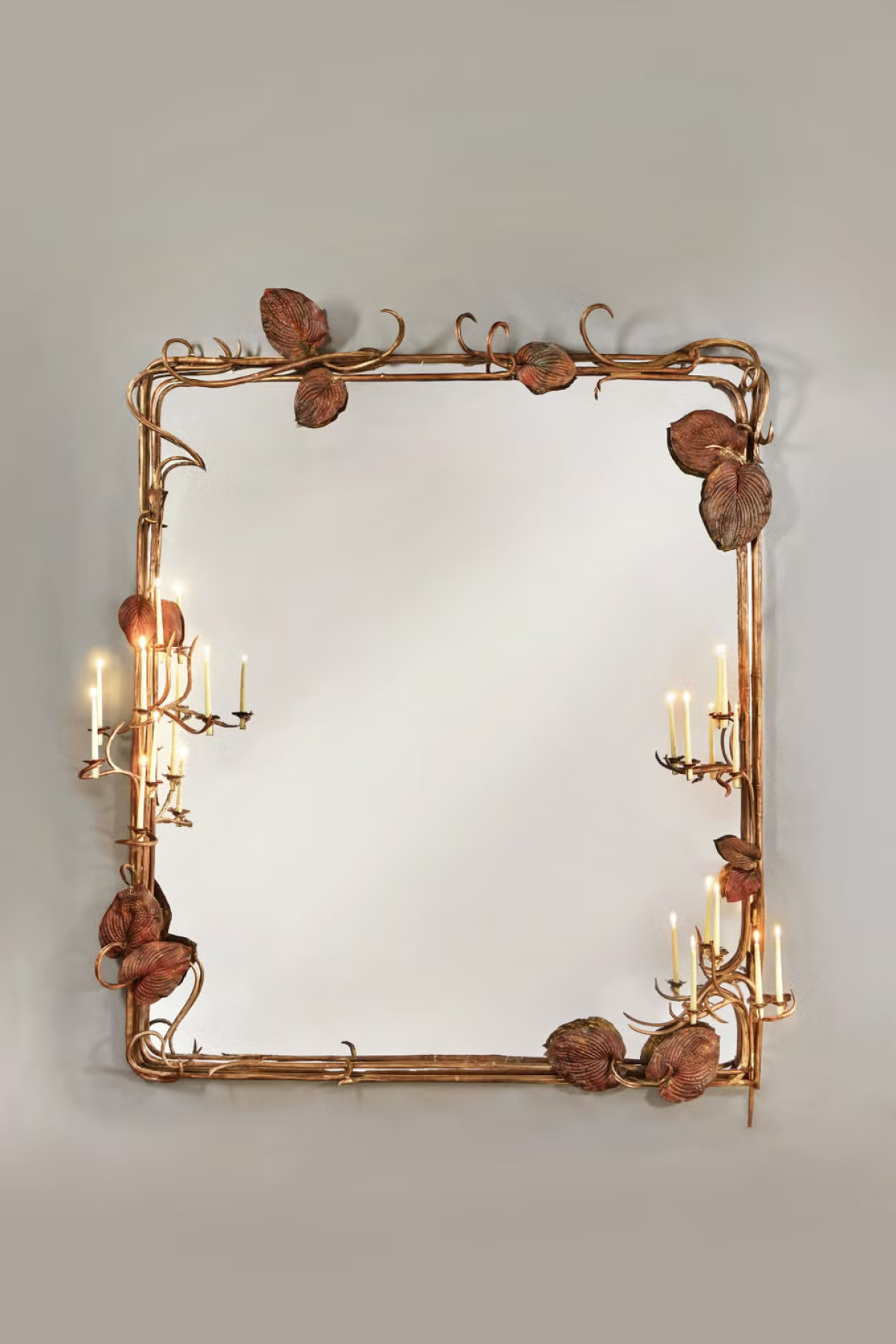 Każde z 15 luster oprawiono w ramy z pozłacanego brązu i galwanizowanej miedzi. Ich kształt, przypominający splecione, wijące się gałęzie, ozdobiono odlewanymi liśćmi zebranymi przez projektantkę w jej przydomowym ogrodzie. Zamontowane po bokach trzech luster świeczniki odbijają światło, tworząc jednocześnie ciepłą, migoczącą poświatę.