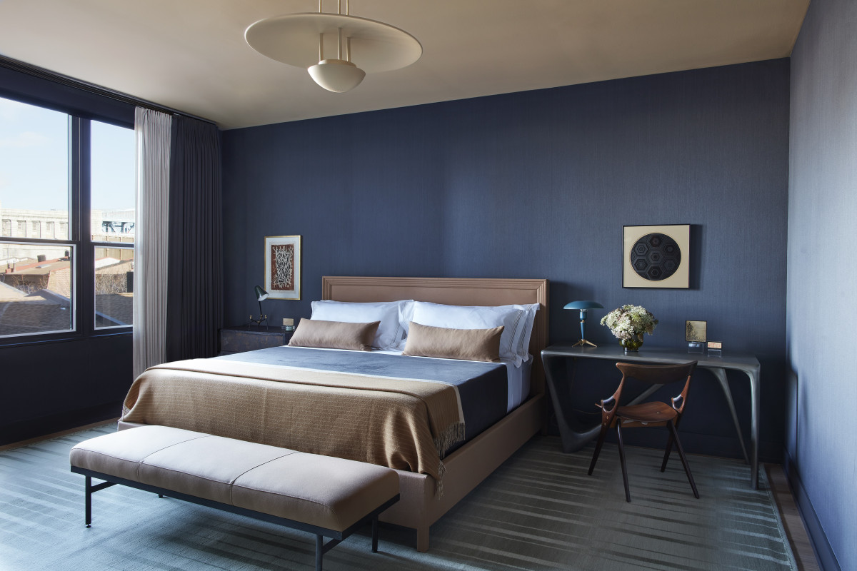 Kluczowym elementem pracy projektowej było stworzenie gościnnego azylu dla ukochanych sióstr właściciela. Za tylną, wykonaną na zamówienie, łóżkową tapicerką, wznoszą się ciężkie kamienne panele autorstwa francuskiego artysty Wilfreda Rouissi. Ta kontrastująca mieszanka materiałów nadaje przestrzeni głębi i charakteru, tworząc efekt warstwowości, w którym struktury twarde i miękkie spotykają się obok siebie.