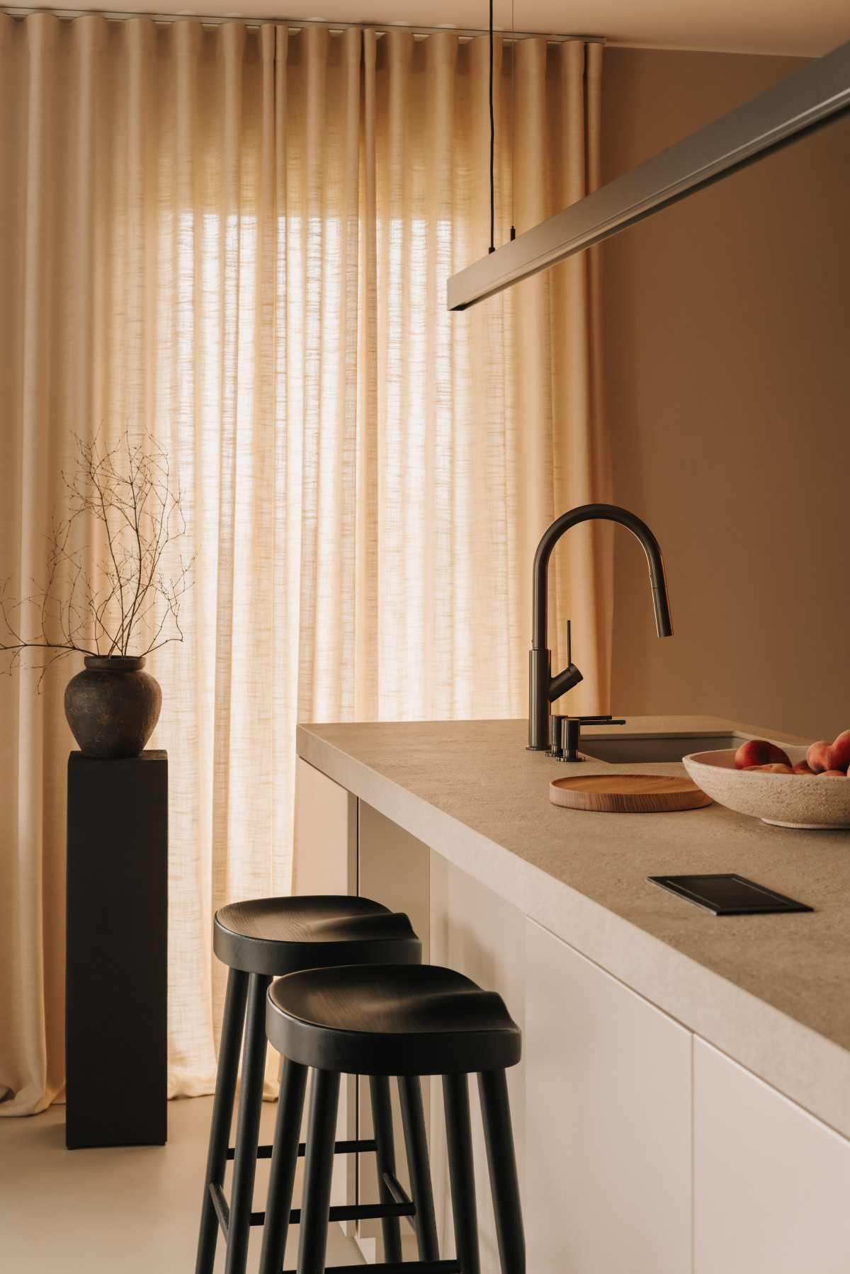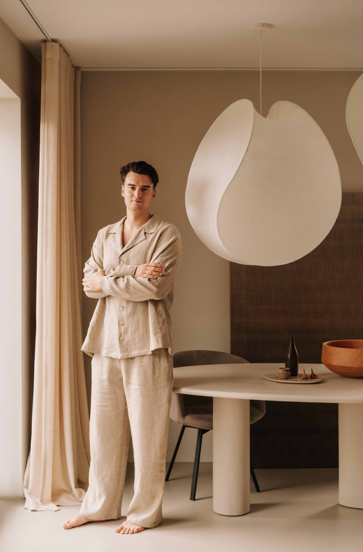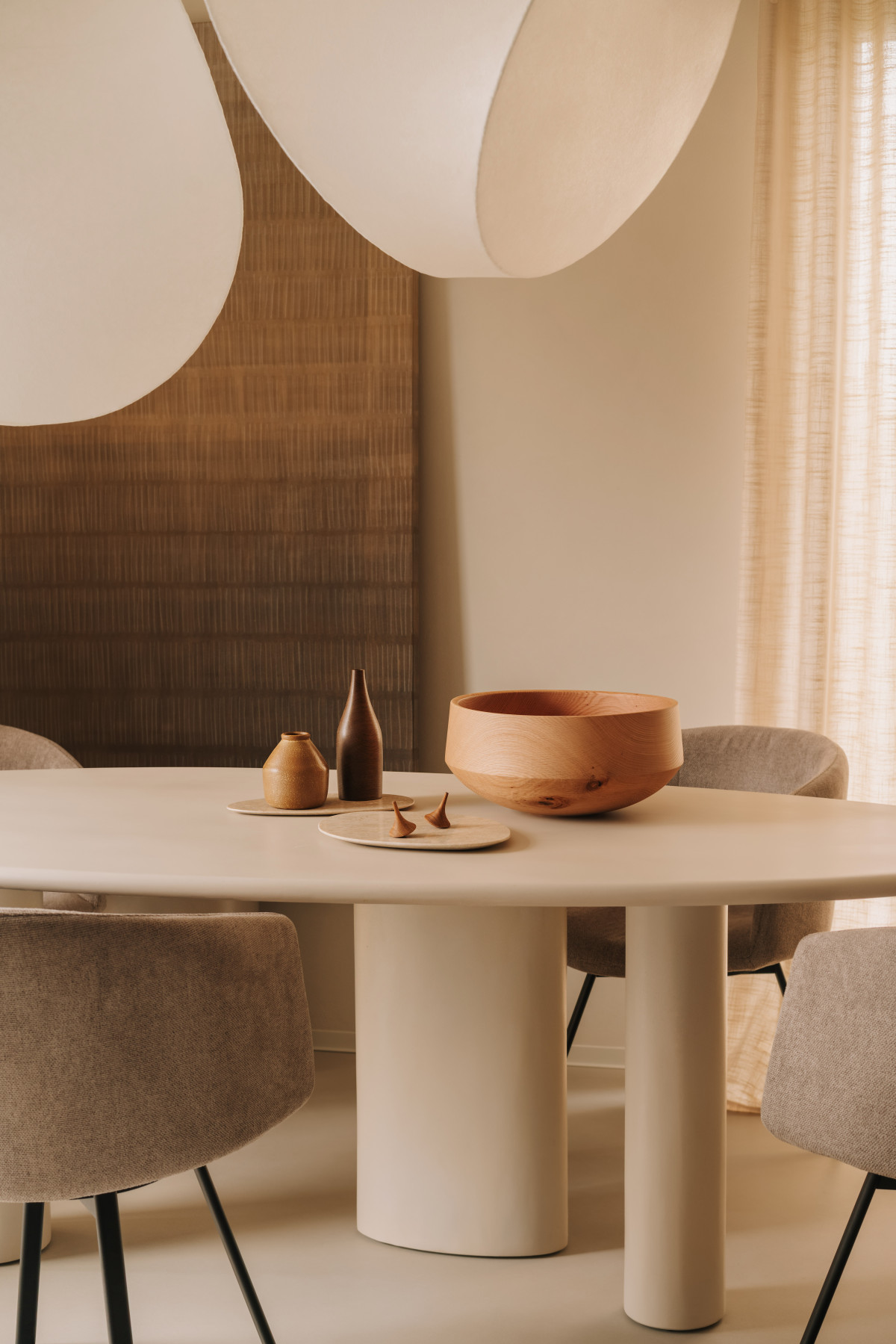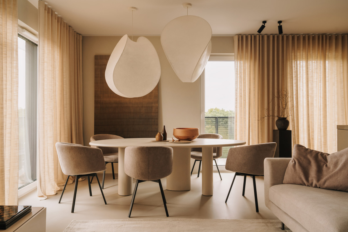 Centralnym punktem strefy dziennej jest rzeźbiarska kompozycja lamp z włókna szklanego zawieszonych nad stołem o miękkiej, obłej linii. Stół wykonany w hiszpańskiej manufakturze i wykończony mikrocementem równoważy eteryczność oświetlenia swoją solidną, ziemistą formą. Delikatnie przesunięte względem siebie bryły lamp tworzą dynamiczną grę światła i cienia.