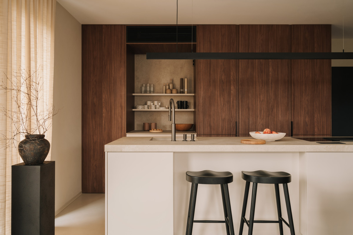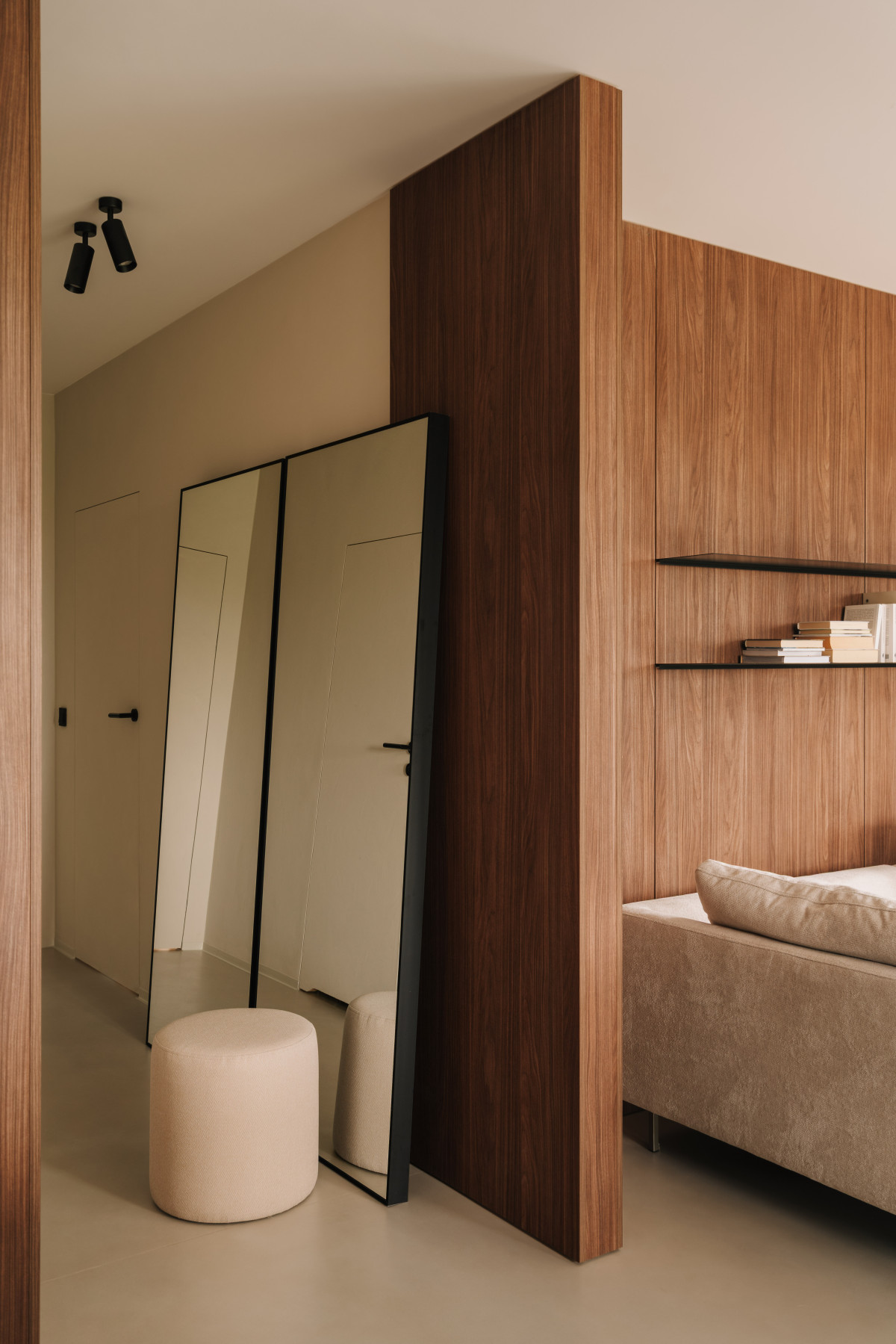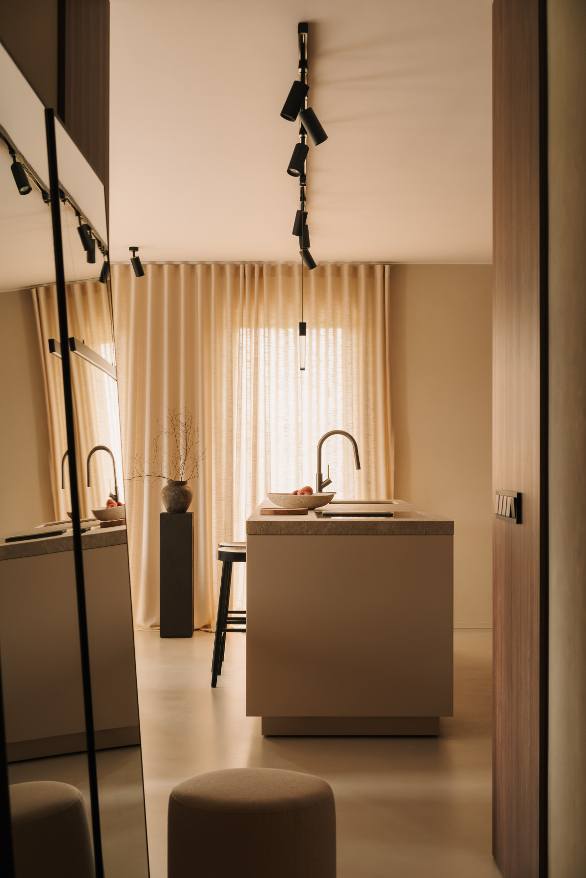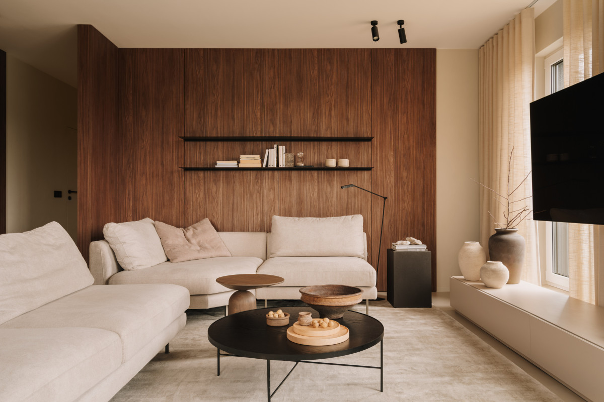 Bazą aranżacji są naturalne, wyciszone materiały. Matowy mikrocement na podłogach wprowadza spójność i wizualną lekkość. Jego bezspoinowa powierzchnia potęguje wrażenie płynności, stanowiąc spokojne tło dla drewnianej zabudowy. Ściany wykończono farbą strukturalną, której delikatna faktura reaguje na zmieniające się w ciągu dnia światło. Zestawienie gładkiego mikrocementu z subtelnie chropowatymi powierzchniami pomogło zbudować sensualny, niemal „dotykowy” charakter przestrzeni.
