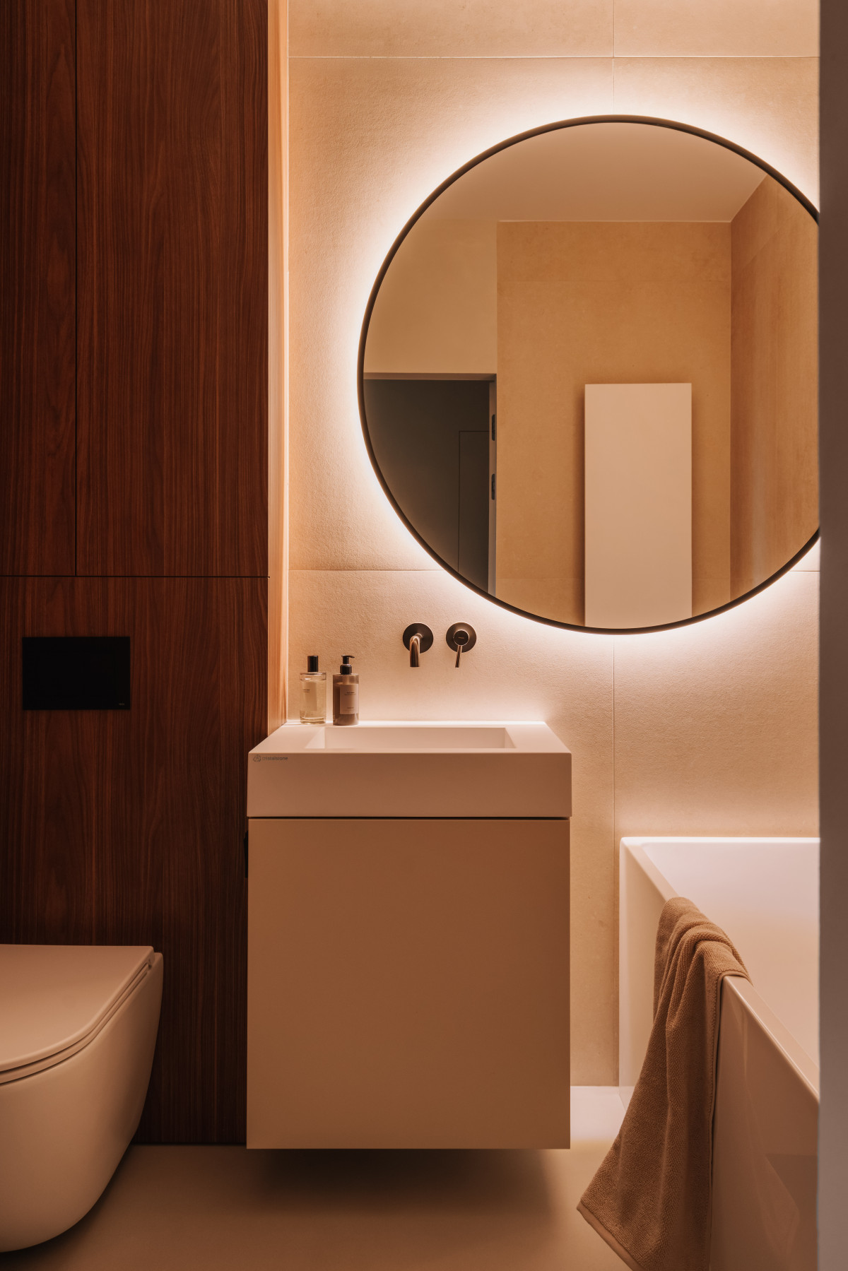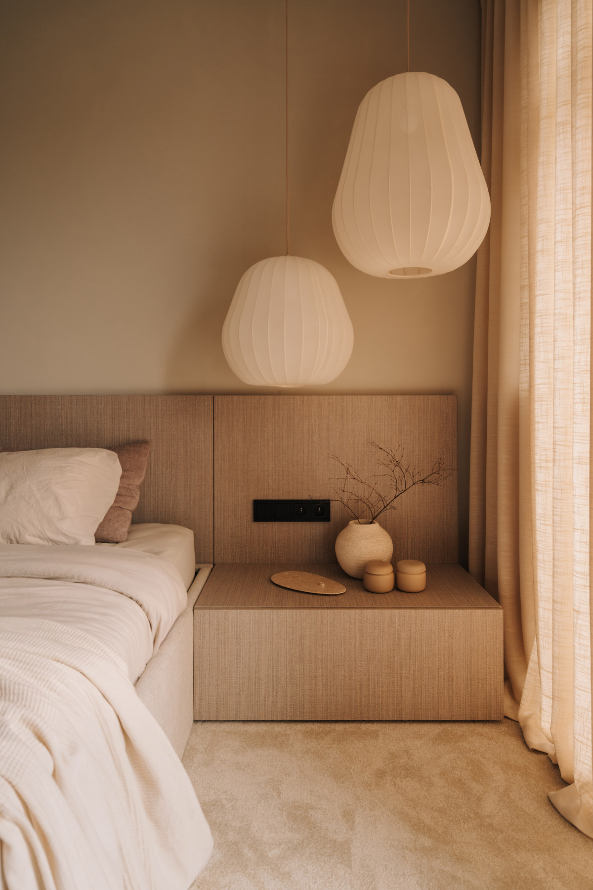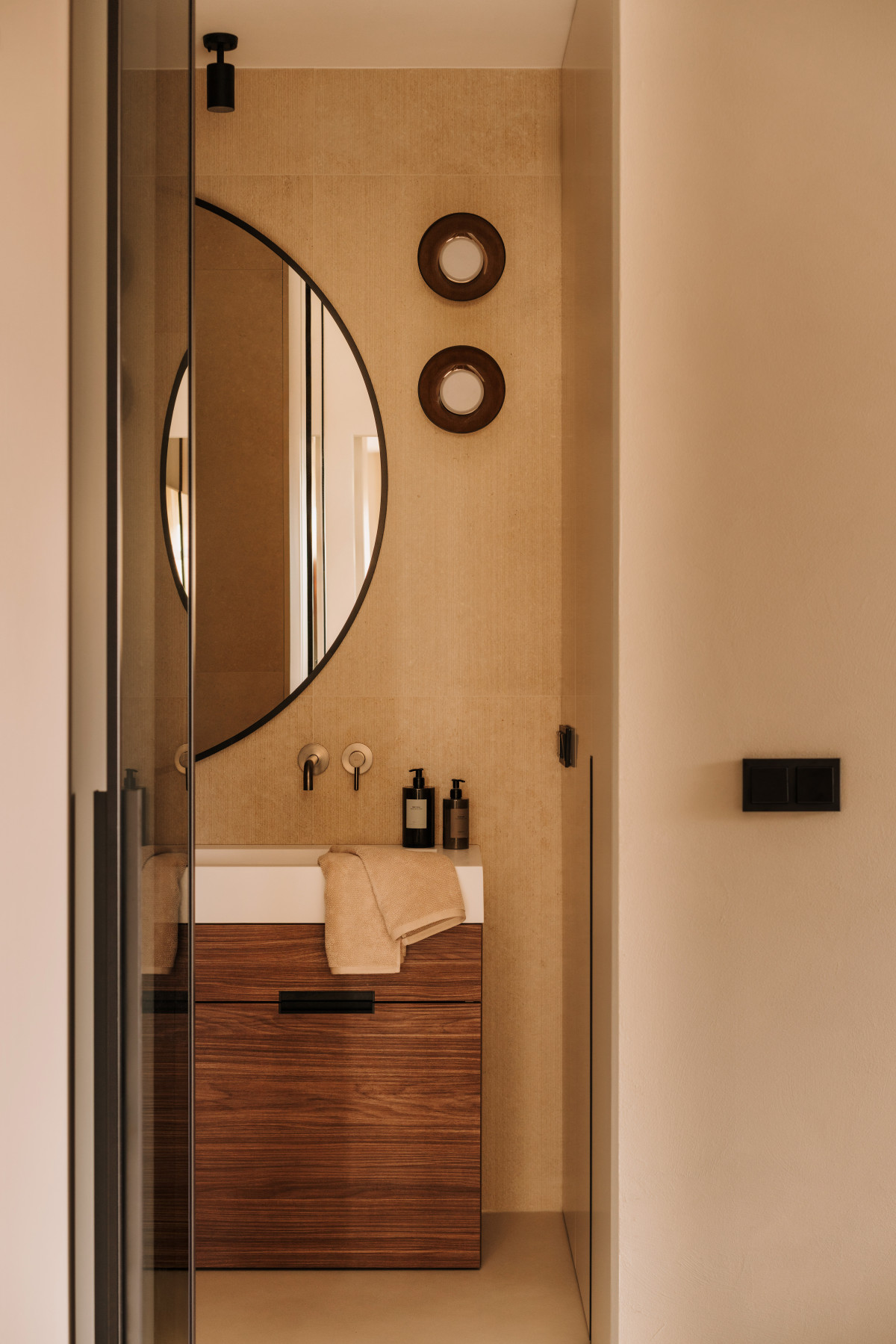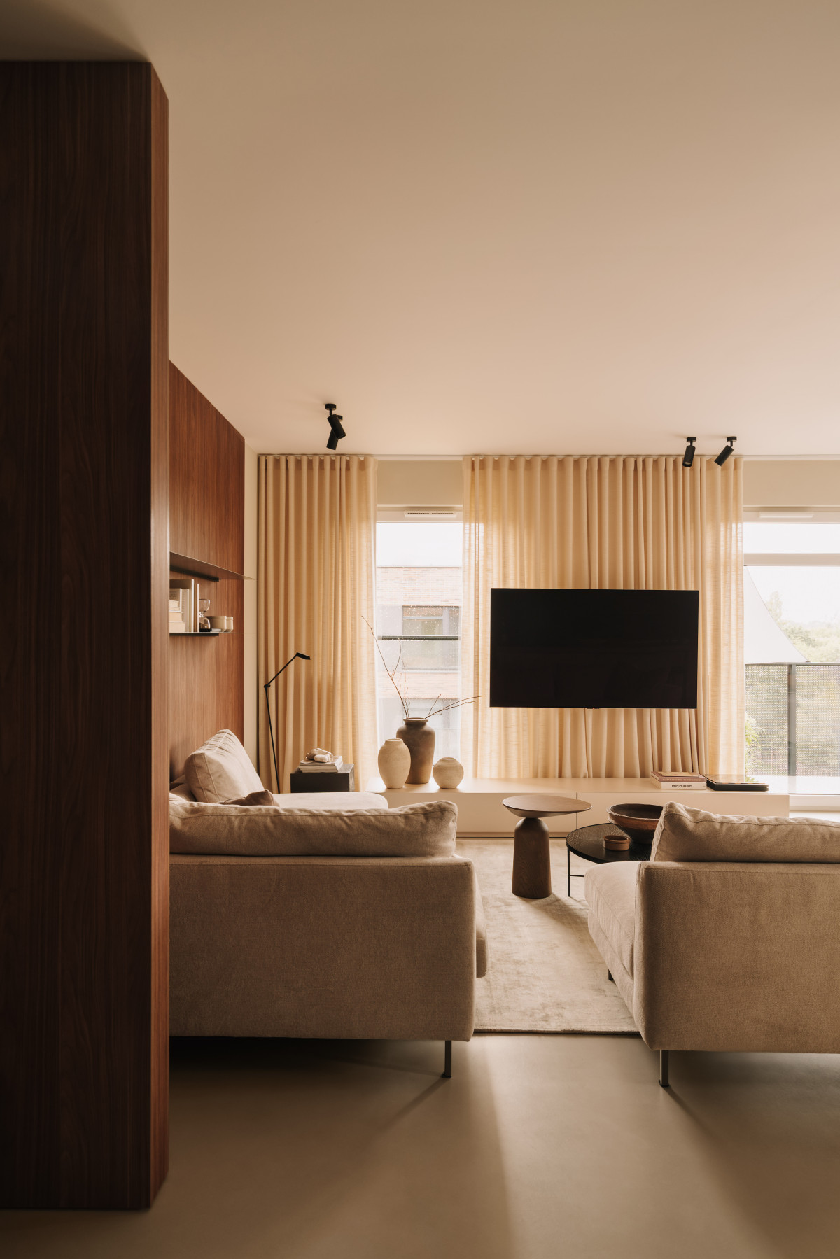 Bazą aranżacji są naturalne, wyciszone materiały. Matowy mikrocement na podłogach wprowadza spójność i wizualną lekkość. Jego bezspoinowa powierzchnia potęguje wrażenie płynności, stanowiąc spokojne tło dla drewnianej zabudowy. Ściany wykończono farbą strukturalną, której delikatna faktura reaguje na zmieniające się w ciągu dnia światło. Zestawienie gładkiego mikrocementu z subtelnie chropowatymi powierzchniami pomogło zbudować sensualny, niemal „dotykowy” charakter przestrzeni.