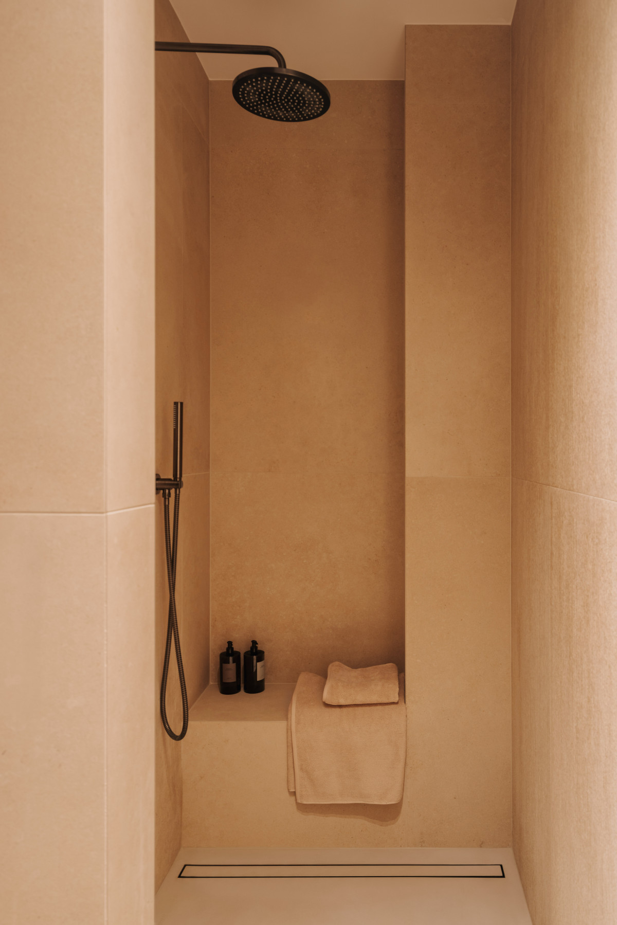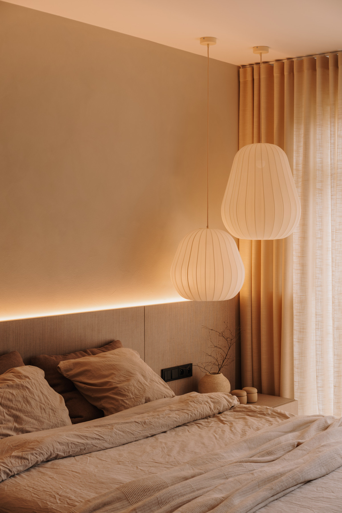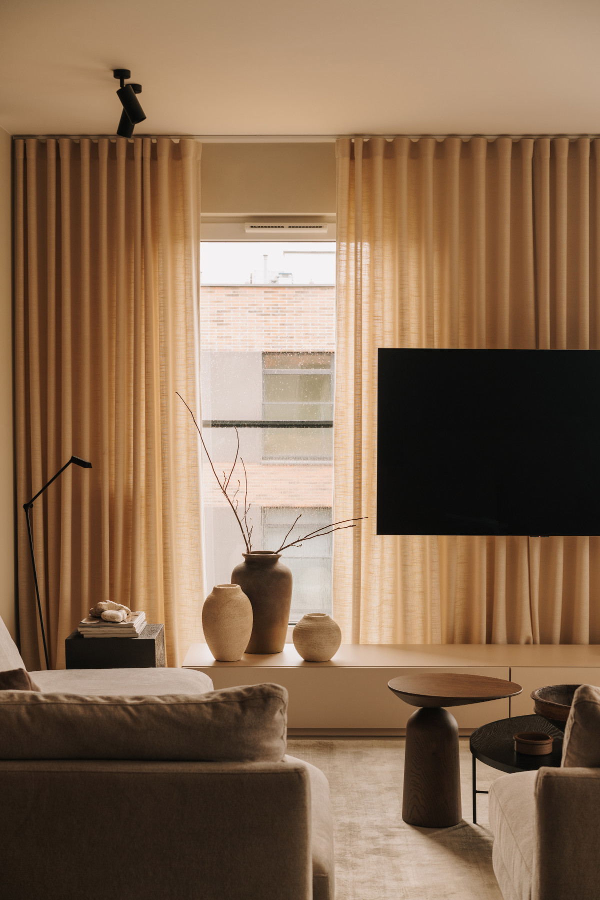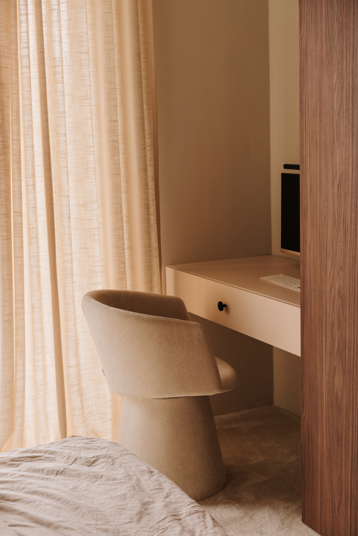 Bazą aranżacji są naturalne, wyciszone materiały. Matowy mikrocement na podłogach wprowadza spójność i wizualną lekkość. Jego bezspoinowa powierzchnia potęguje wrażenie płynności, stanowiąc spokojne tło dla drewnianej zabudowy. Ściany wykończono farbą strukturalną, której delikatna faktura reaguje na zmieniające się w ciągu dnia światło. Zestawienie gładkiego mikrocementu z subtelnie chropowatymi powierzchniami pomogło zbudować sensualny, niemal „dotykowy” charakter przestrzeni.