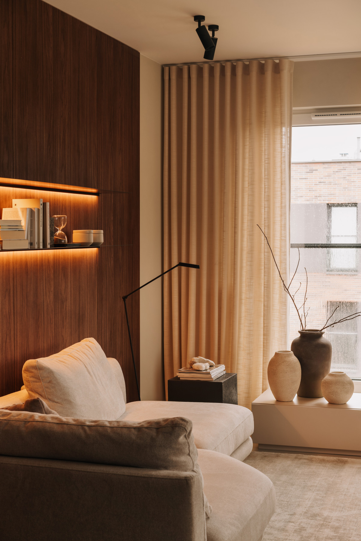 Projekt opiera się na spójności i konsekwencji, widocznej nie tylko w warstwie estetycznej, ale i funkcjonalnej. Instalacje klimatyzacyjne oraz systemy wentylacyjne zostały dyskretnie wkomponowane w architekturę, podobnie jak sprzęty AGD, które ukryto w zabudowach. Szafy i schowki nie są dodatkiem, lecz integralną częścią kompozycji.