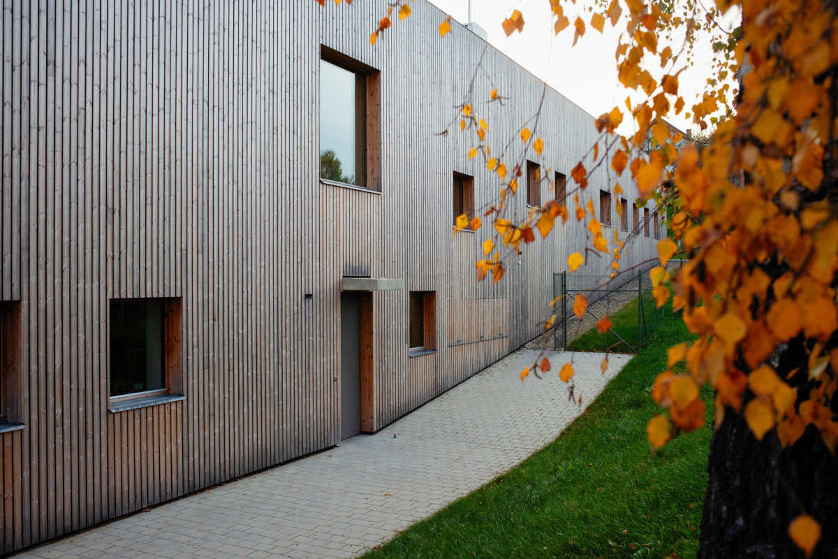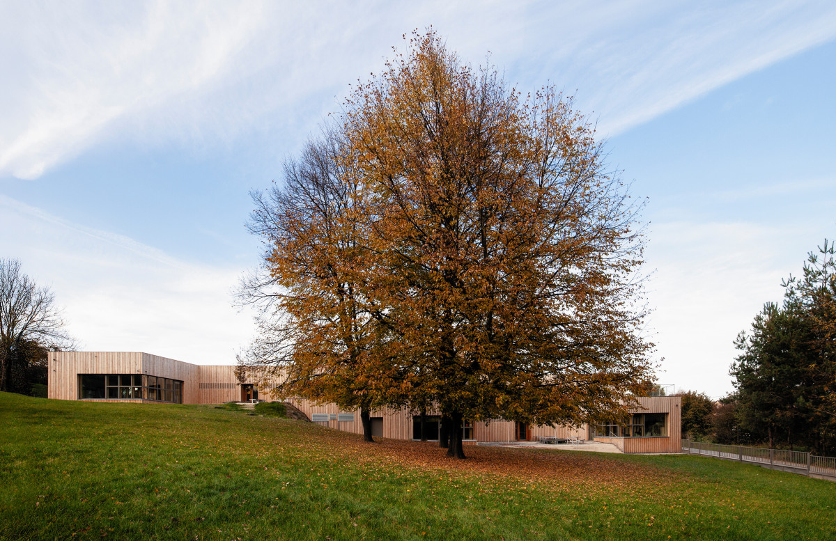 Bryła przedszkola, subtelnie osadzona w stoku i zanurzona w istniejącym krajobrazie, wtapia się w otoczenie bez sprzeciwu, dostosowując się do niego, zamiast weń ingerować. Elewacja, obłożona deskami sosnowymi harmonijnie komponuje się z otoczeniem, raz wyłaniając się, raz znikając wśród dorodnych drzew.