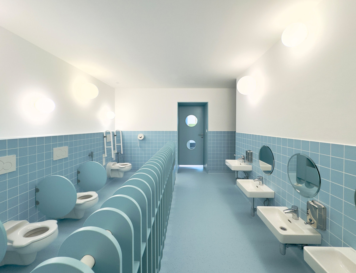 Co więcej, wszystkie sale mają przypisane poszczególne kolory – co ułatwia dzieciom intuicyjne poruszanie się po tych przestrzeniach. Taki kolor pojawia się wtedy również w należącej do danej sali szatni, łazienkach i strefach wydawania posiłków. Same sale pozostają neutralne kolorystycznie – przeważa tu biel, sklejka brzozowa i polerowany beton.