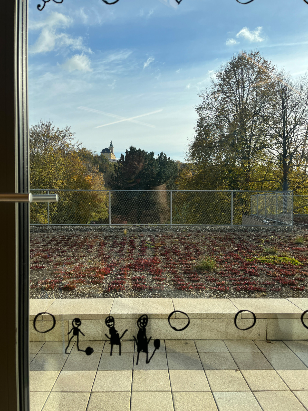 Na piętrze znajduje się przestronna, wypełniona naturalnym światłem sala, przeznaczona do aktywności ruchowych oraz różnego rodzaju spotkań. Stąd roztacza się widok na okolicę, w tym historyczne centrum Fulneku oraz zabytkowy zamek. Taras z rozległym zielonym dachem, który również widać z okien sali, przestrzennie i wizualnie łączy się z otaczającym krajobrazem.