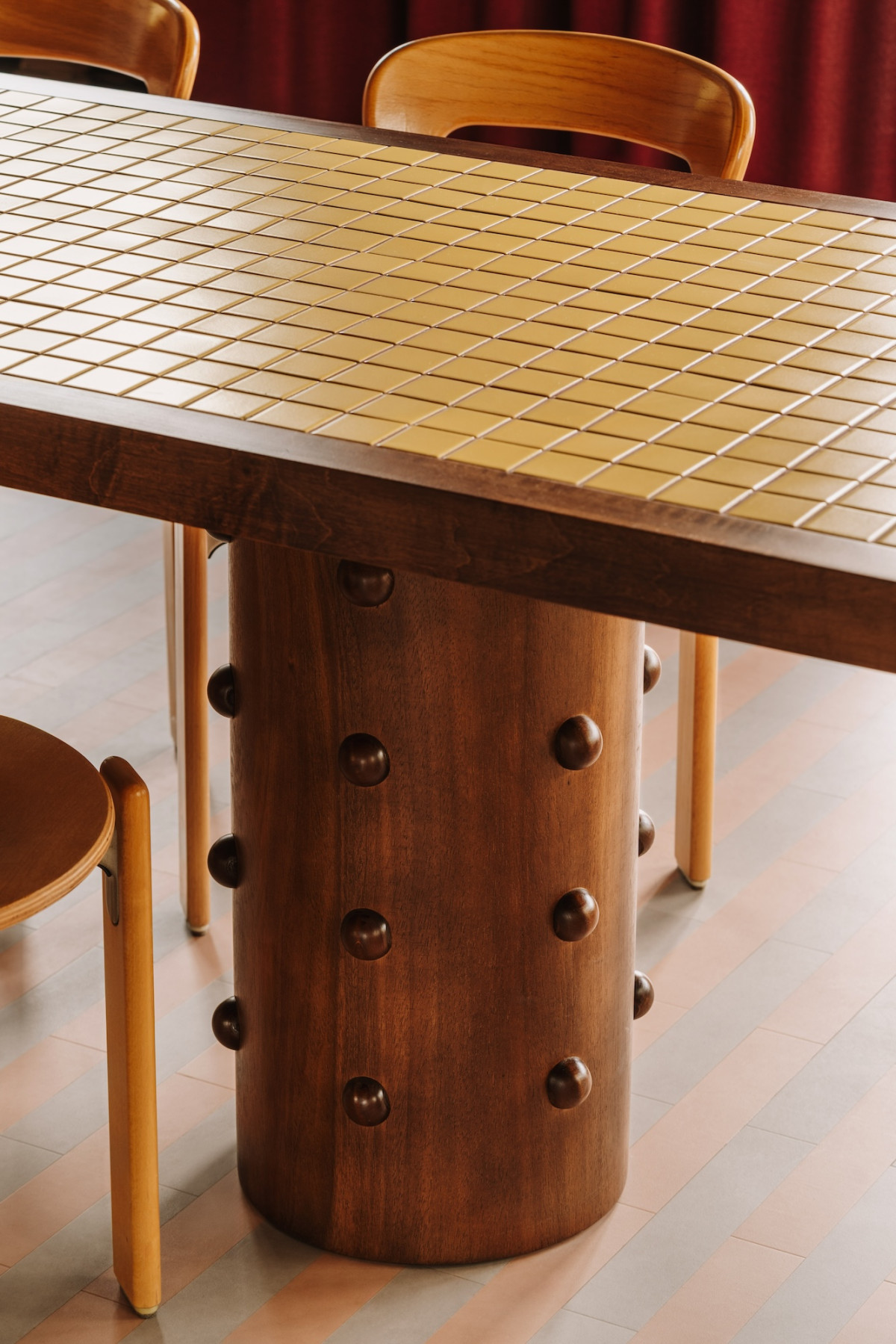 Dwa stoły wspólne są centralnymi elementami – prostokątny z mozaikowym blatem i drewnianą nogą z detalem oraz okrągły, którego blat przypomina herbatnik. Ten ostatni nawiązuje do wykrawanych form makaronów, podobnie jak dekoracyjne lustro o identycznym kształcie i ponad dwumetrowej średnicy, które optycznie powiększa przestrzeń.