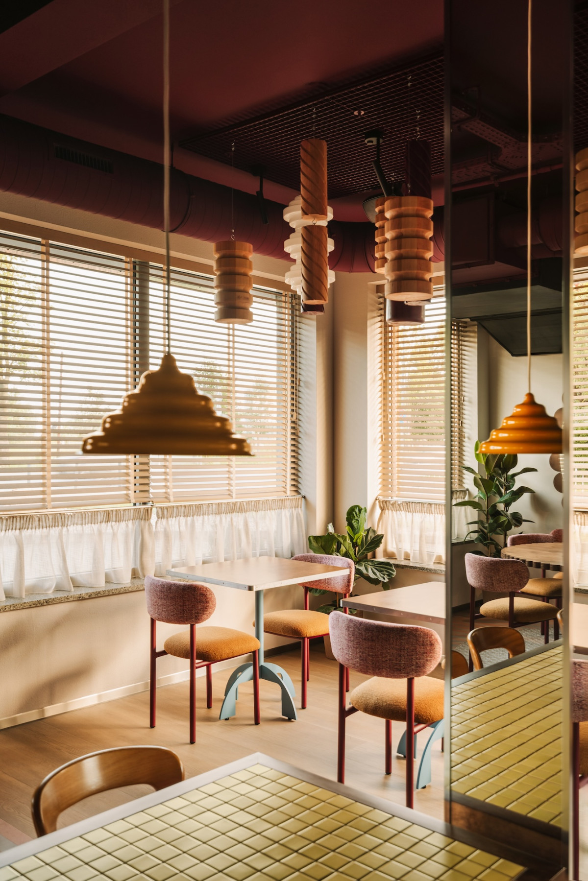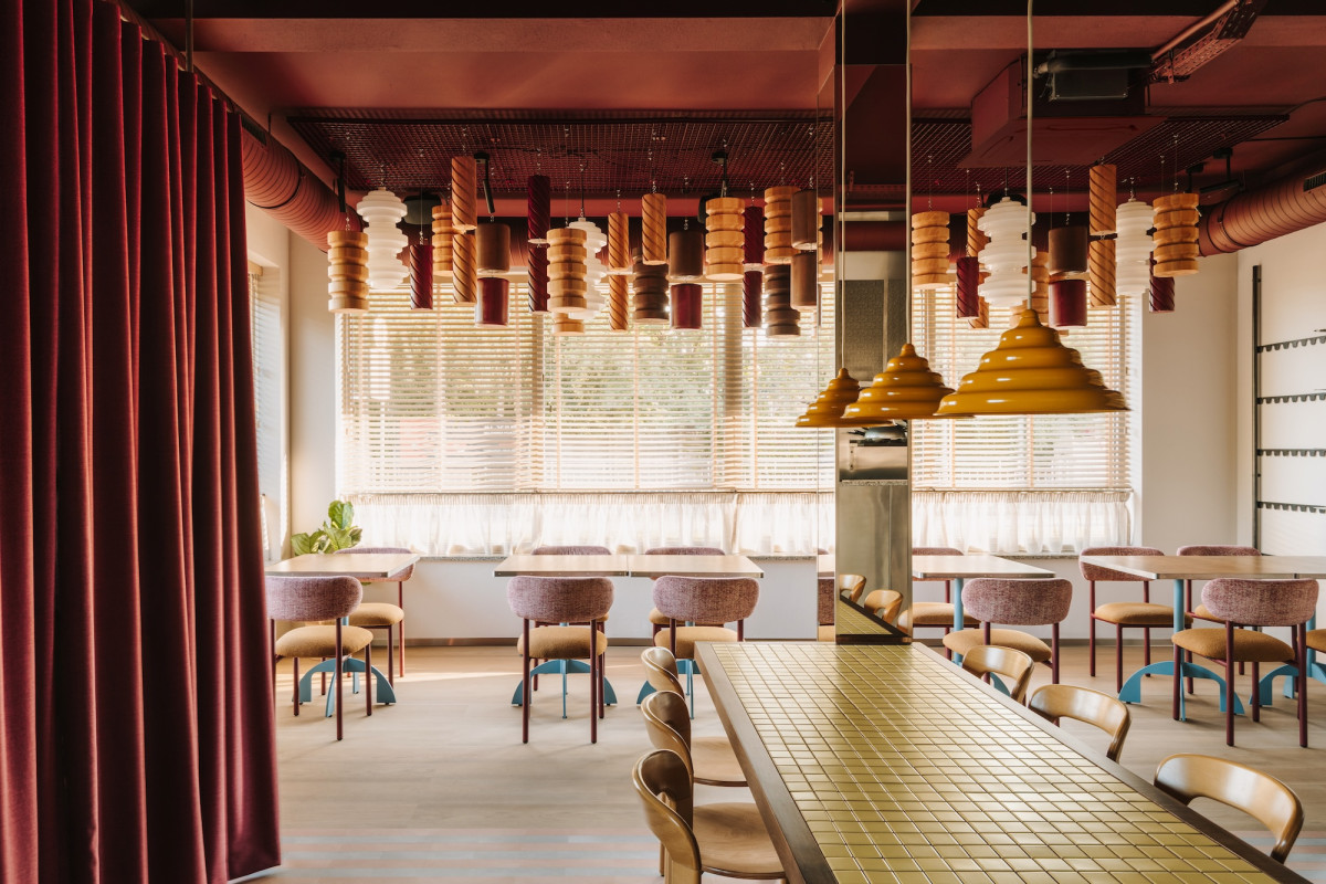 Prawie wszystkie elementy wyposażenia zostały zaprojektowane i wykonane na zamówienie – od stołów, przez zabudowę kuchenną i barową, po regały oraz autorską instalację oświetleniową inspirowaną kształtami makaronów. Wśród gotowych elementów znalazły się krzesła marki Satelliet – zestawione z nieoczywistymi tkaninami, które wprowadzają do wnętrza szczyptę nowoczesnej nostalgii oraz klasyczne krzesła marki HAY.