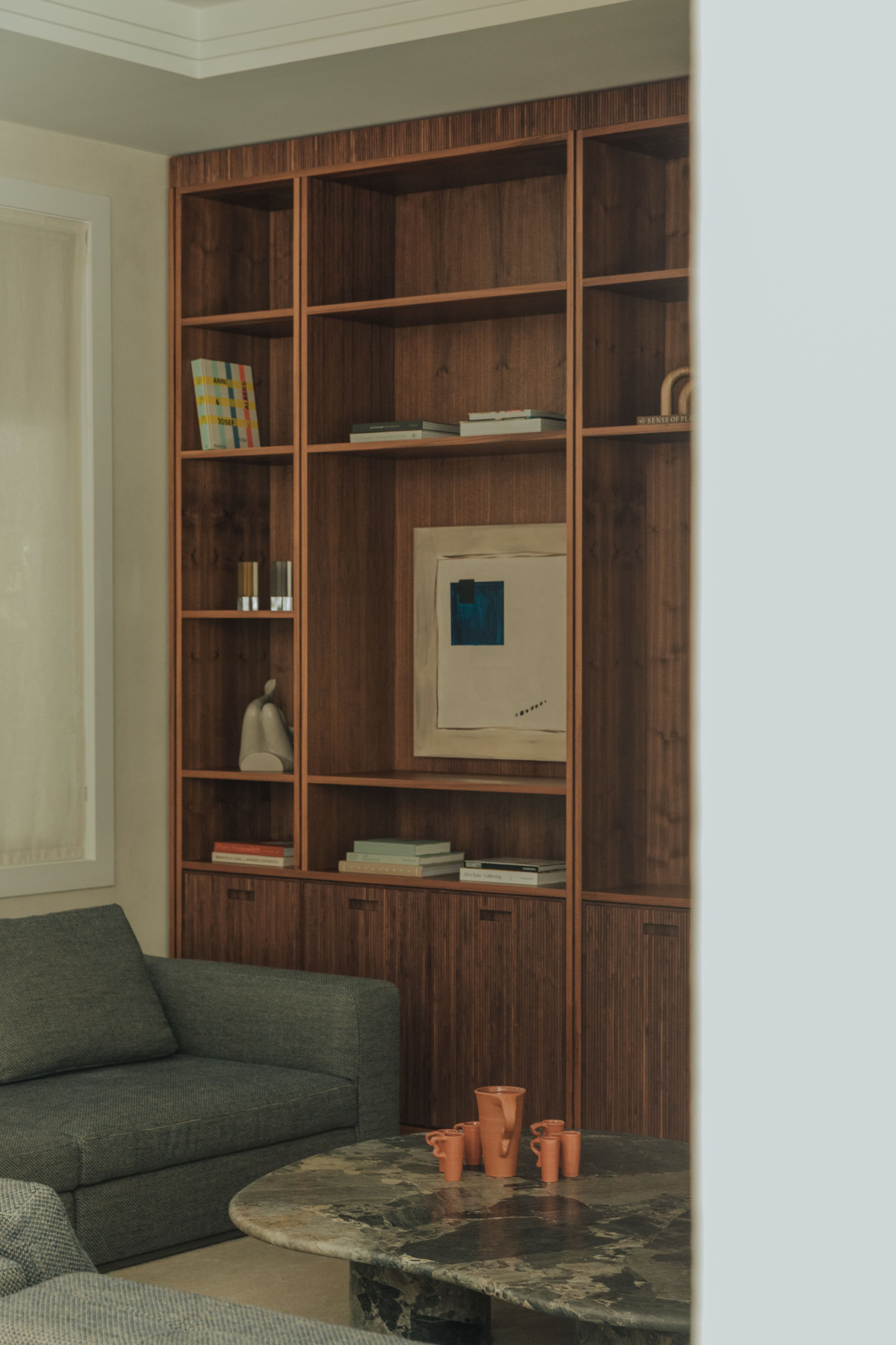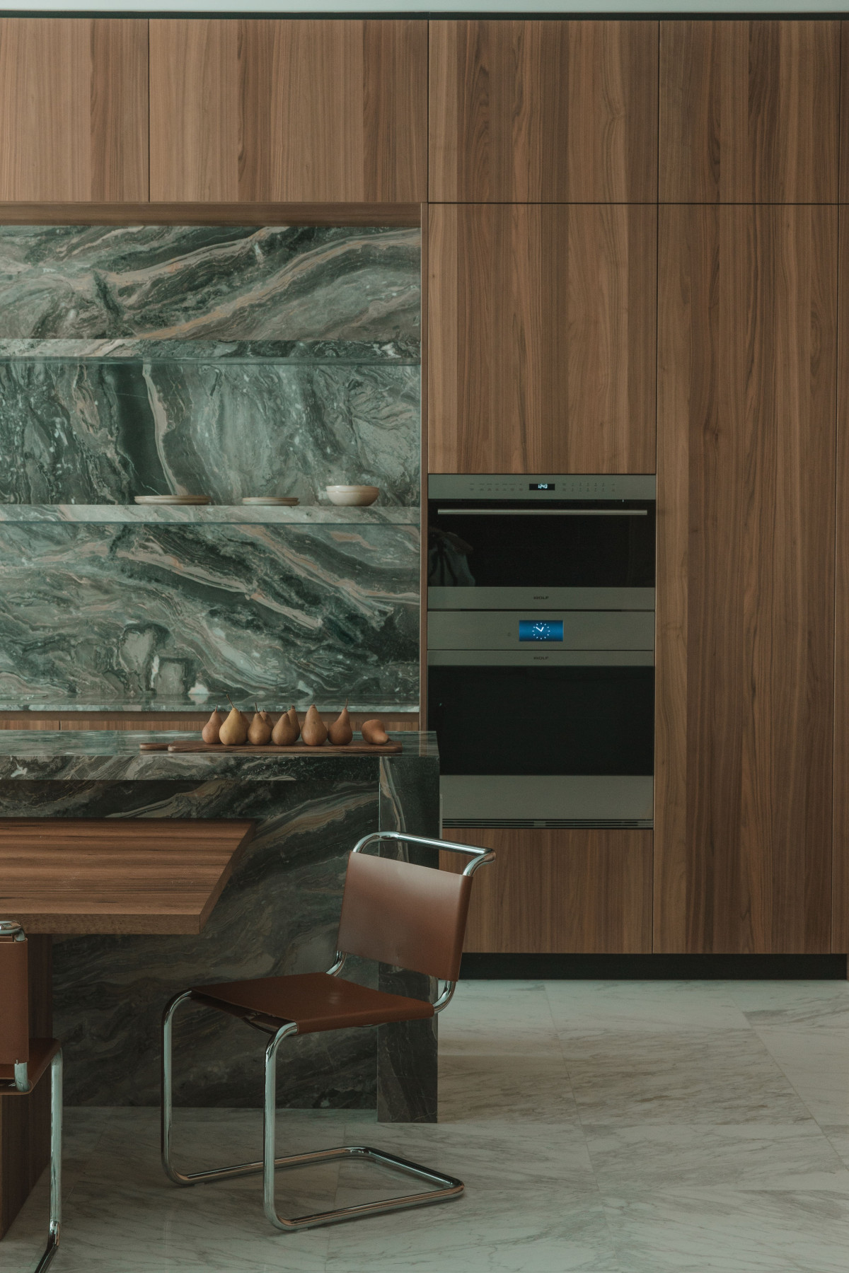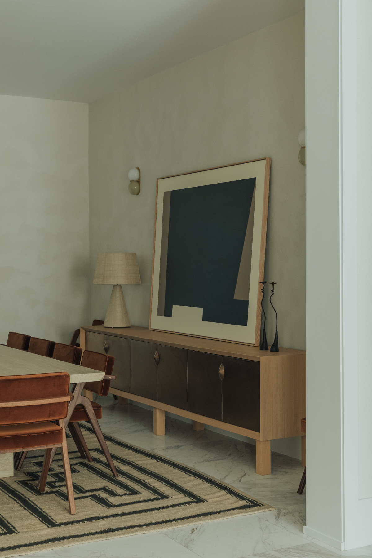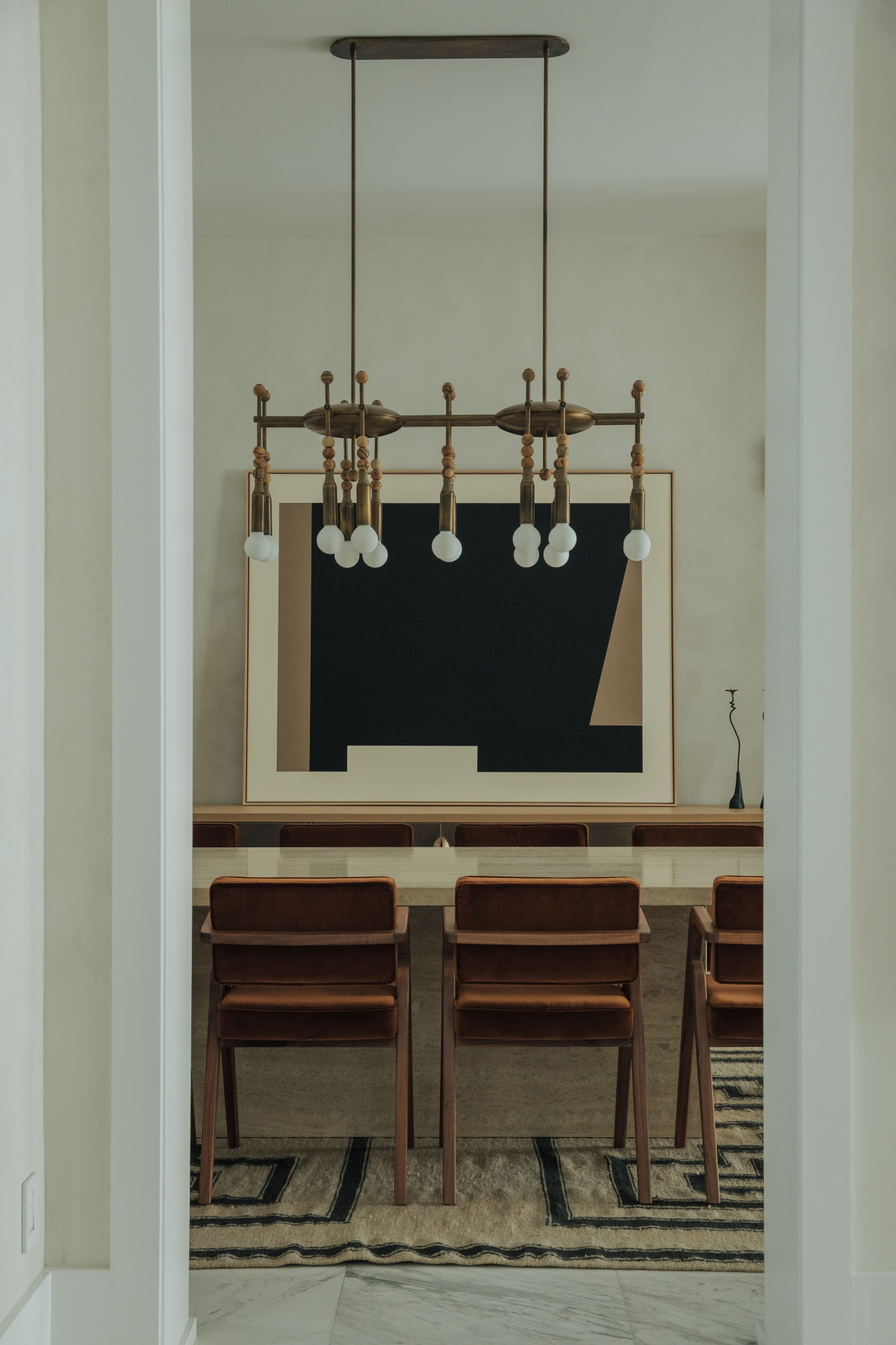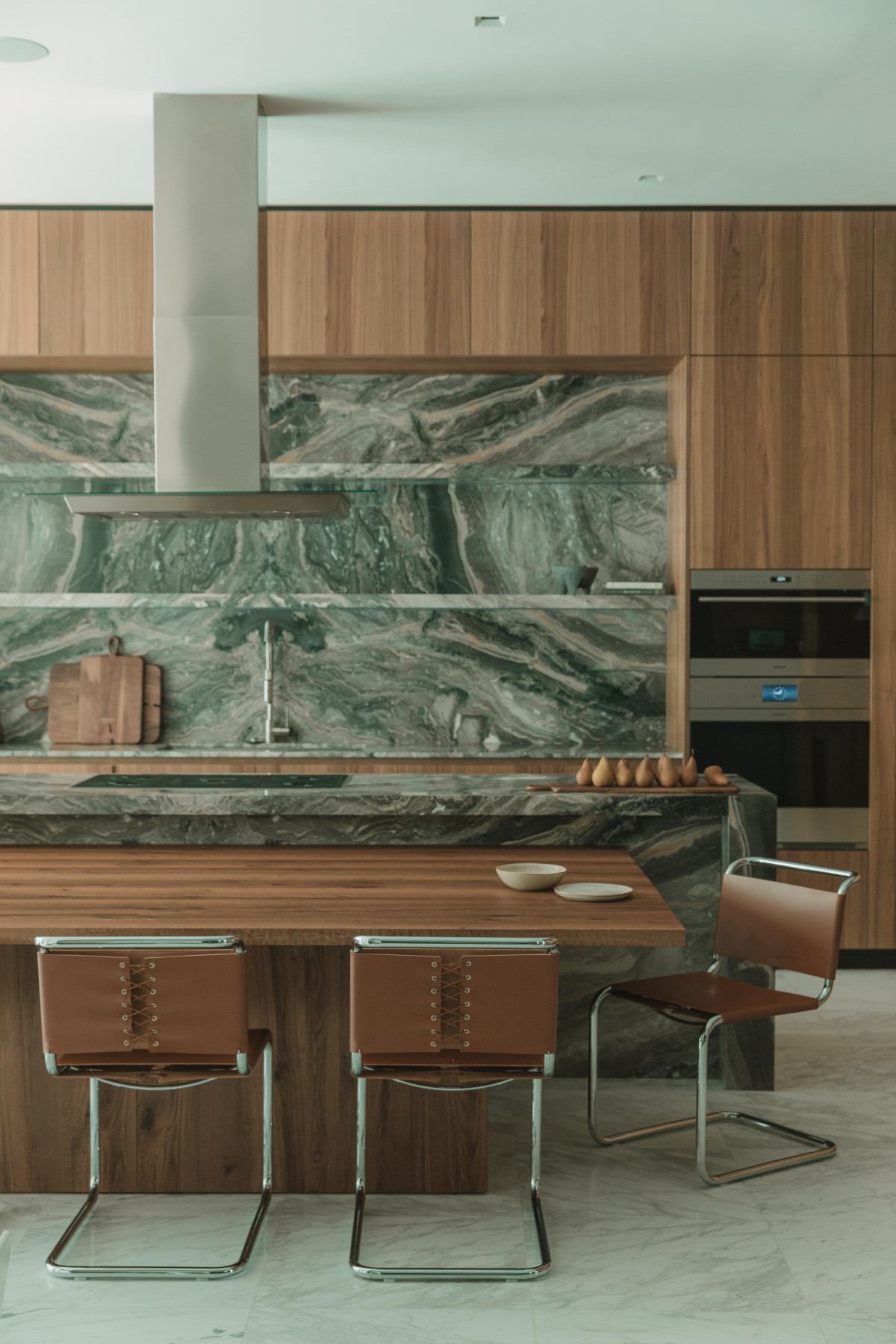 Nie można też pominąć kuchni, w której króluje duet drewna i zielonego kamienia o dynamicznym, niezwykle efektownym wzorze. Do kamiennej wyspy dosunięto drewniany stół, któremu towarzyszą kultowe krzesła Spoleto zaprojektowane na początku lat 70. W jadalni, stół z kremowego kamienia wzbogacają meksykańskie krzesła mid-century projektu Eugenio Escudero.