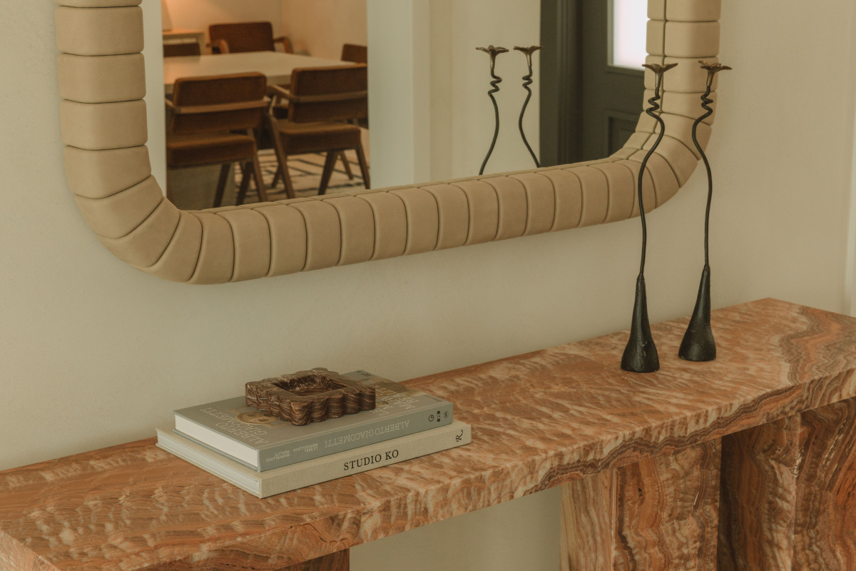 Większość elementów wyposażenia zostało wykonanych na zamówienie, specjalnie dla tego wnętrza. W strefie wejścia uwagę zwraca m.in. duże lustro obite skórą, któremu towarzyszy elegancka konsola z onyksu.