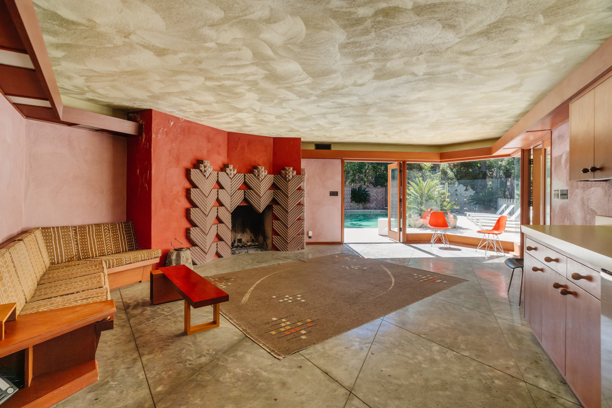 Pawilon wypoczynkowy przy basenie. Uwagę zwracają szewronowe detale wokół kominka, takie same jak te, które Frank Lloyd Wright junior wykorzystał w projekcie głównej rezydencji. Zdjęcie: Neue Focus