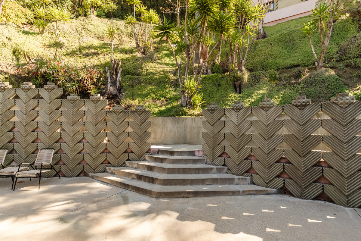 Posiadłość Lyncha zajmuje hektarowy teren na jednym ze zboczy Hollywood Hills. Betonowa osłona patia ze zwielokrotnionym motywem szewronu przypomina wzór posadzki ze słynnej Czarnej Chaty w serialu „Miasteczko Twin Peaks”. Zdjęcie: Neue Focus