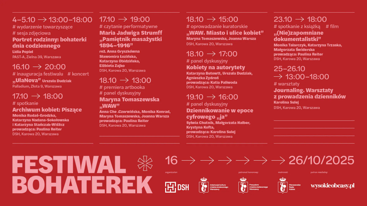 W ramach tegorocznego festiwalu odbędą się m.in. otwarta sesja zdjęciowa z Lidią Popiel, warsztaty z journalingu z Karoliną Sulej, wystawa Maryny Tomaszewskiej i Joanny Warszy, debaty, rozmowy, czytanie performatywne, premiery książkowe i pokazy filmowe. Szczegółowy program festiwalu na stronie Domu Spotkań z Historią, w zakładce Wydarzenia.